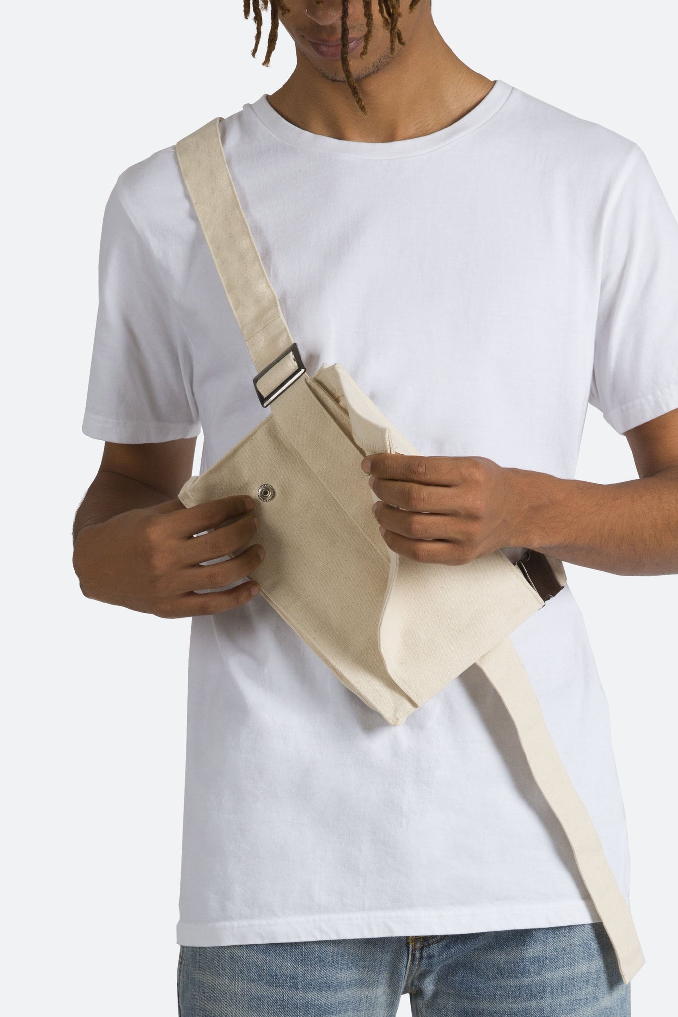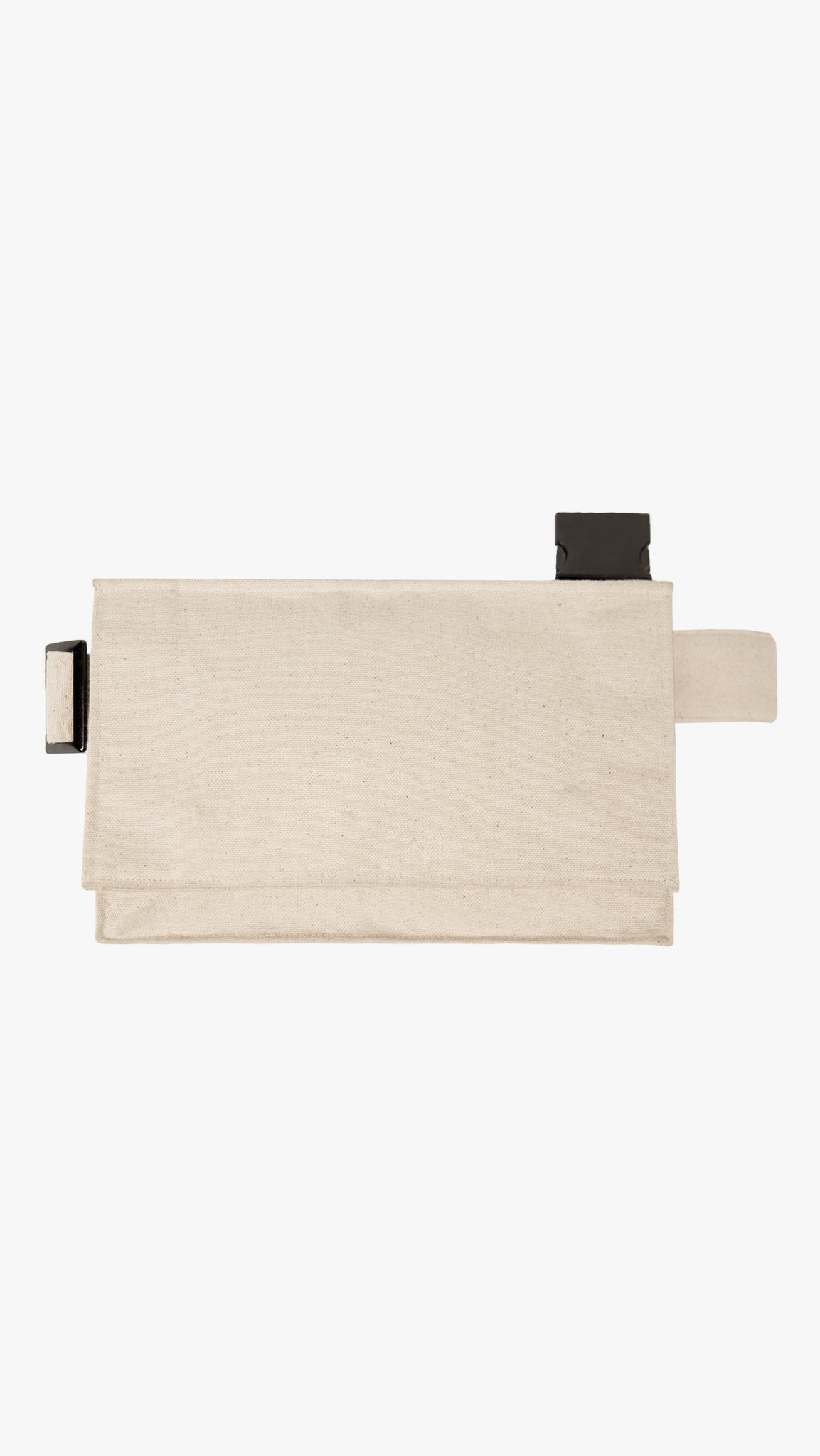 the Basic Shoulder Bag is constructed from cotton twill and features one large compartment that is closed using polished metal snaps and completed with a gunmetal closure on the self fabric strap.