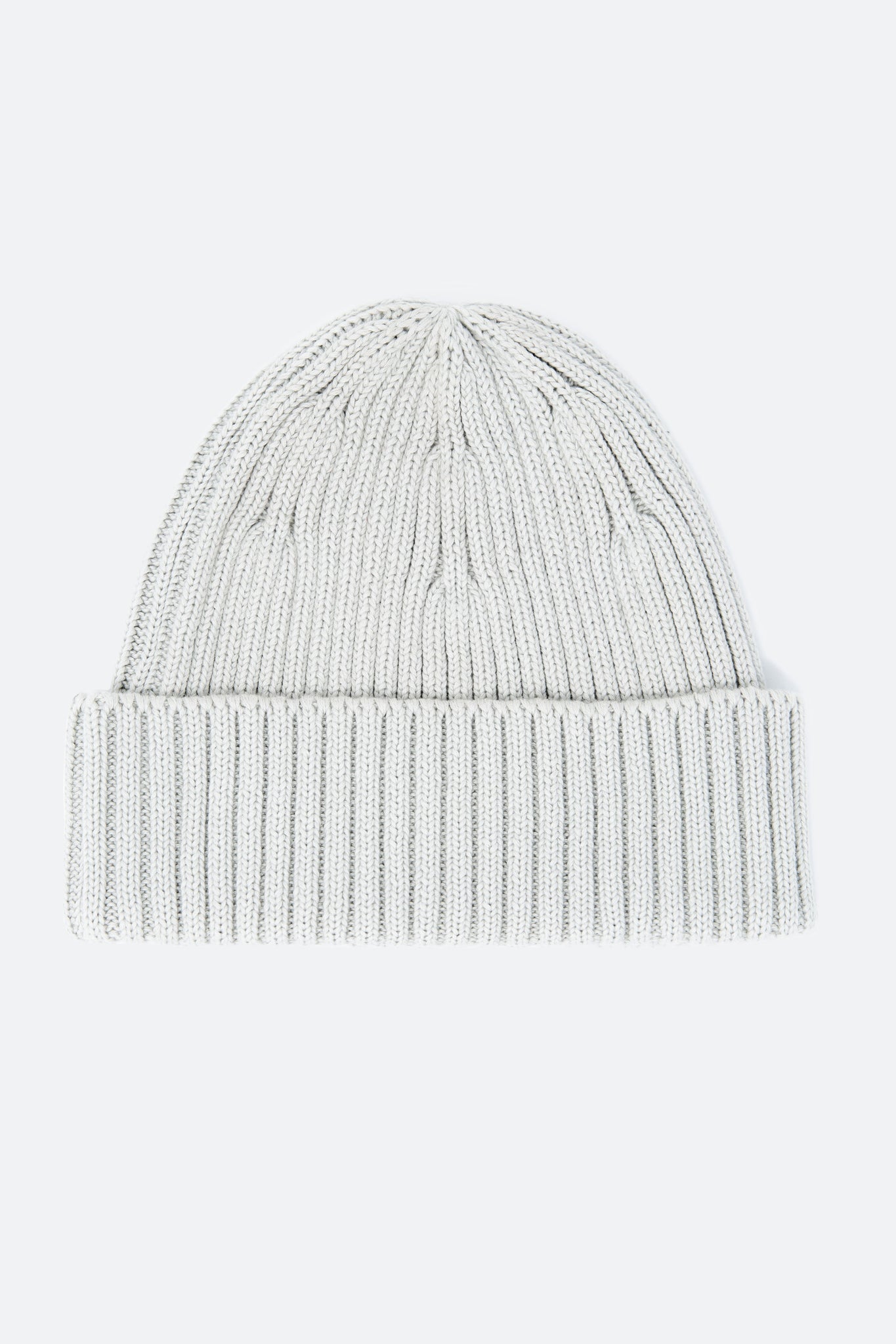the Ribbed Beanie is constructed from cotton and features a ribbed knit.