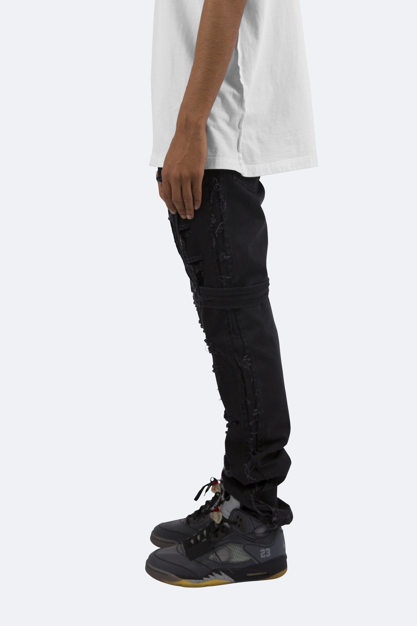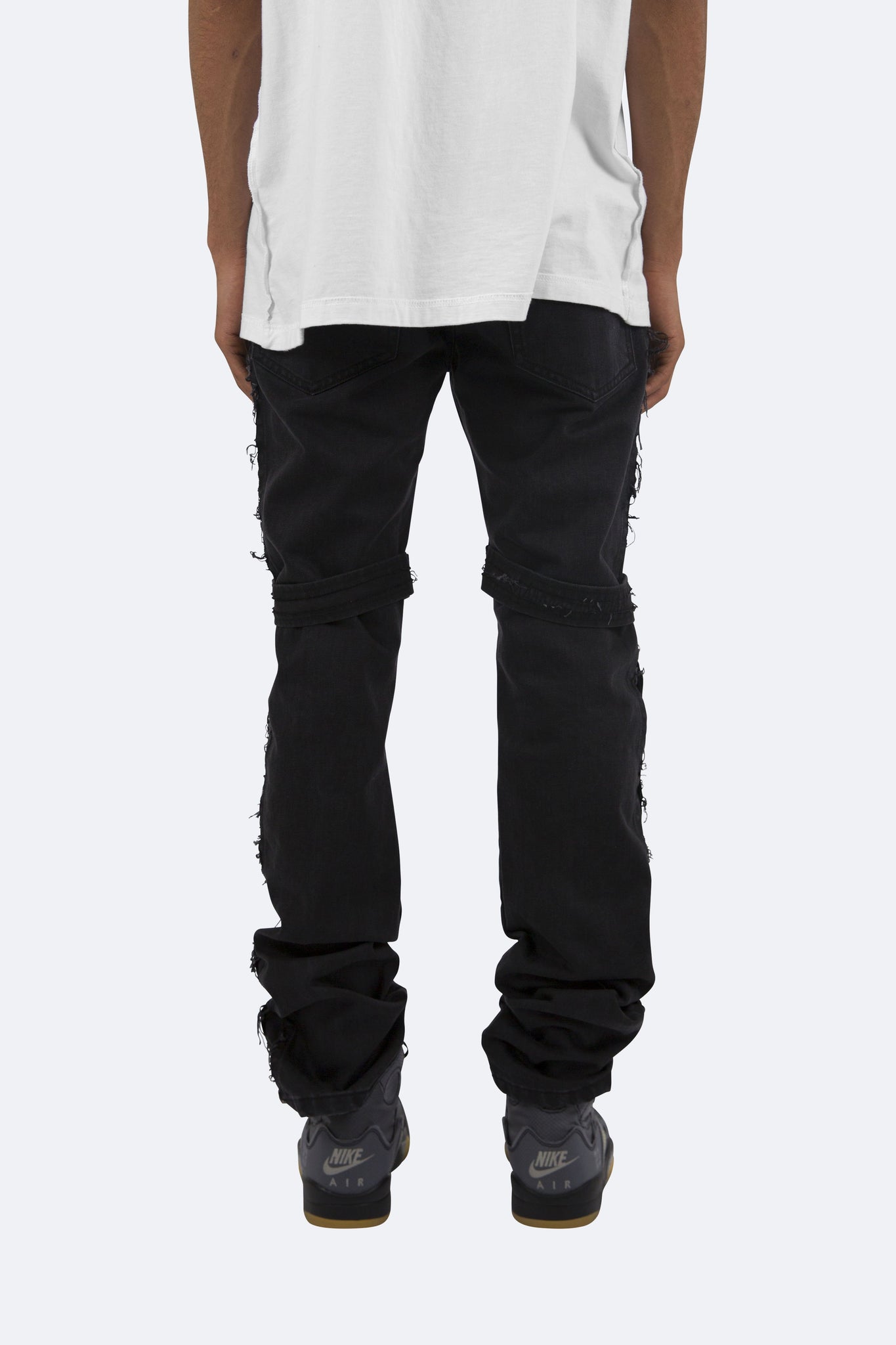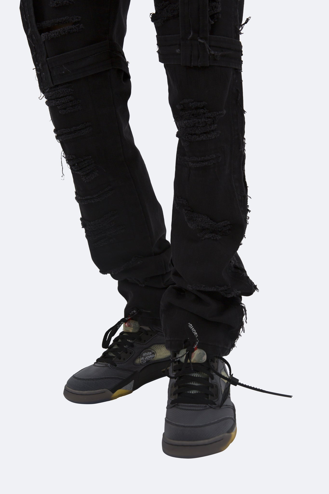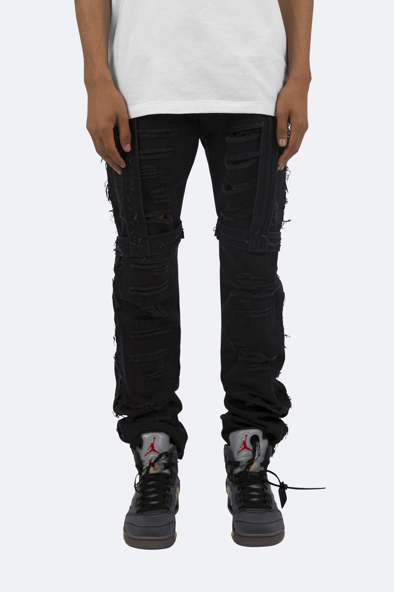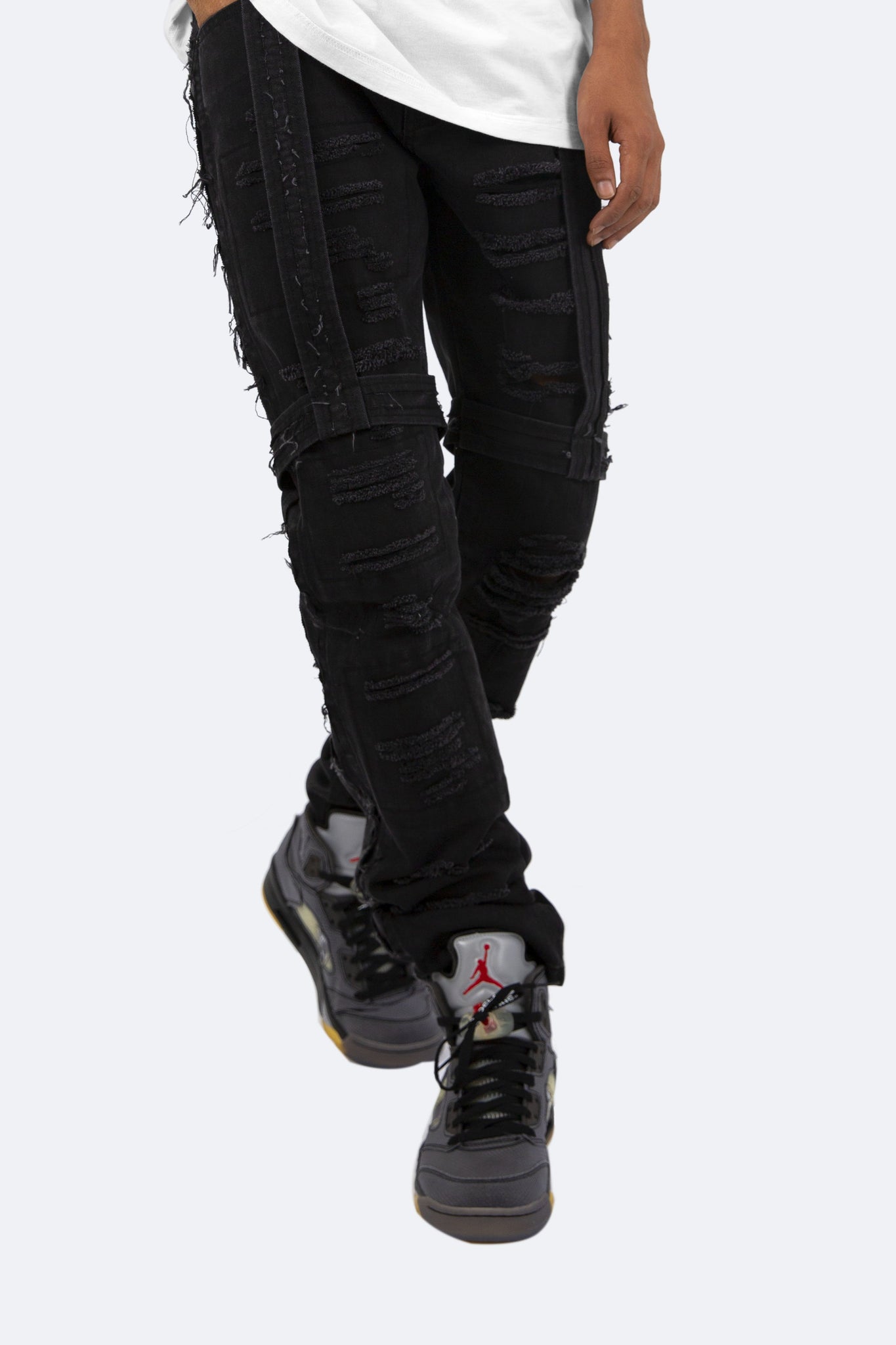 the D150 Denim is designed with our D fit which is relaxed throughout with an extended inseam for stacking and features distressing throughout and strapping from the waist to the thigh.