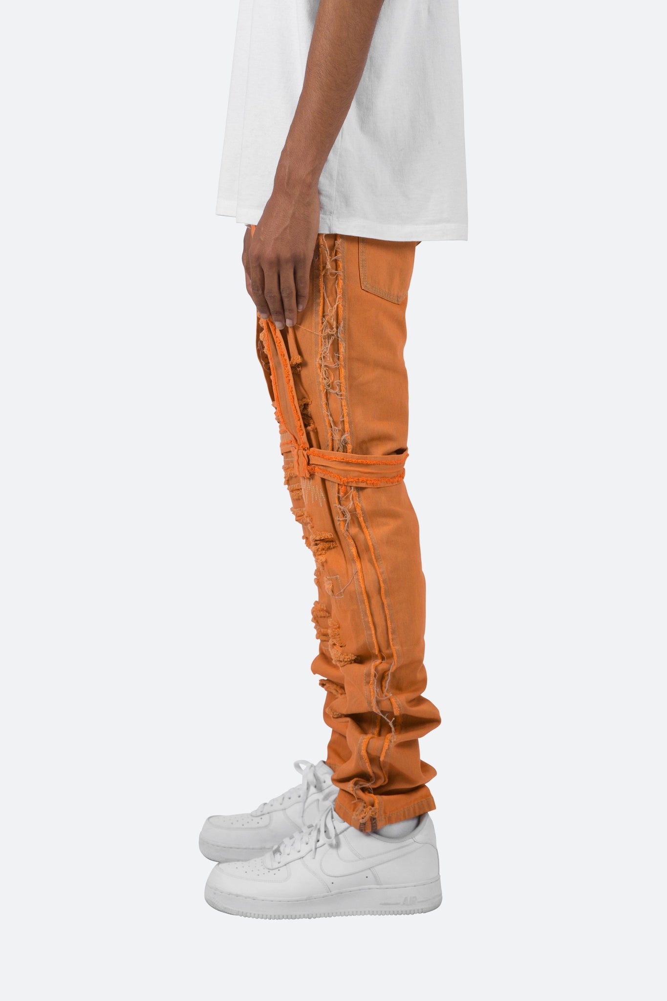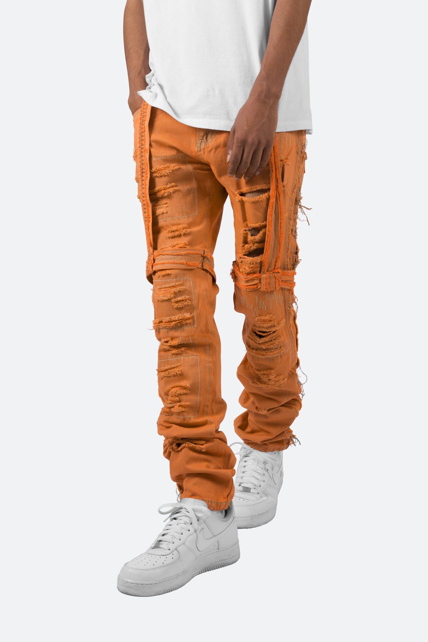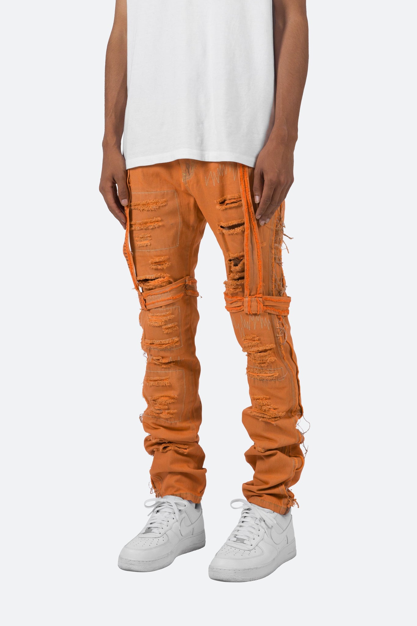 the D150 Denim is designed with our D fit which is relaxed throughout with an extended inseam for stacking and features an orange dye, distressing throughout, and strapping from the waist to the thigh.