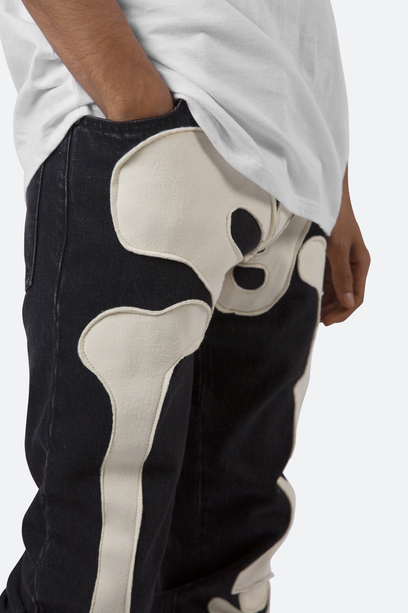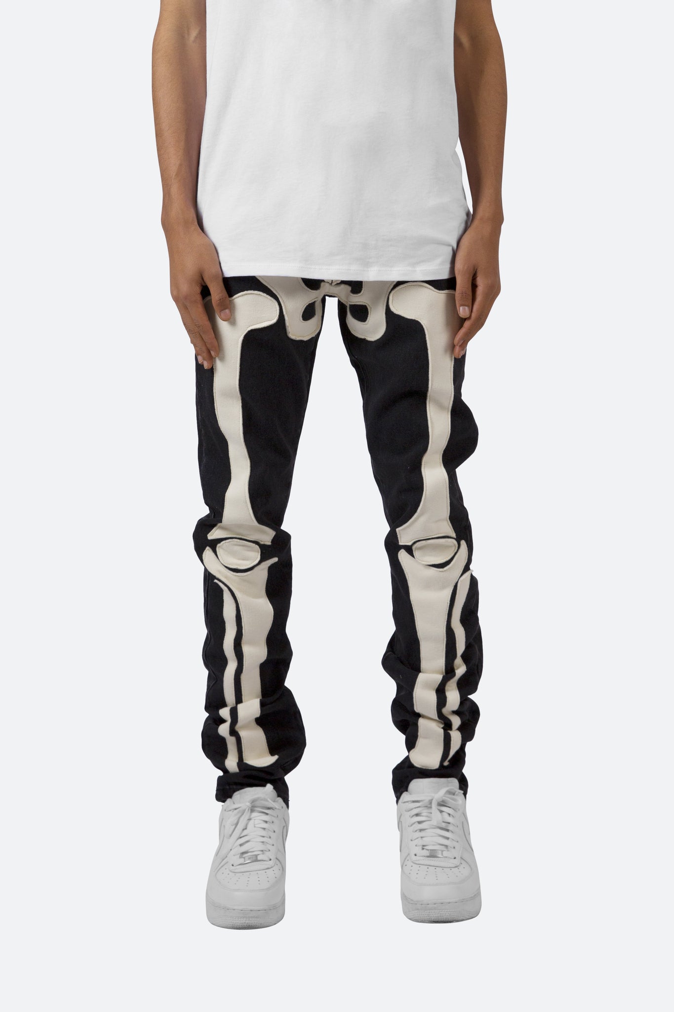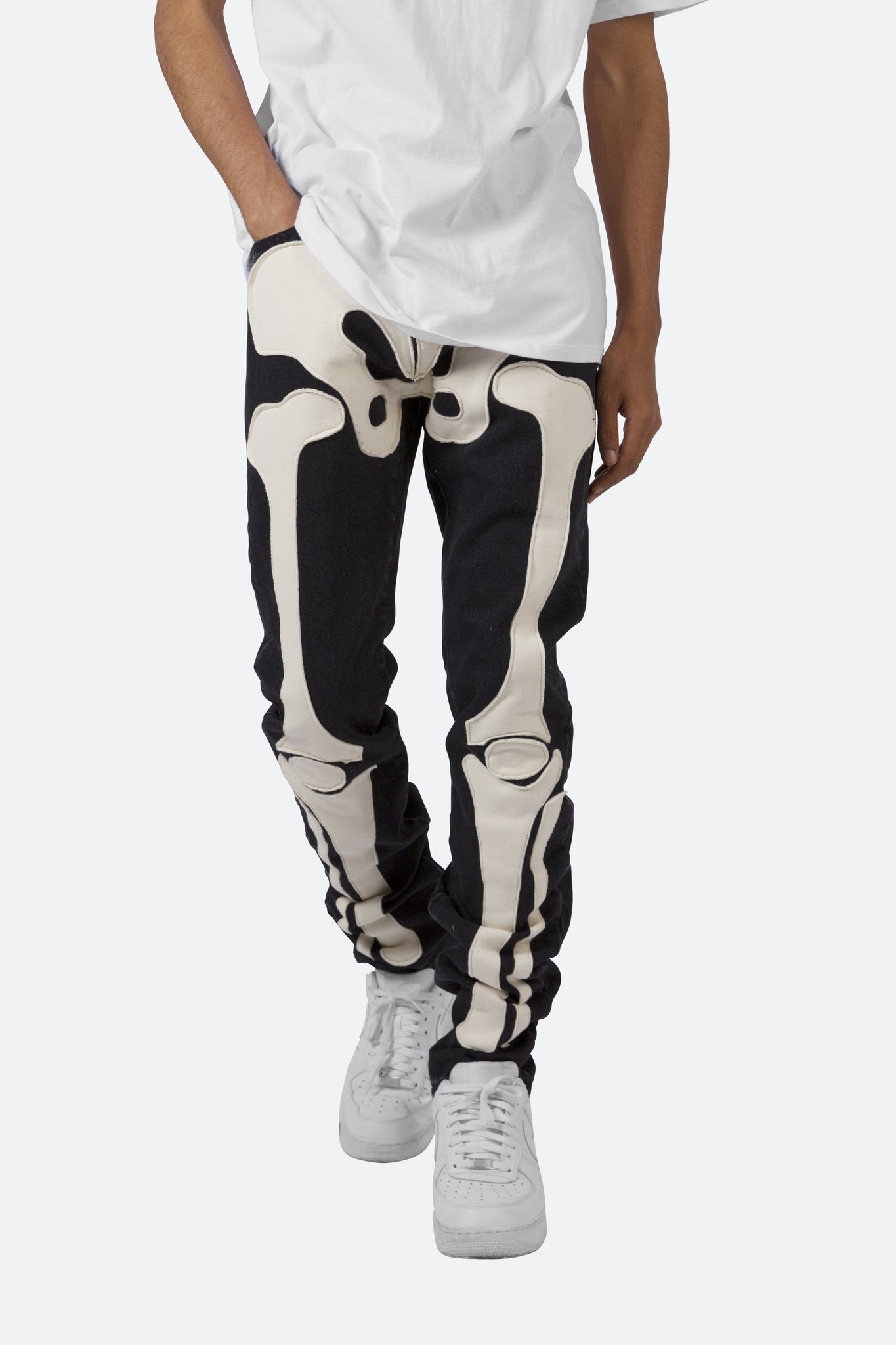 the D184 Denim is designed with our new D fit which is relaxed throughout with an extended inseam for stacking and features sewn-on skeleton artwork in fleece on both legs and is constructed from black denim with a raw leg opening.