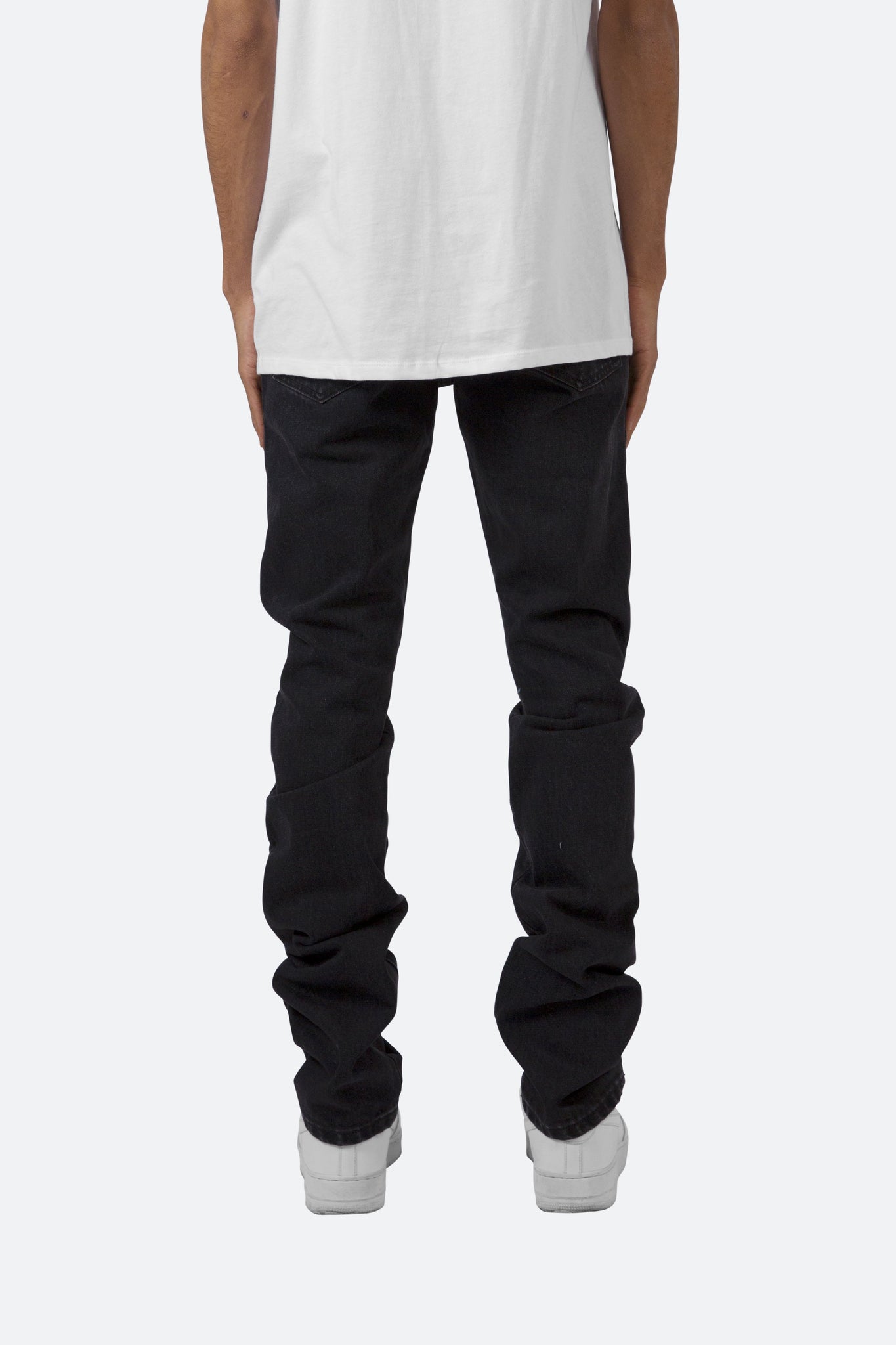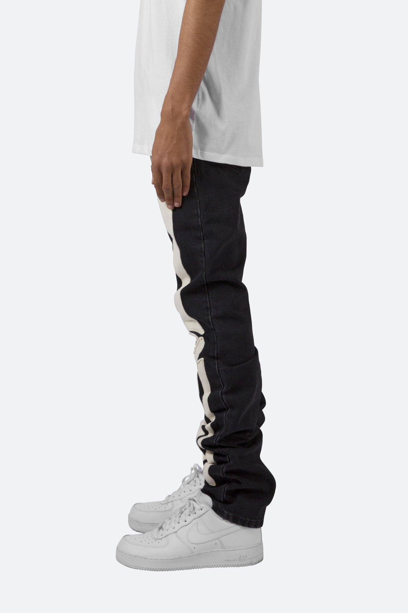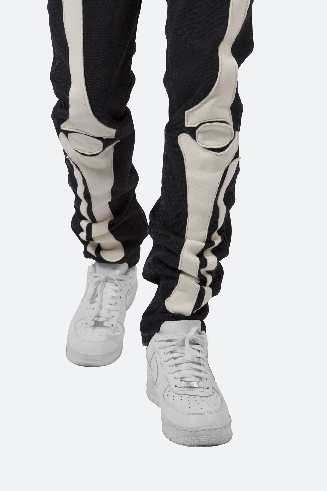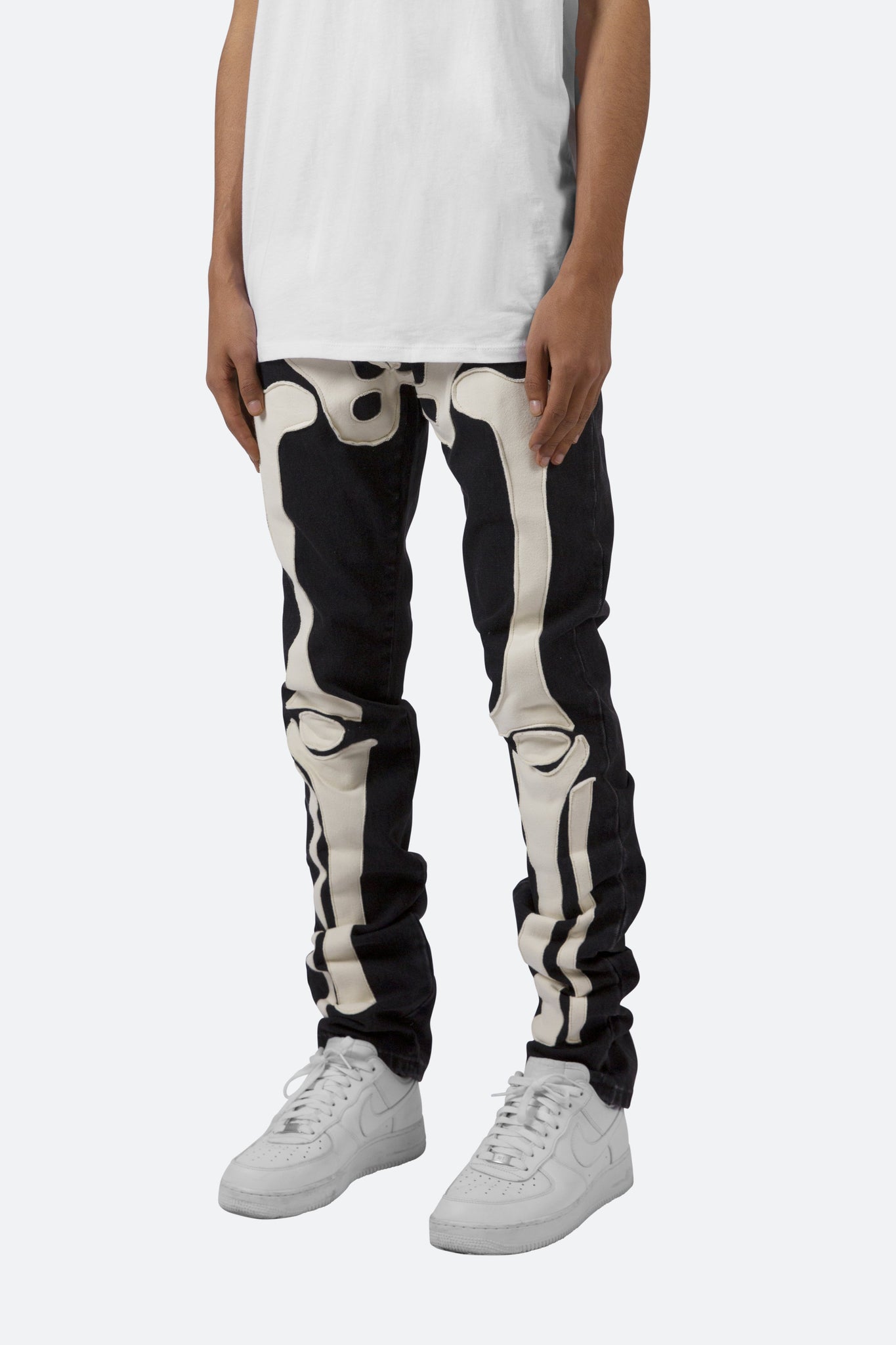 the D184 Denim is designed with our new D fit which is relaxed throughout with an extended inseam for stacking and features sewn-on skeleton artwork in fleece on both legs and is constructed from black denim with a raw leg opening.