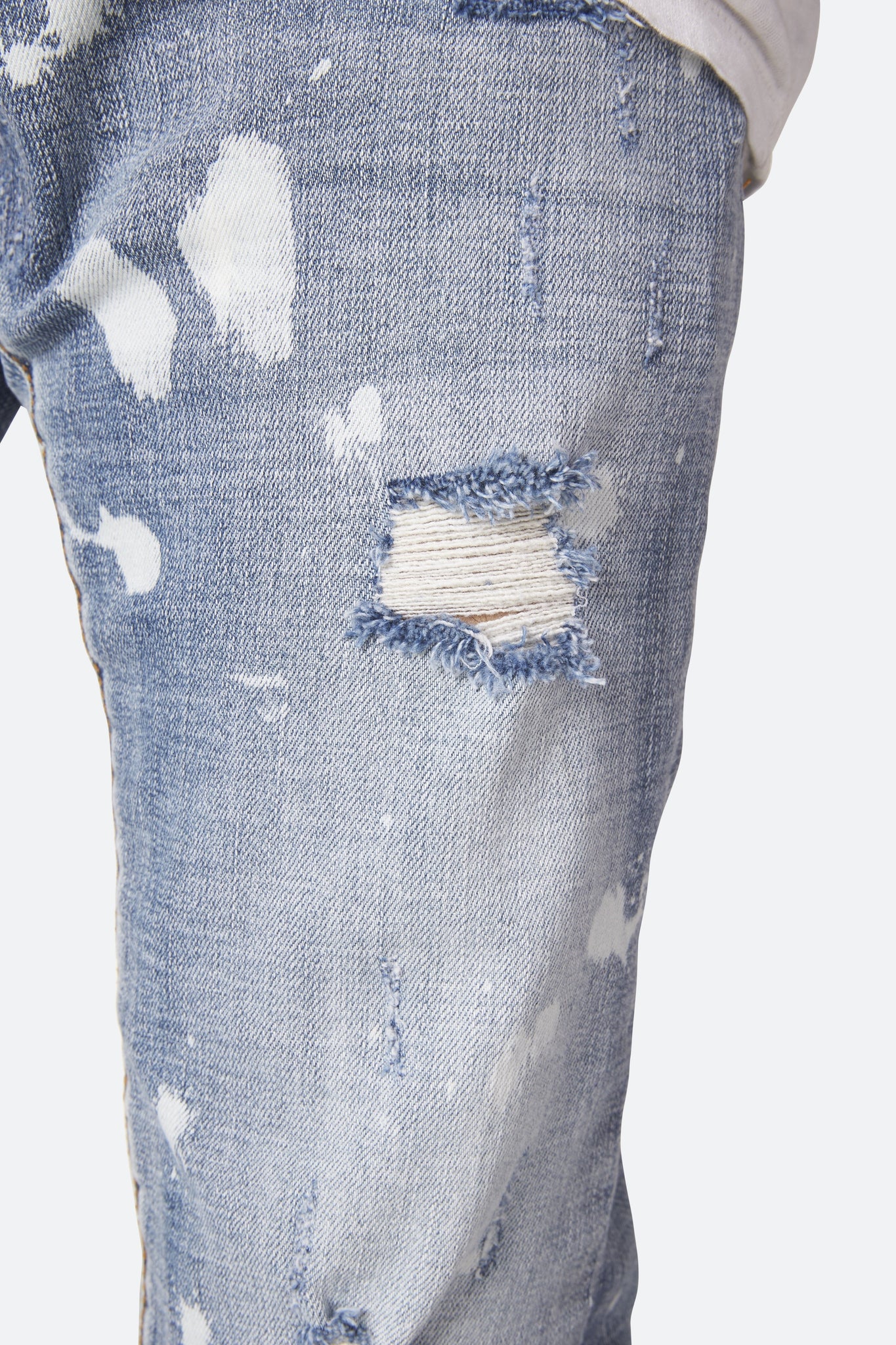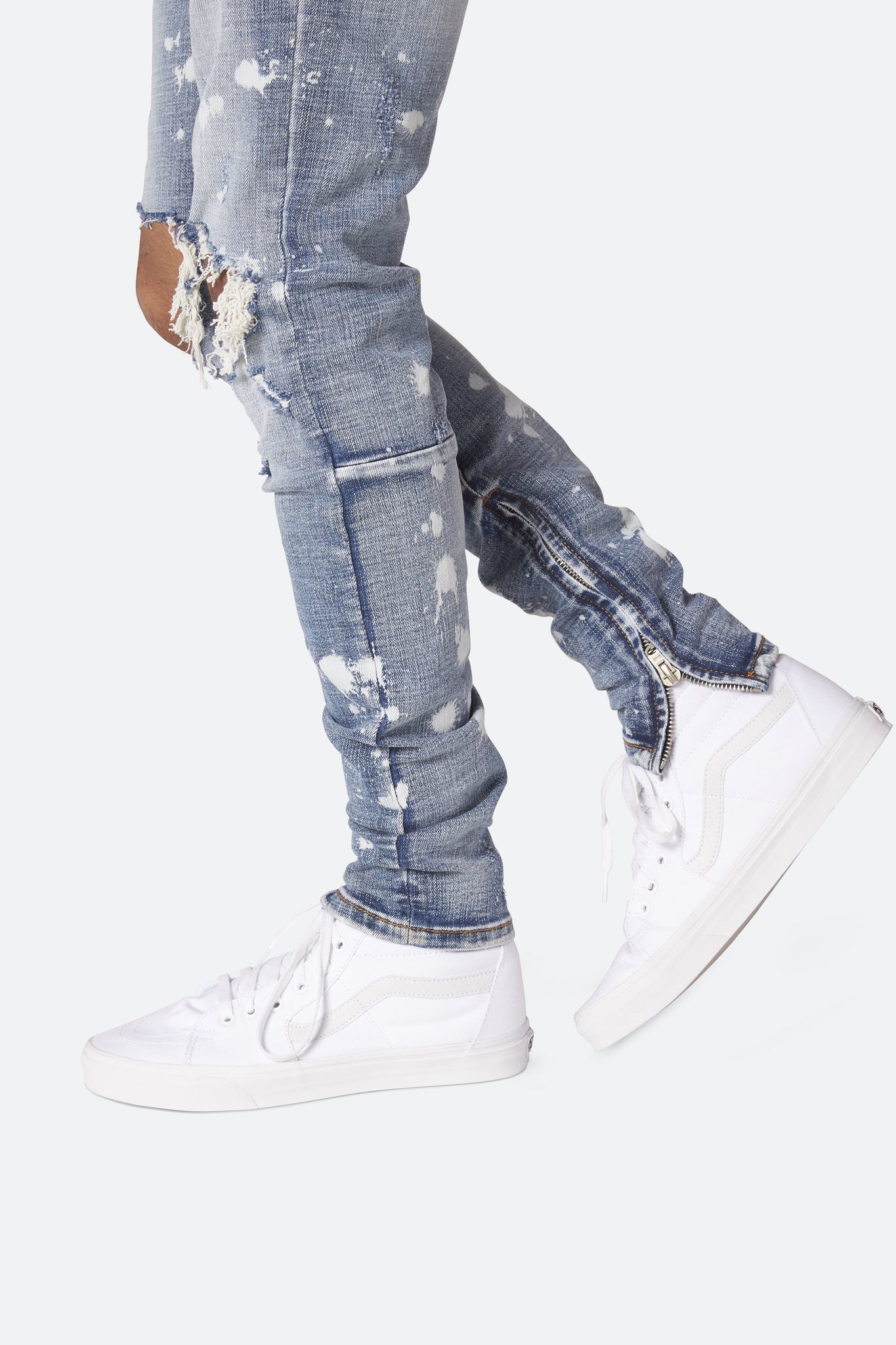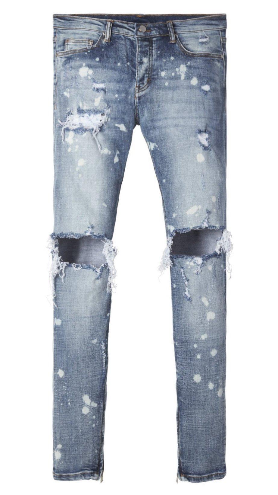 developed in los angeles, the splash m1 stretch denim is designed with a relaxed fit through the thigh that tapers from the knee to the ankle, featuring distress details at the knee and thigh, finishing off with a 10" concealed zipper on the inseam for a carefully optimized fit.