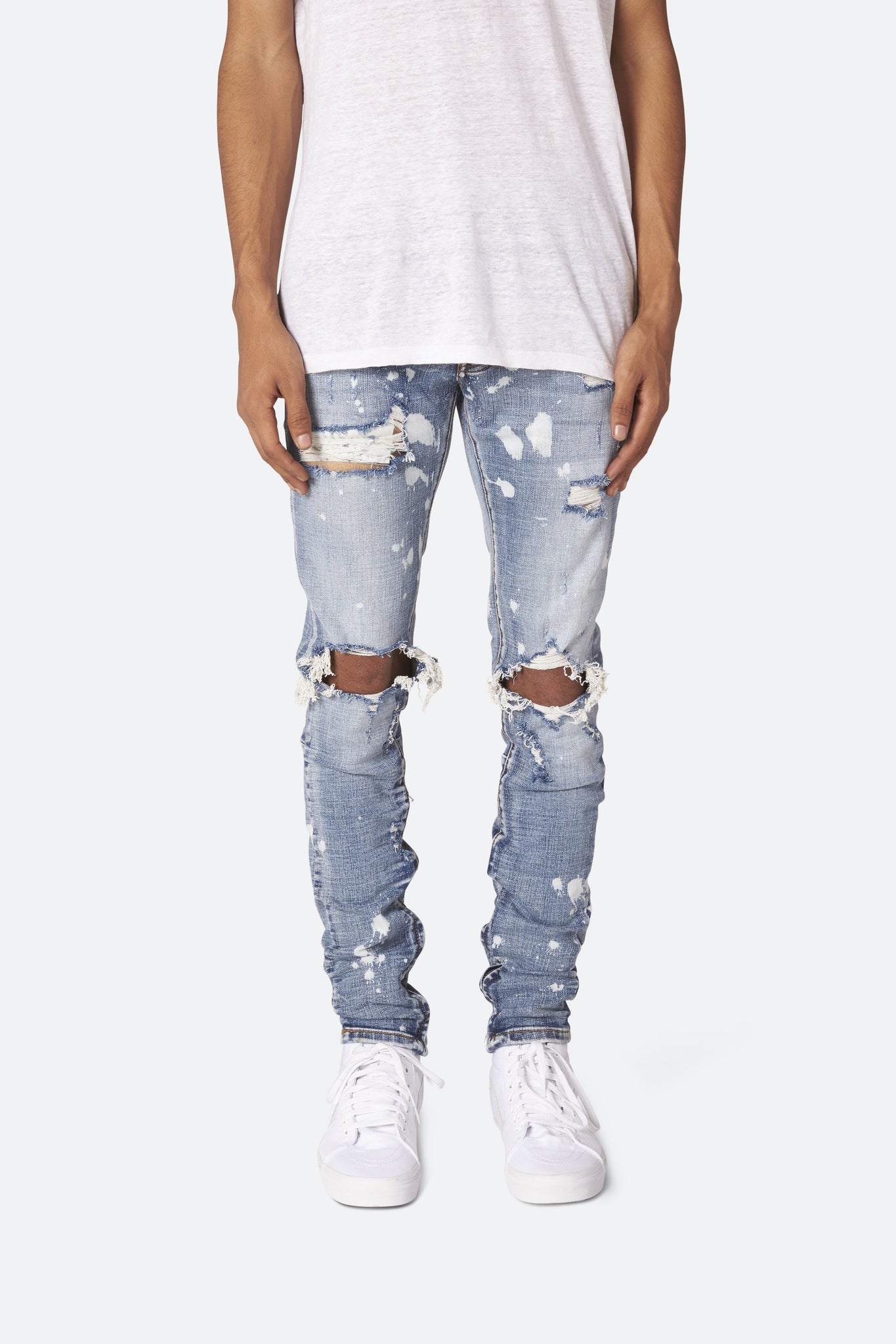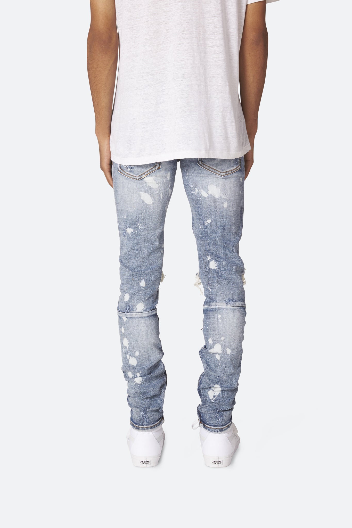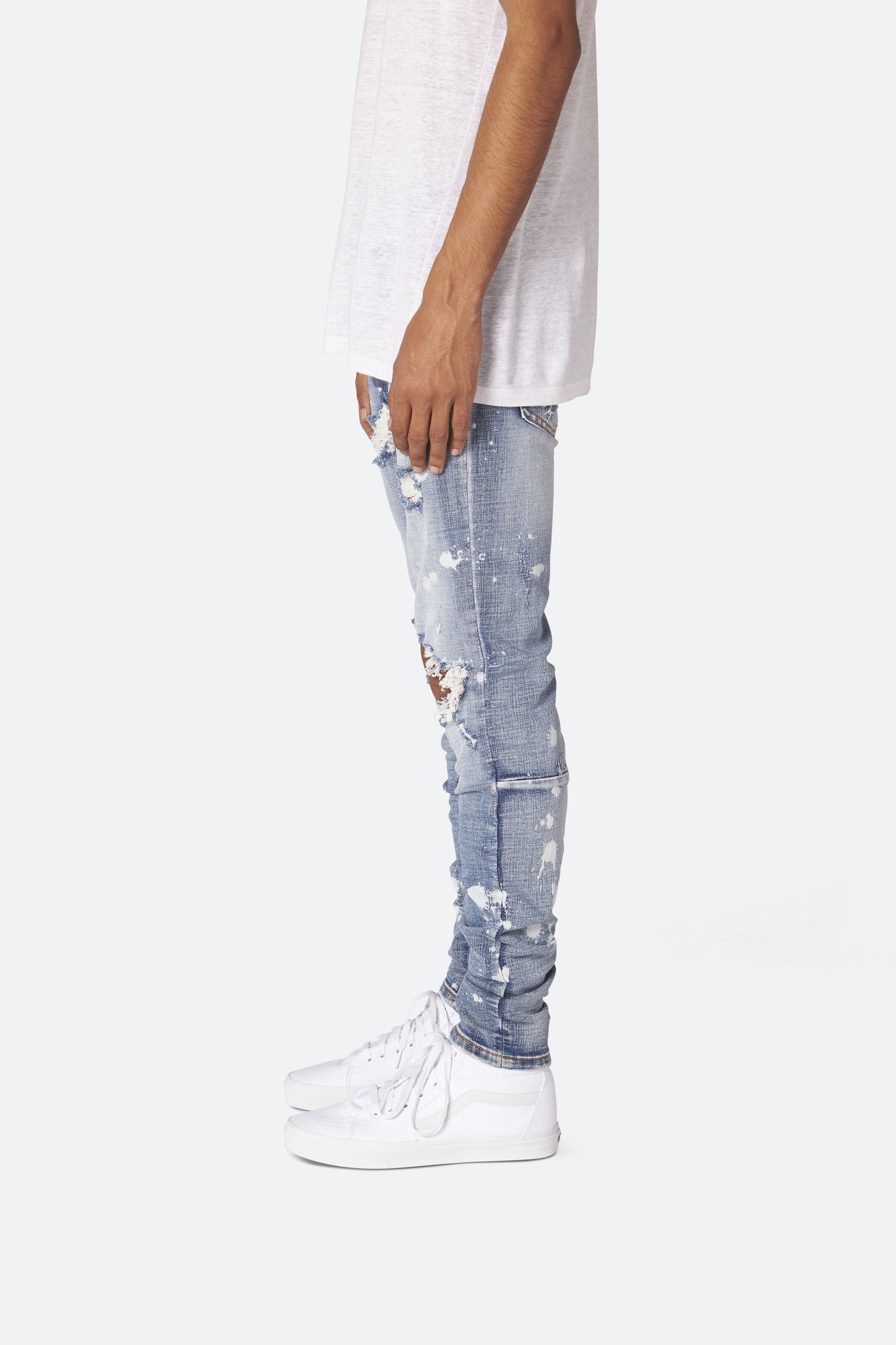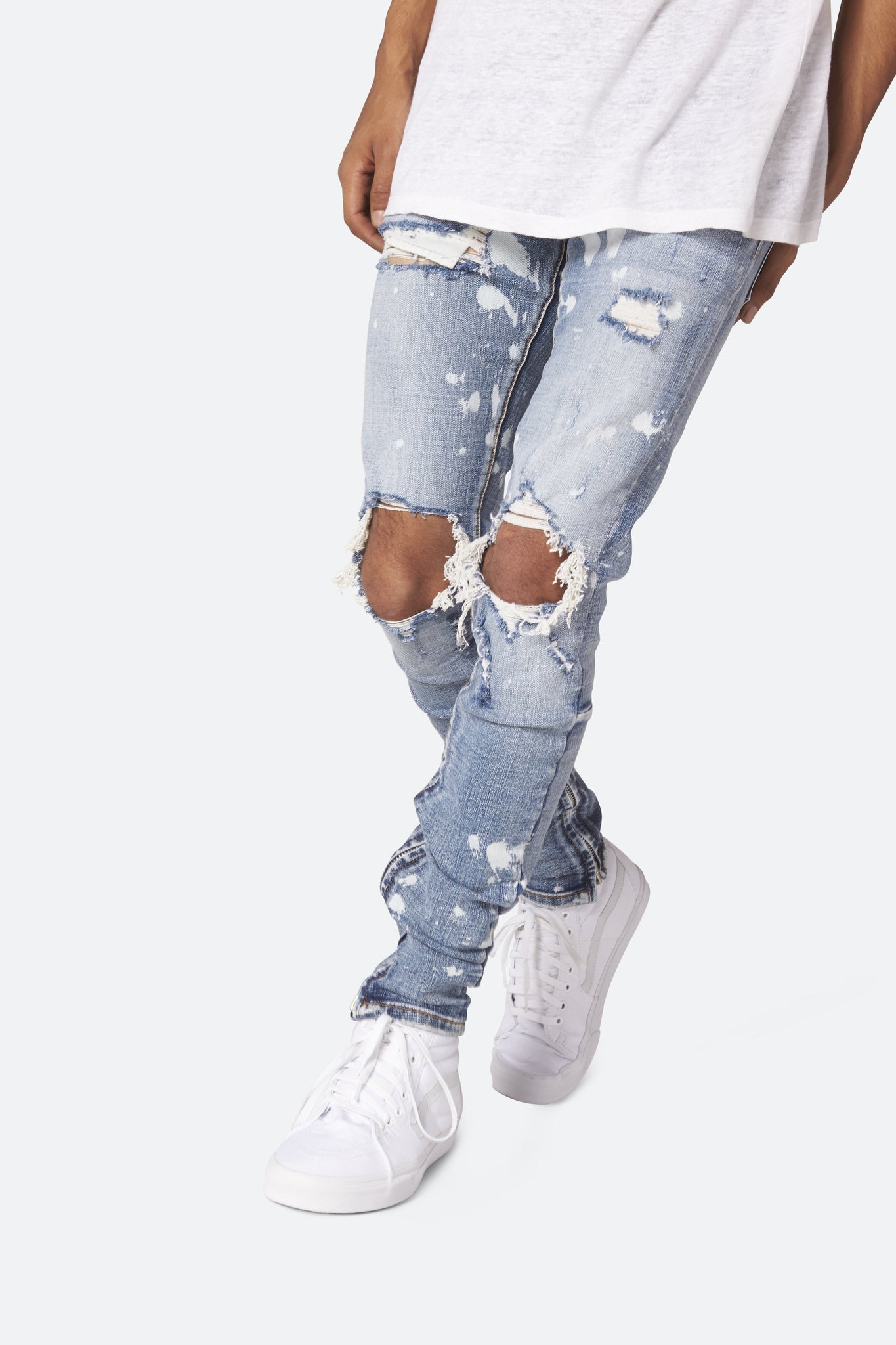 developed in los angeles, the splash m1 stretch denim is designed with a relaxed fit through the thigh that tapers from the knee to the ankle, featuring distress details at the knee and thigh, finishing off with a 10" concealed zipper on the inseam for a carefully optimized fit.