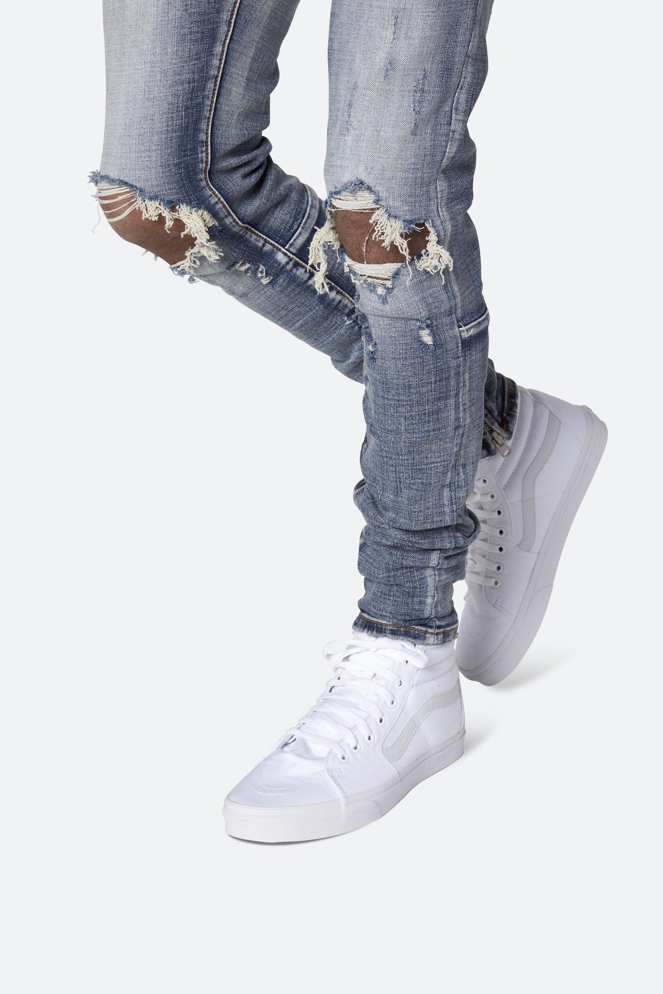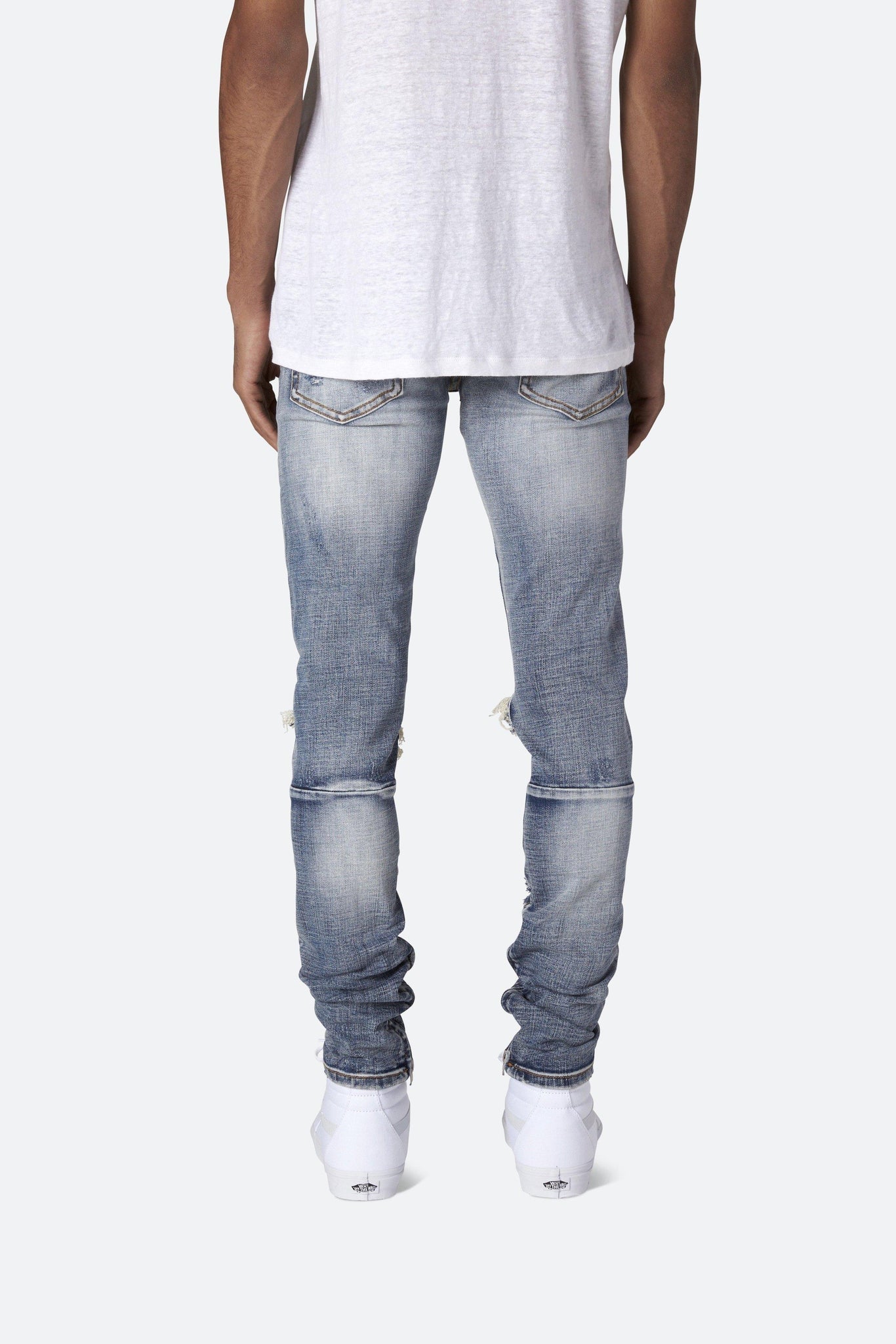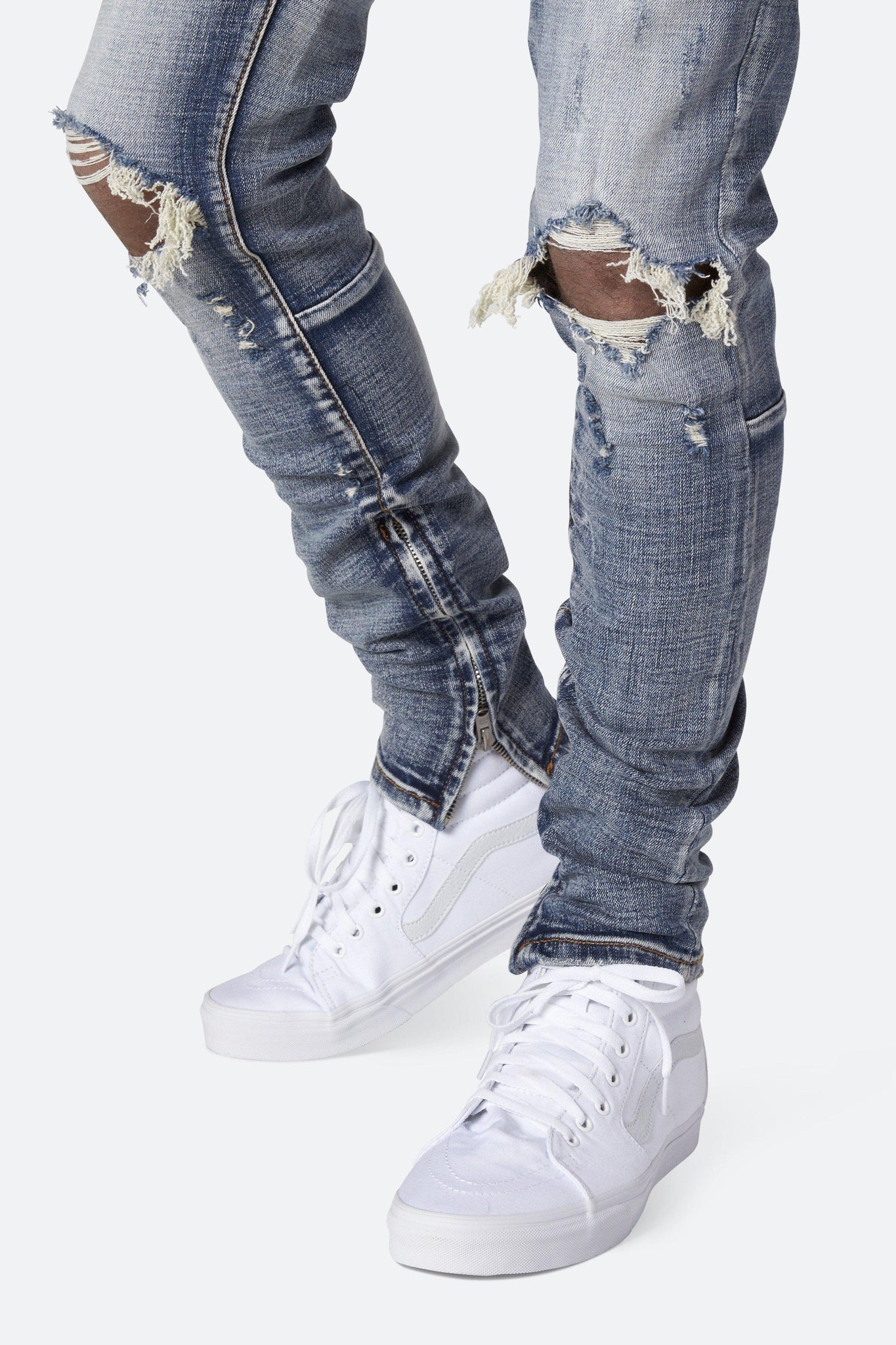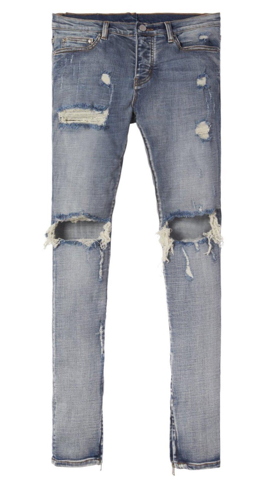developed in los angeles, the original blue m1 stretch denim is designed with a relaxed fit through the thigh that tapers from the knee to the ankle, featuring distress details at the knee and thigh, finishing off with a 10" concealed zipper on the inseam for a carefully optimized fit.