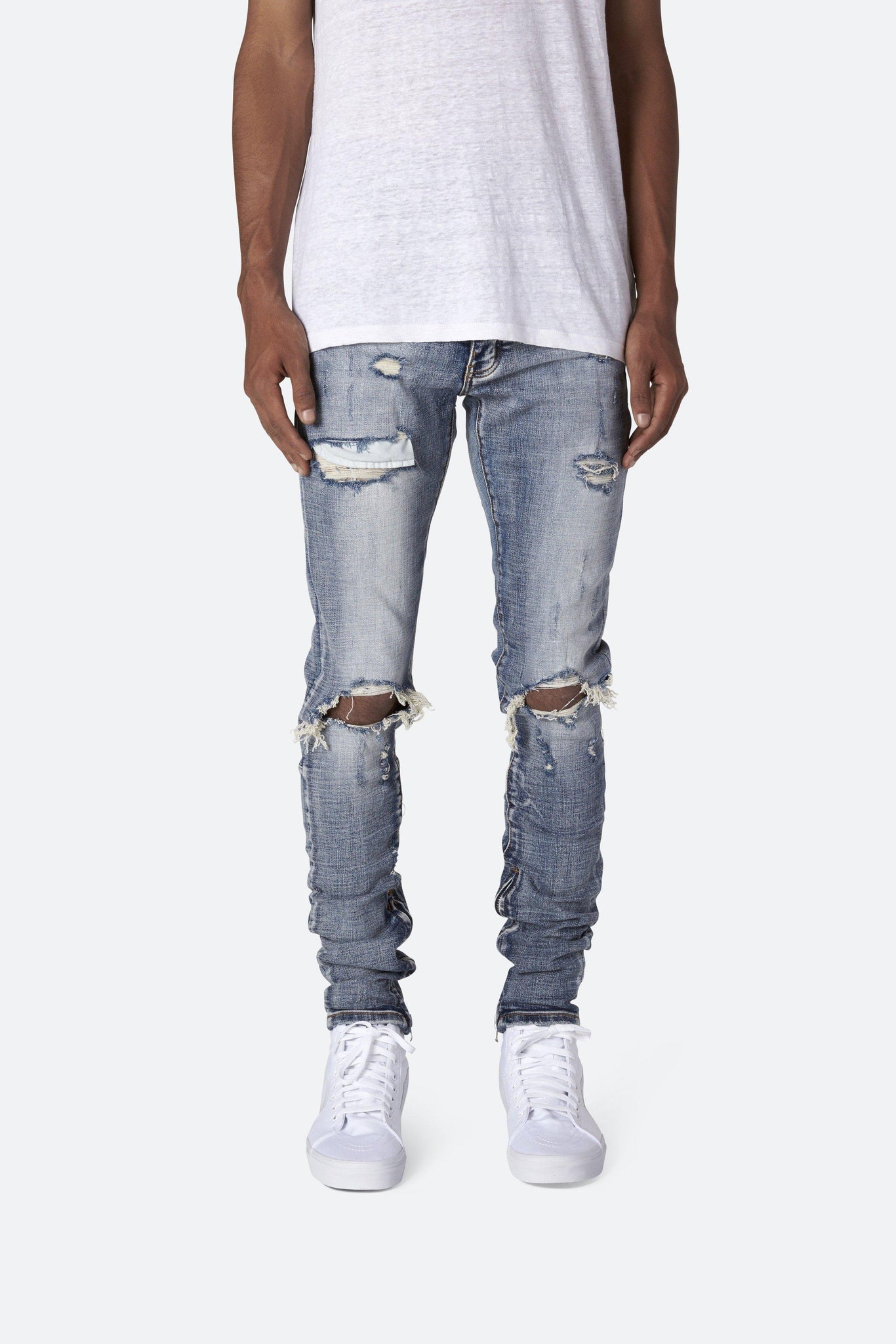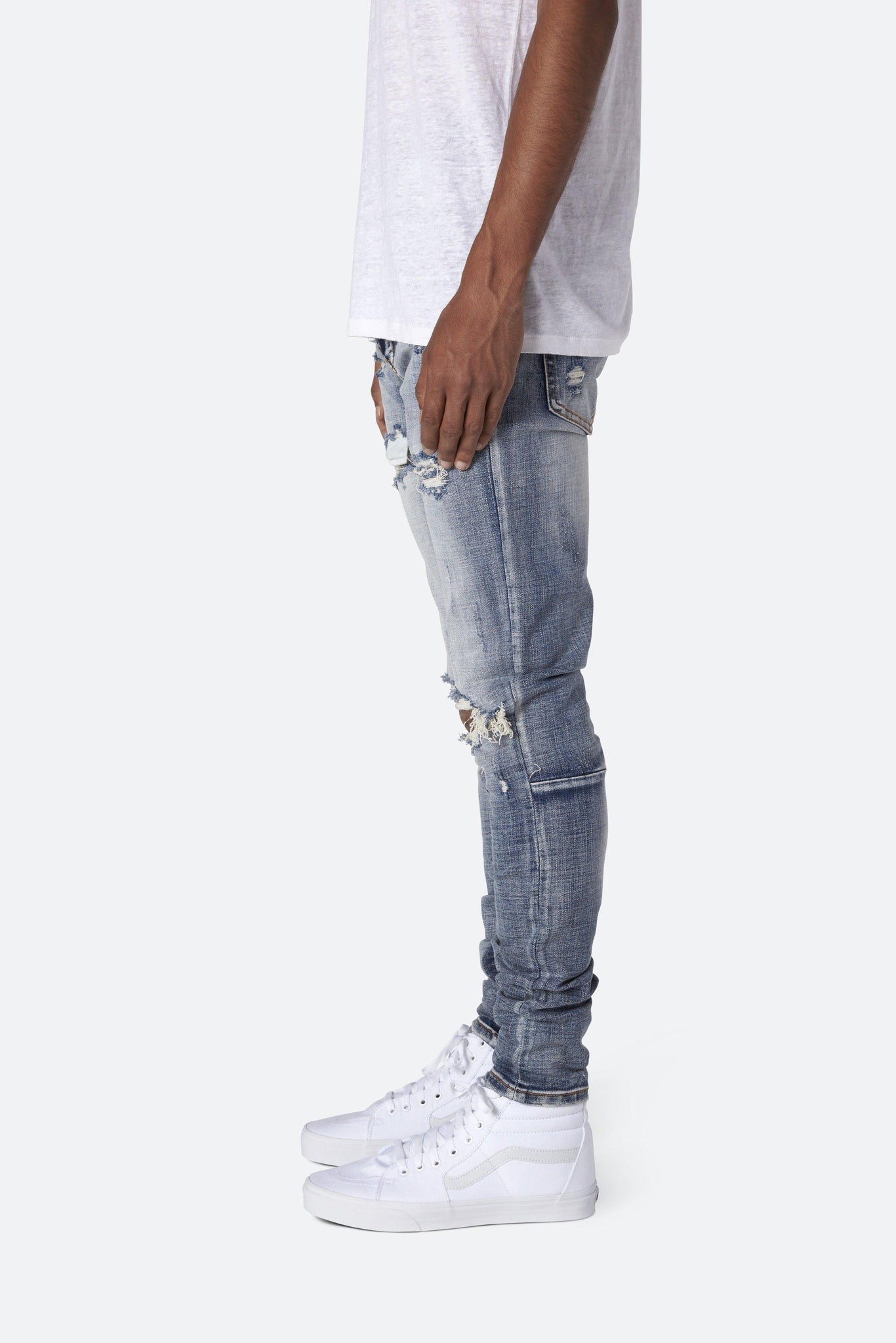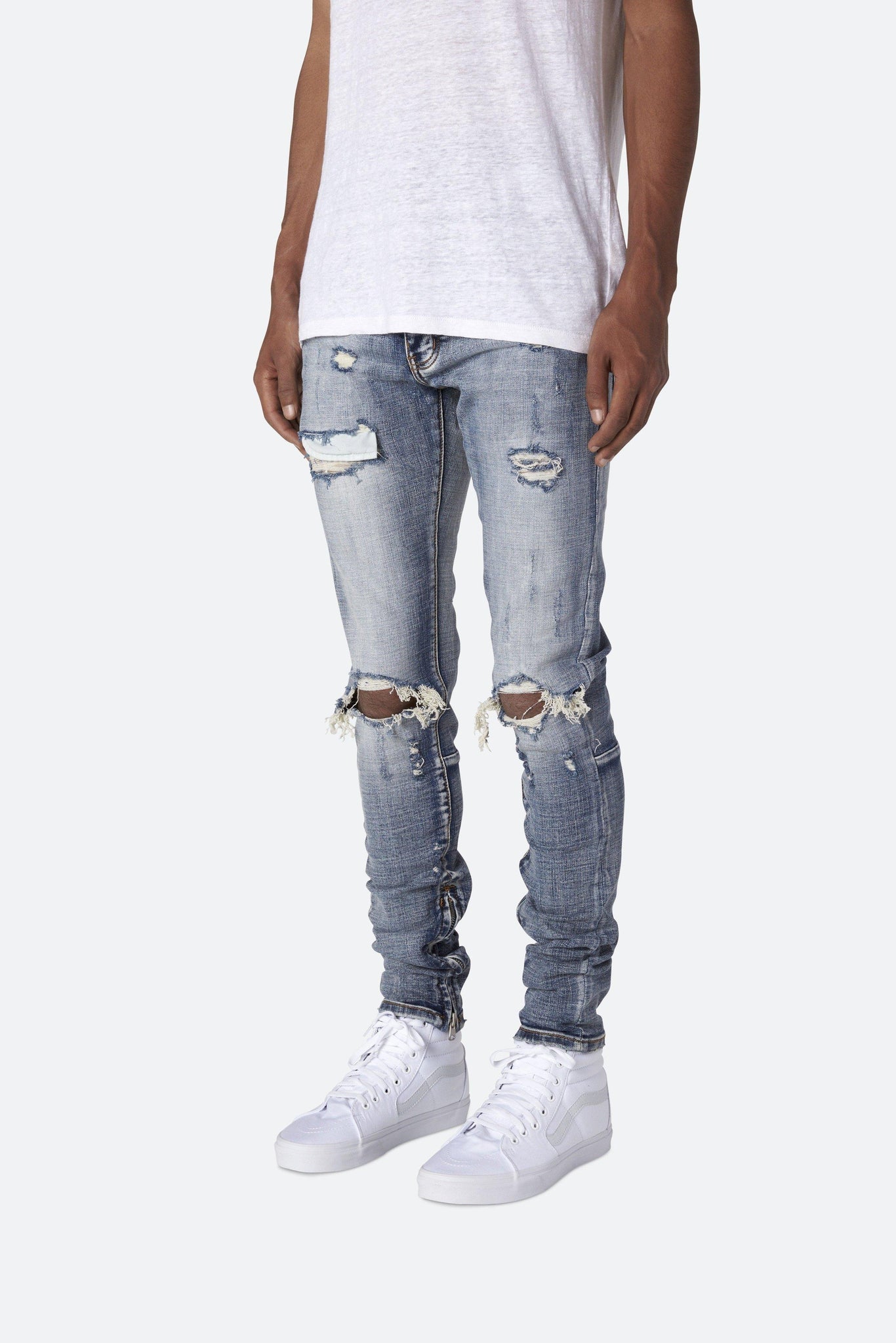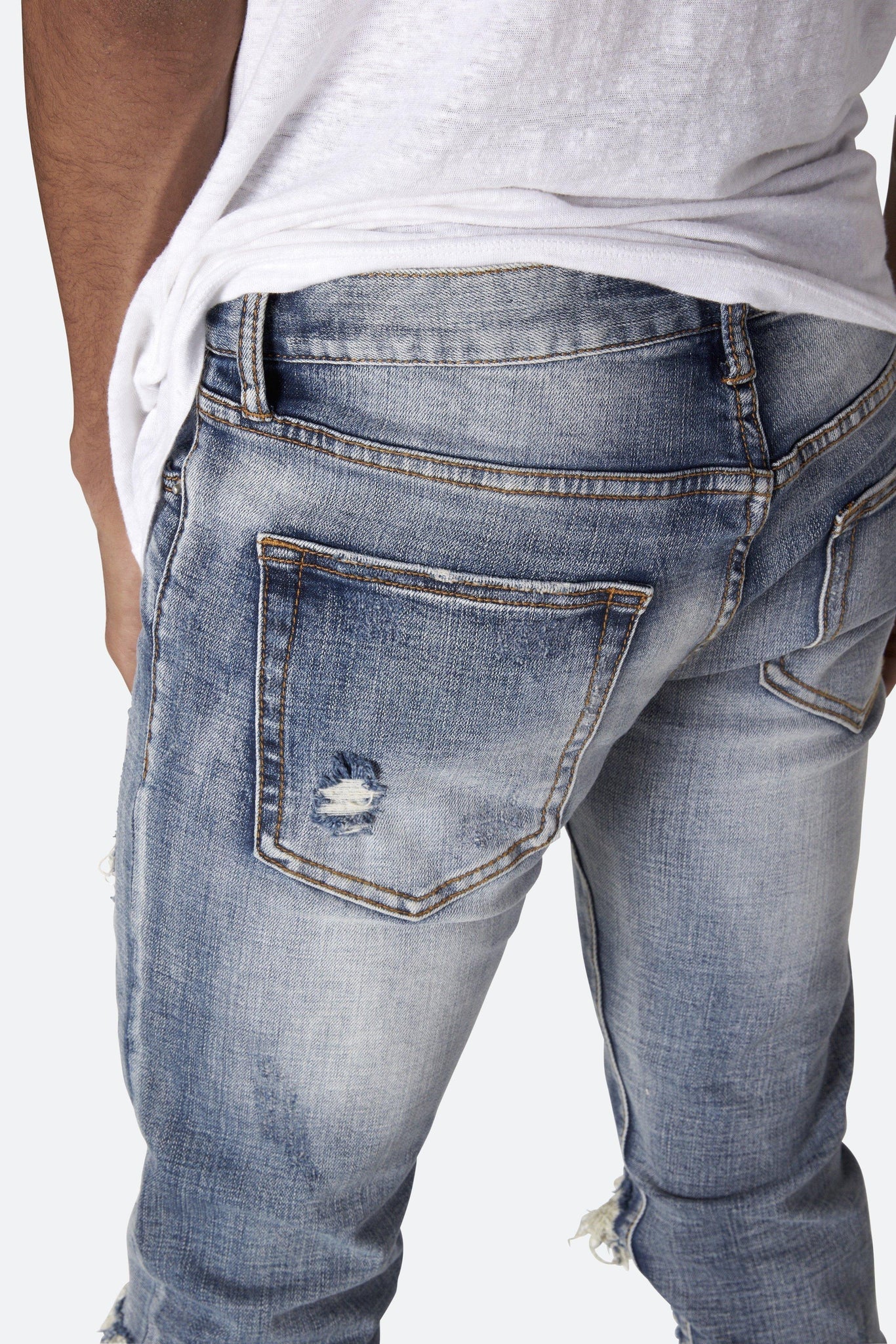 developed in los angeles, the original blue m1 stretch denim is designed with a relaxed fit through the thigh that tapers from the knee to the ankle, featuring distress details at the knee and thigh, finishing off with a 10" concealed zipper on the inseam for a carefully optimized fit.