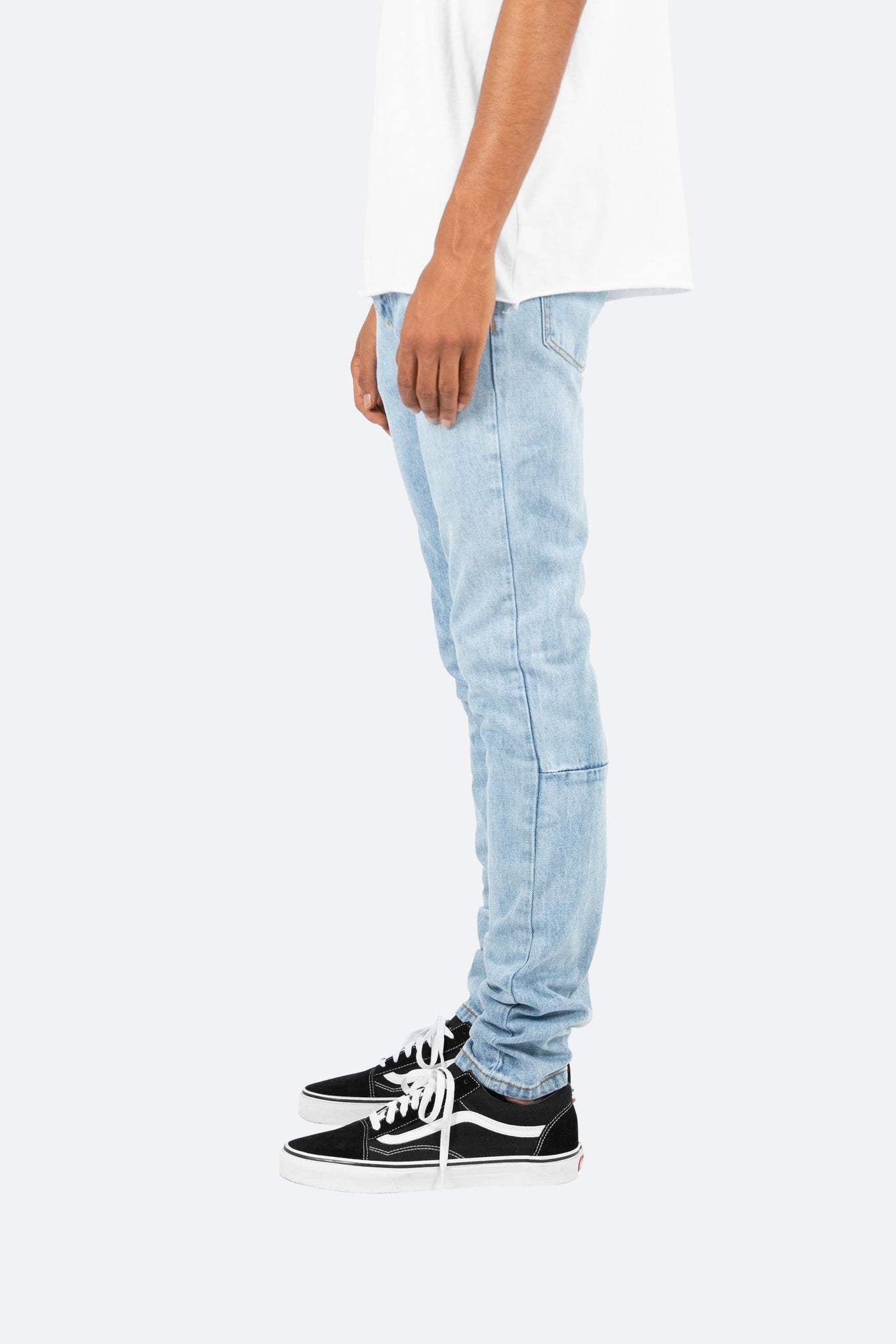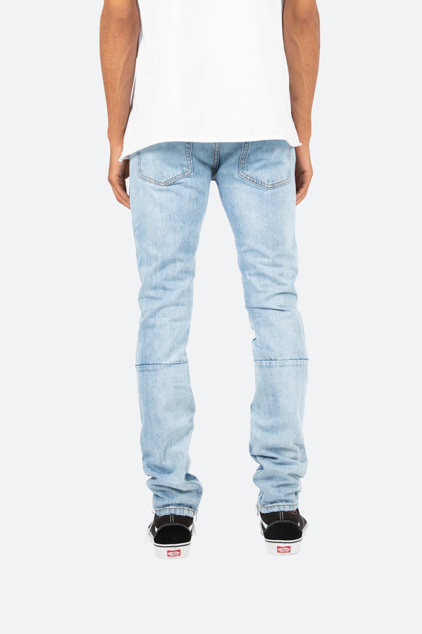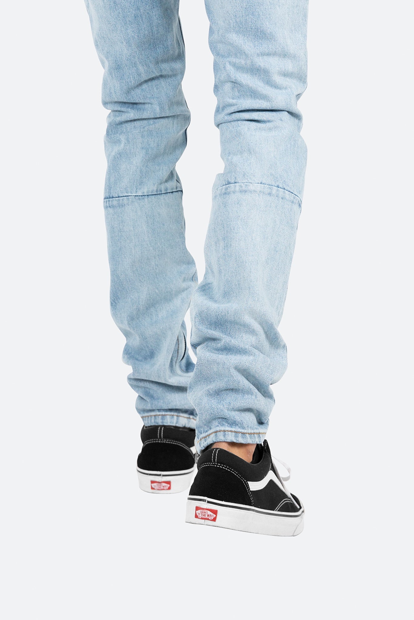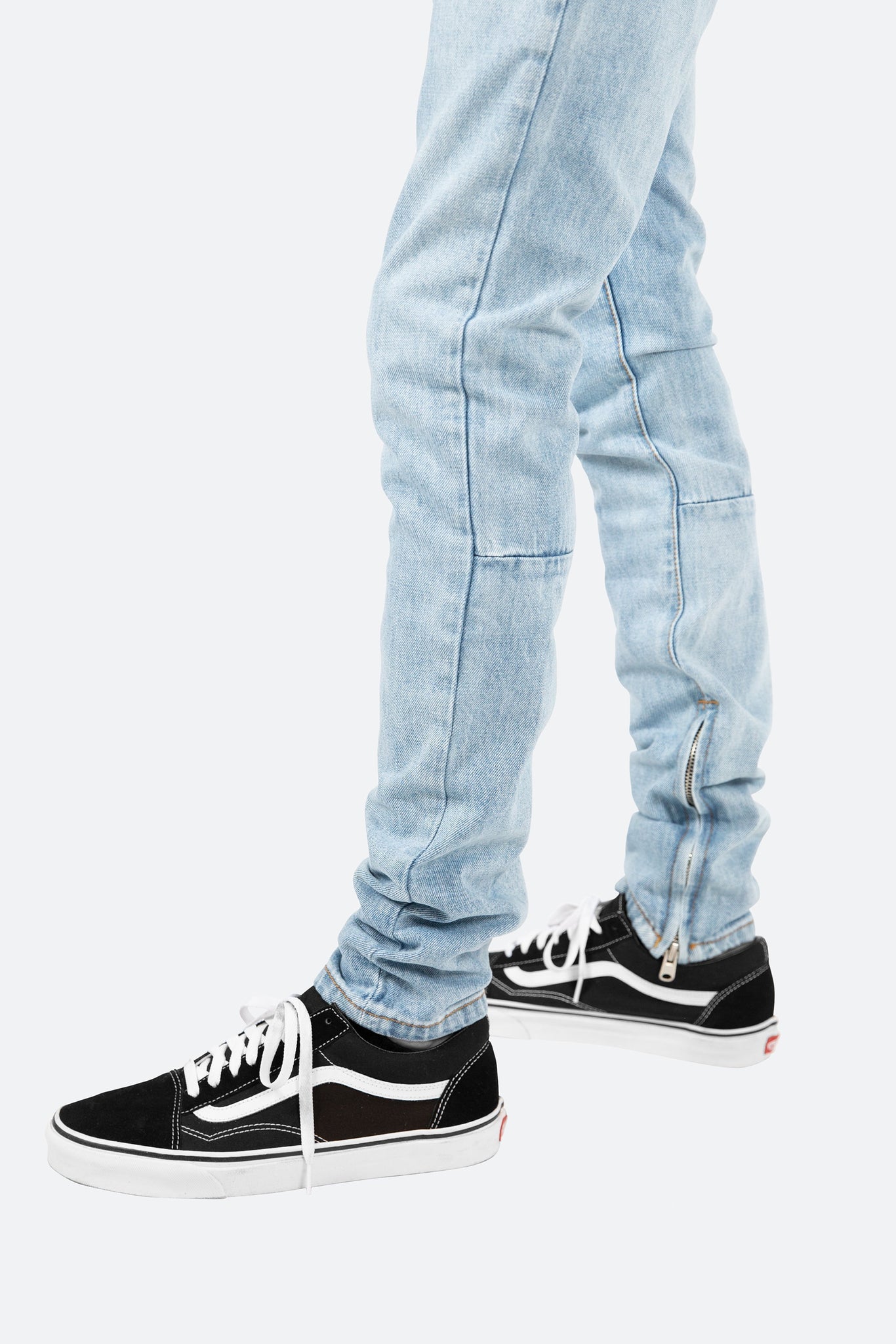 the blue M102 Denim is designed with a relaxed fit through the thigh that tapers from the knee to the ankle, with a light wash throughout, finishing off with a 10" concealed zipper on the inseam and a rear calf panel for a carefully optimized fit.