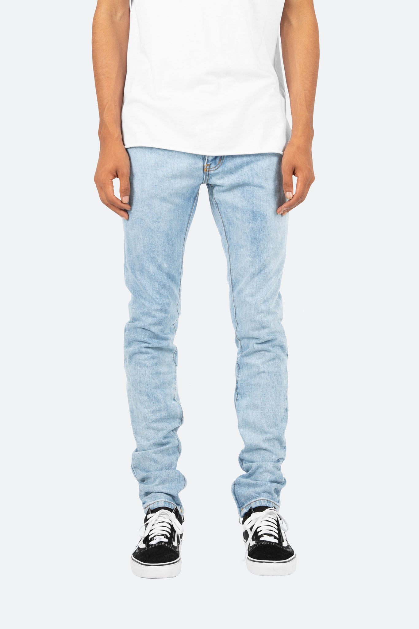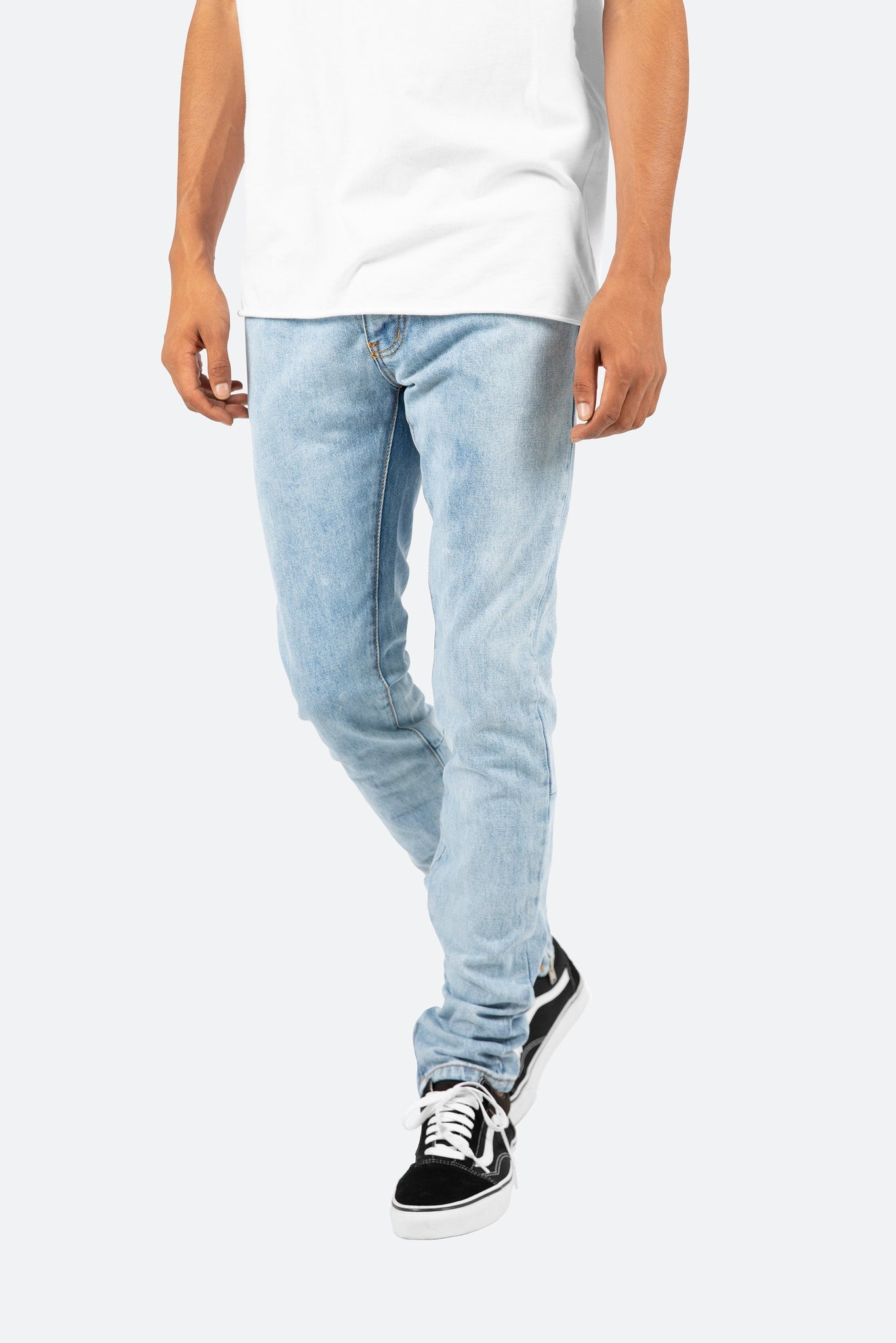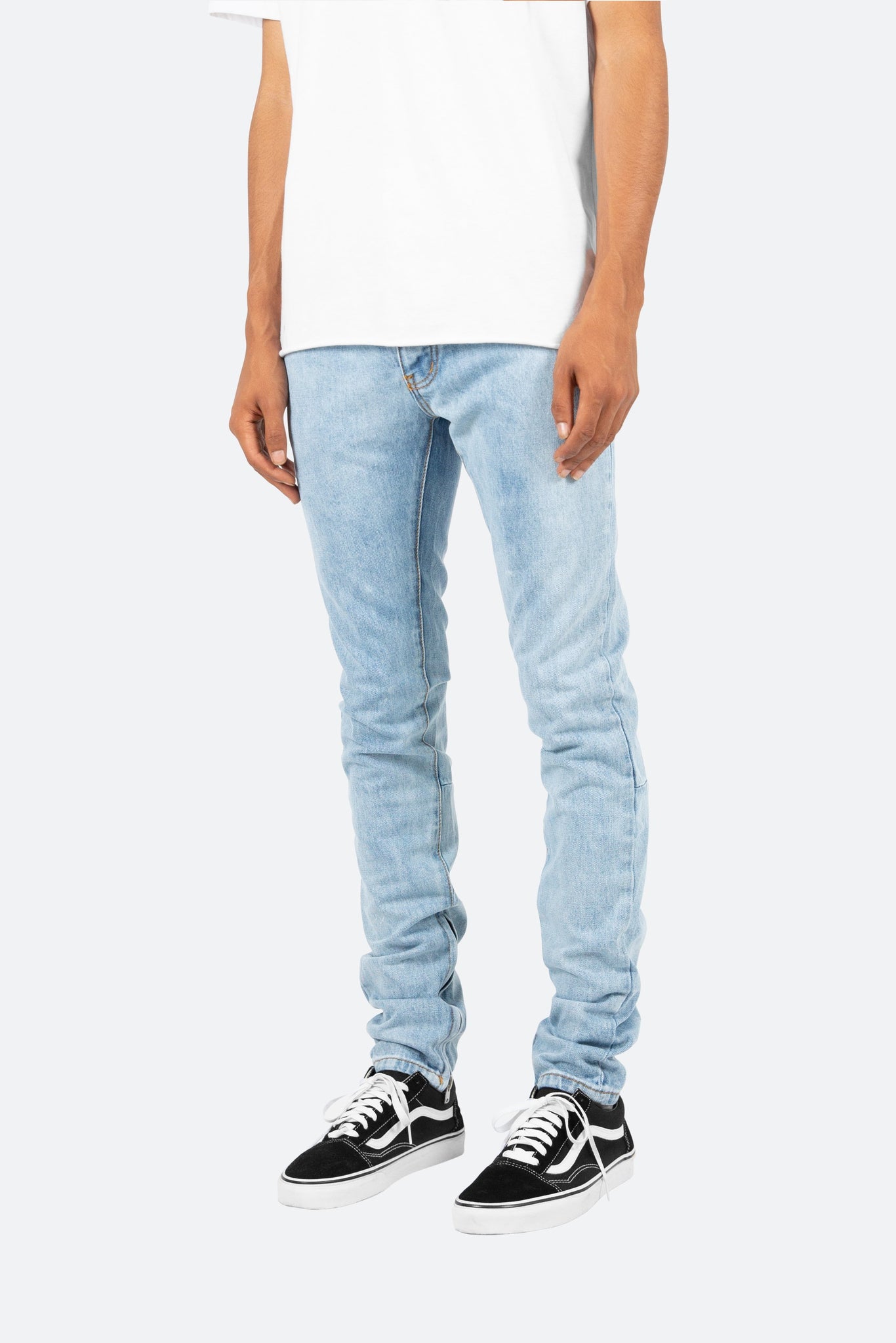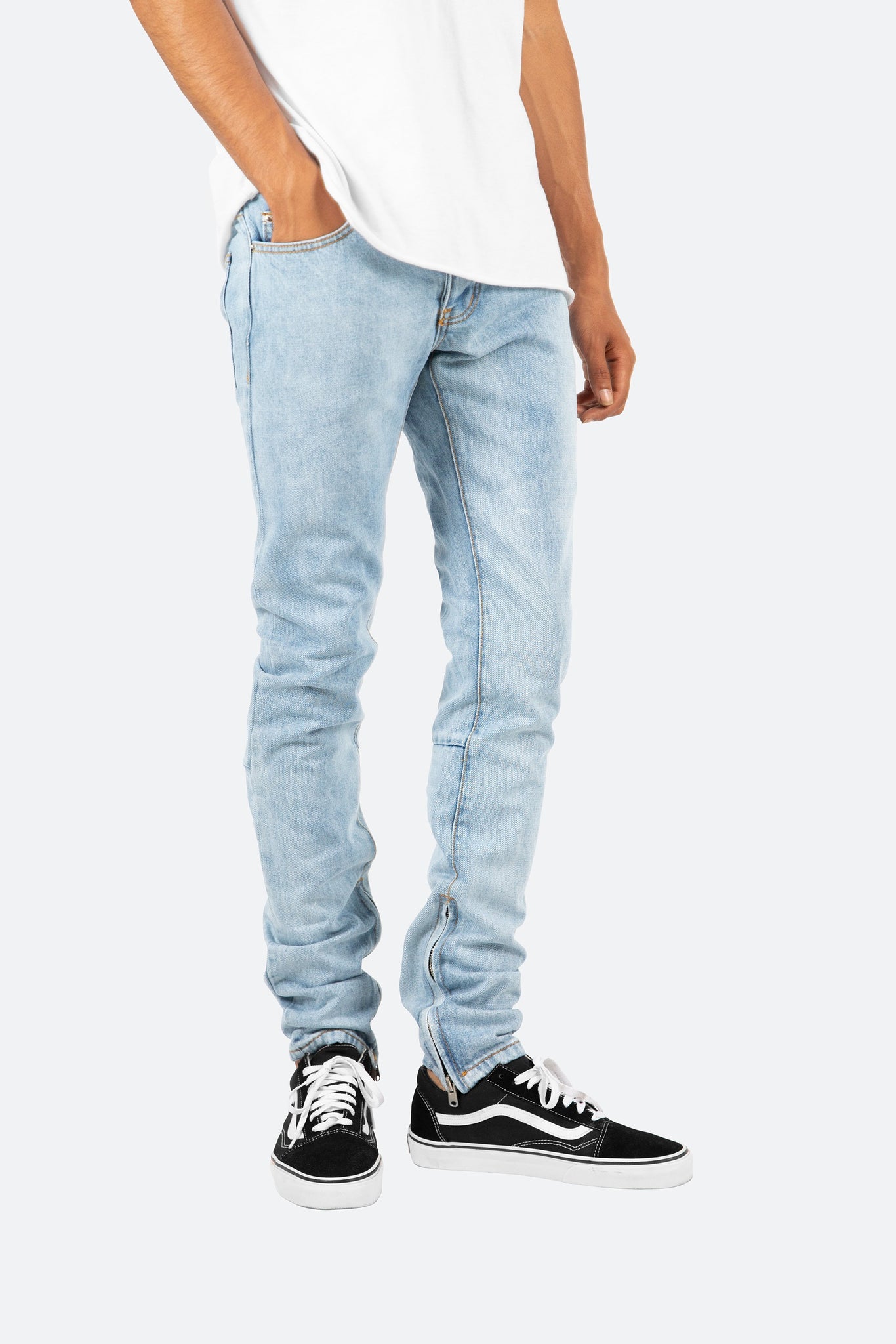 the blue M102 Denim is designed with a relaxed fit through the thigh that tapers from the knee to the ankle, with a light wash throughout, finishing off with a 10" concealed zipper on the inseam and a rear calf panel for a carefully optimized fit.