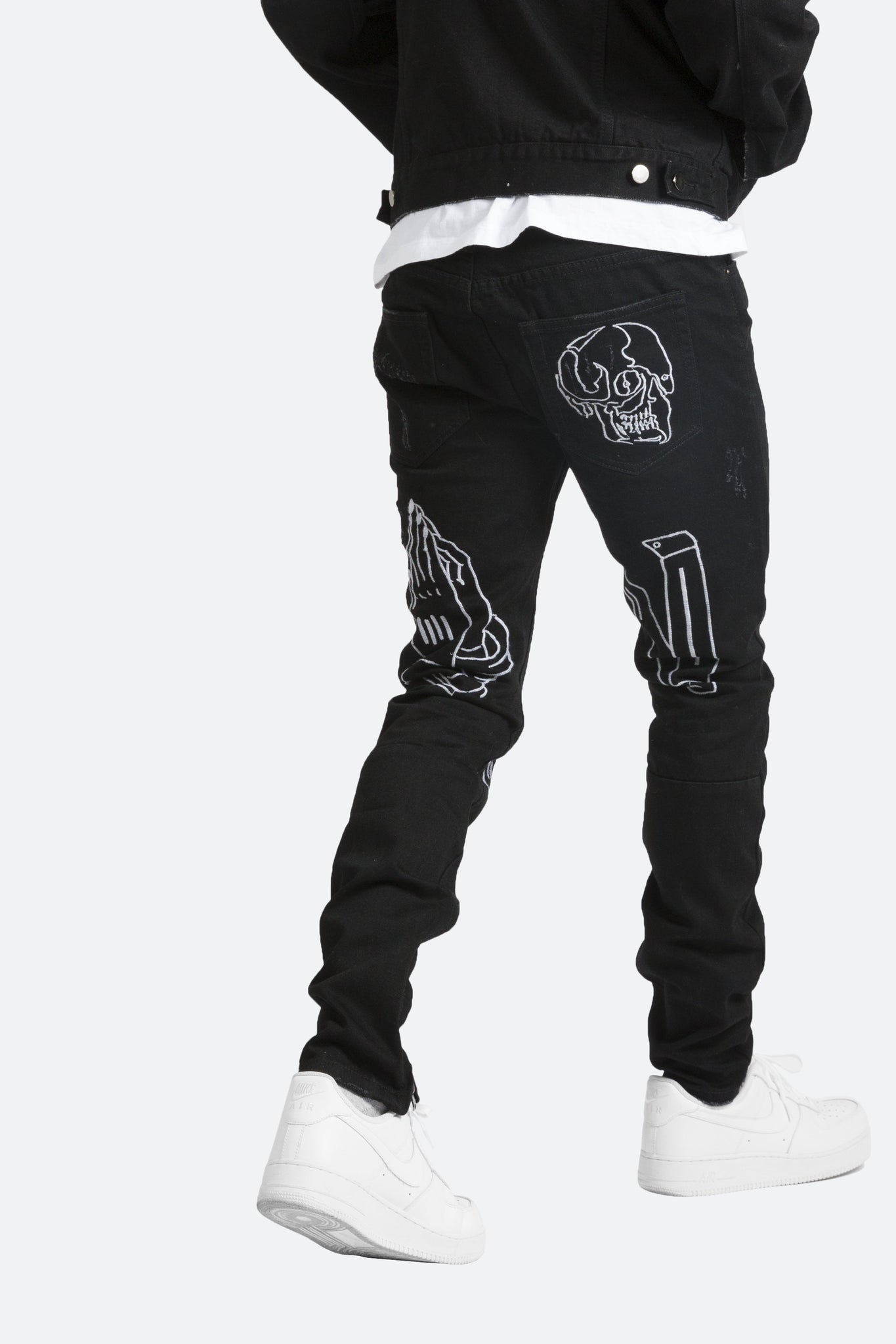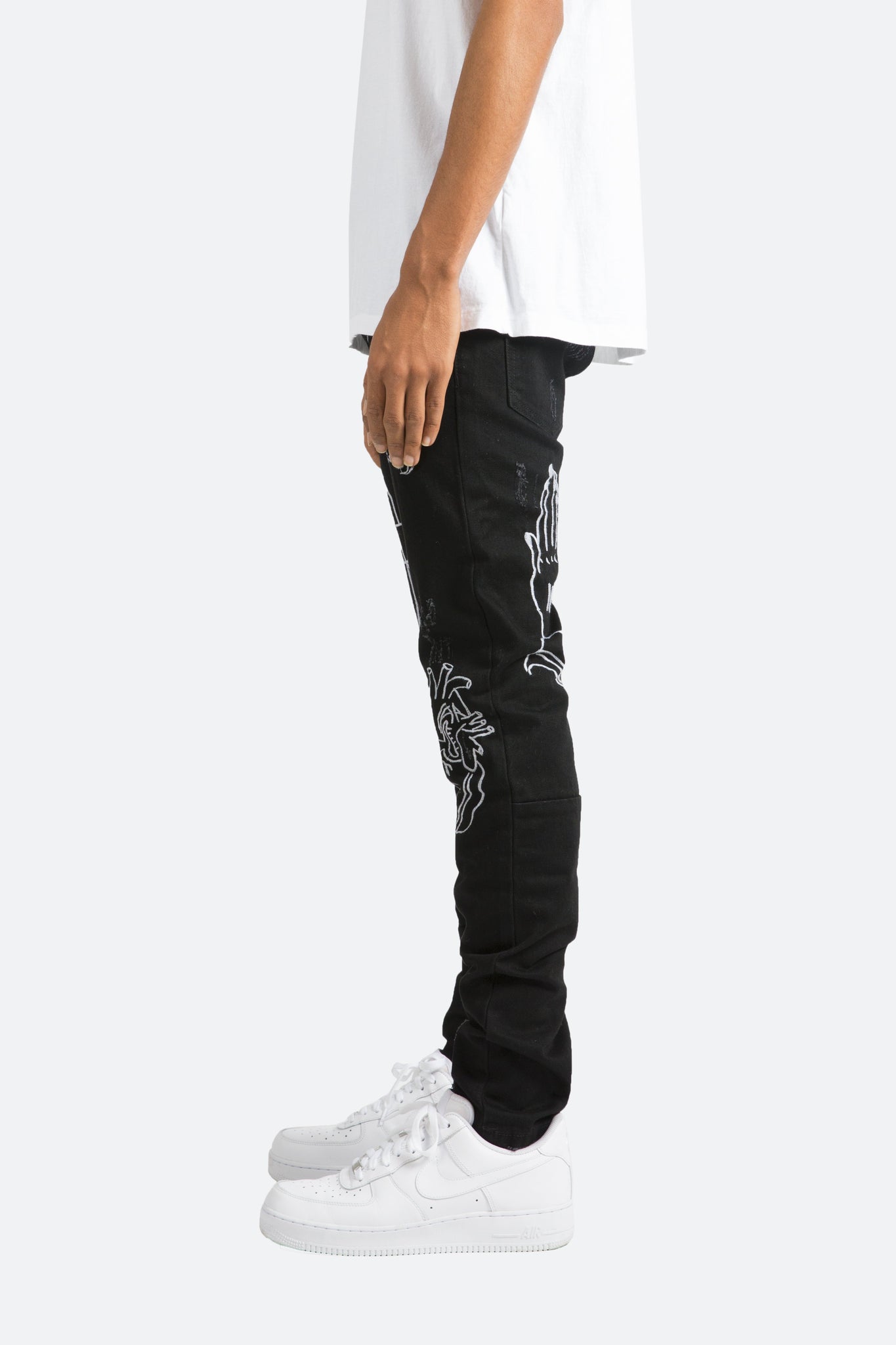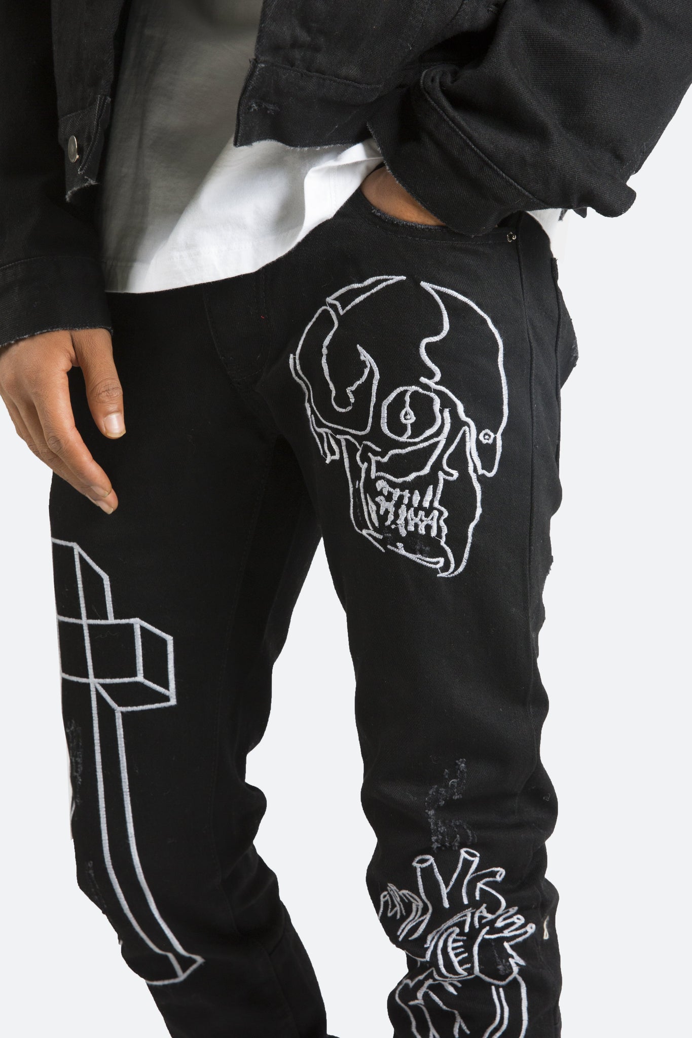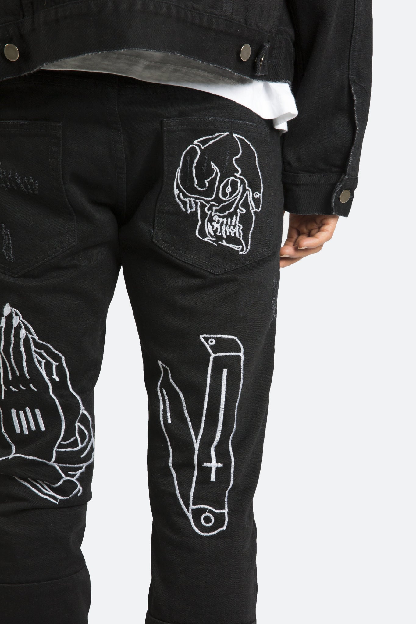 We teamed up with New York artist Terry Urban to recreate his art on our M130 Denim for our first-ever collaboration. Titled "Working Class Hero," the denim is a recreation of denim Terry hand-painted featuring his original designs embroidered throughout.