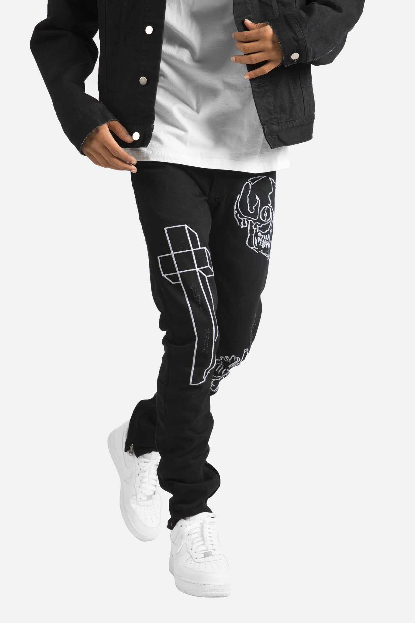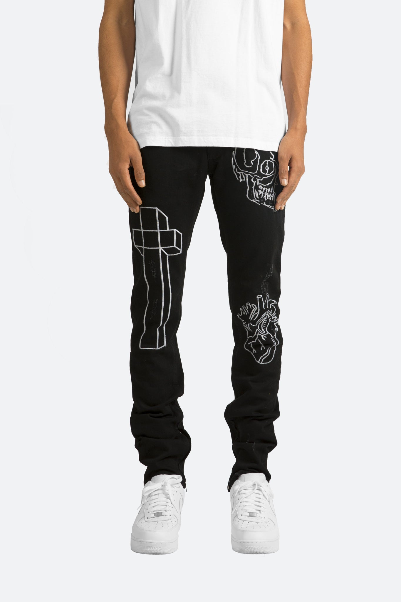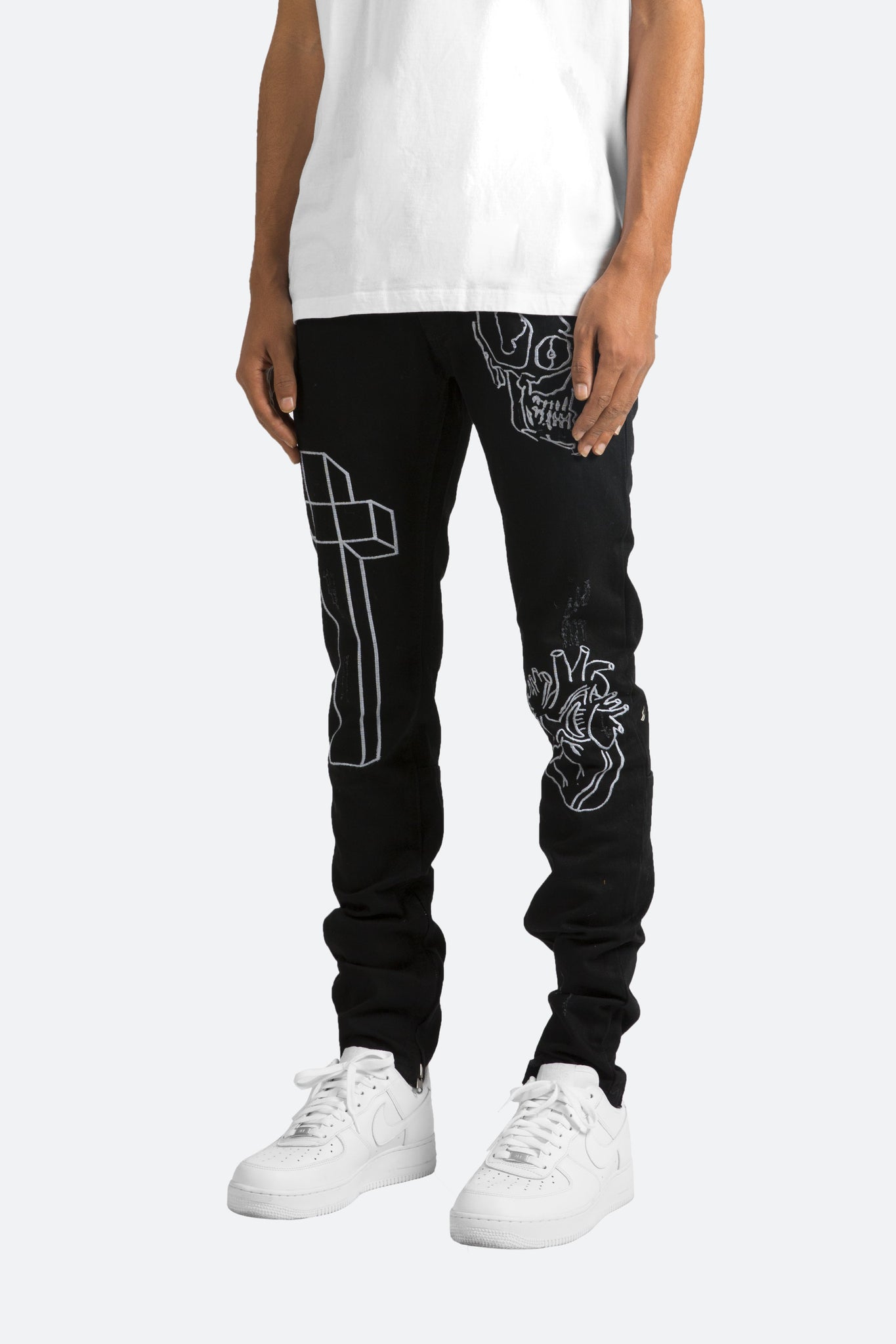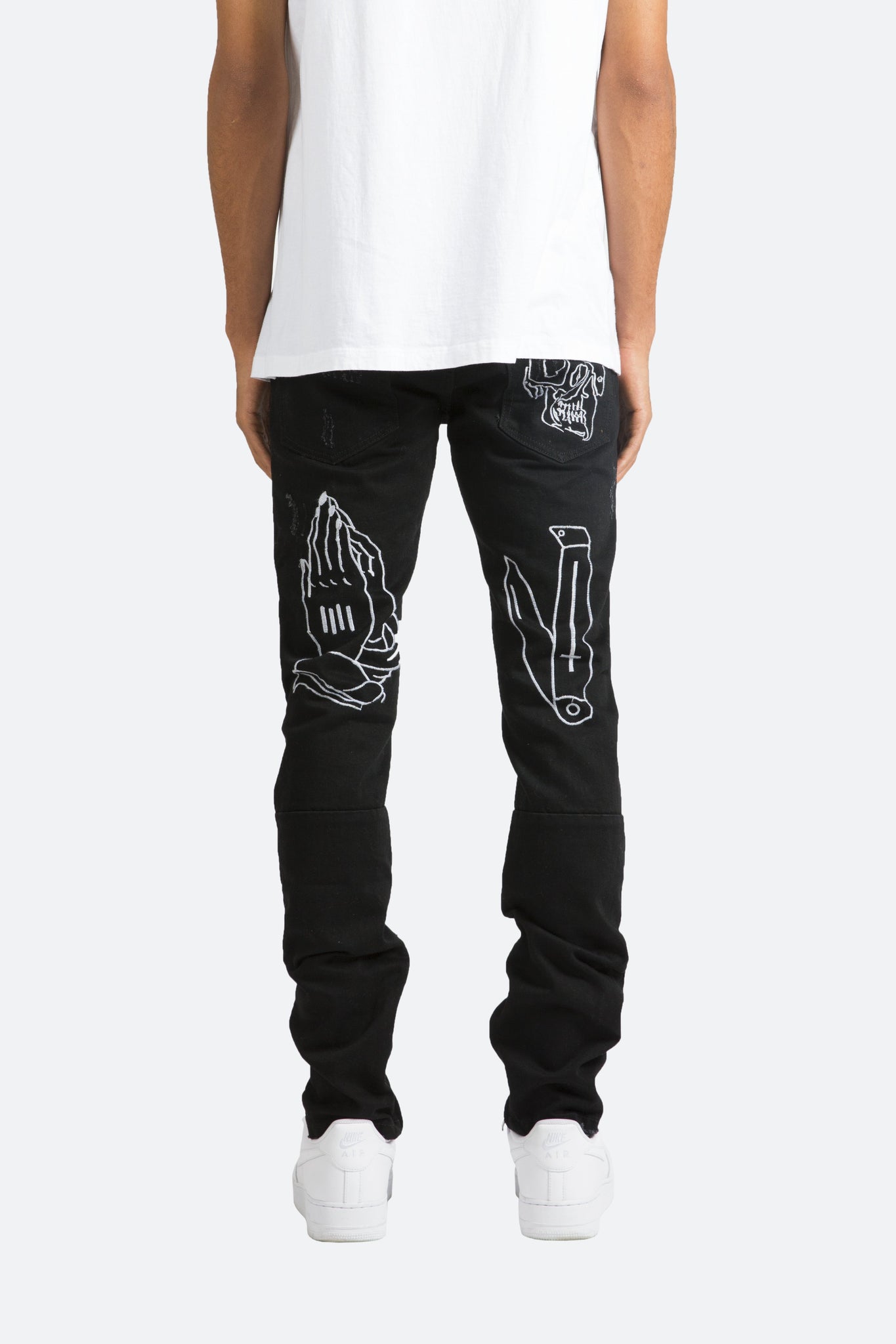 We teamed up with New York artist Terry Urban to recreate his art on our M130 Denim for our first-ever collaboration. Titled "Working Class Hero," the denim is a recreation of denim Terry hand-painted featuring his original designs embroidered throughout.