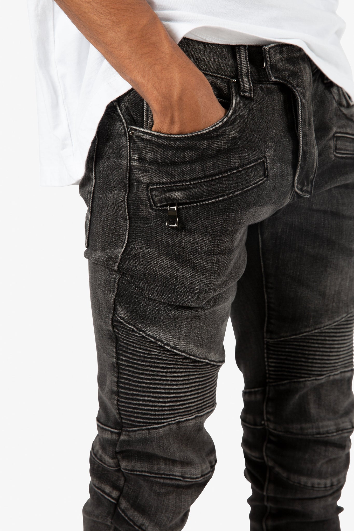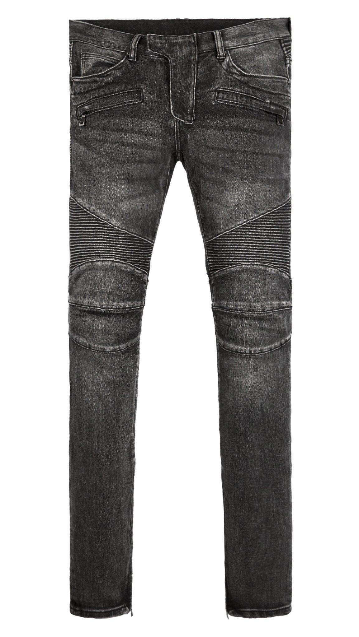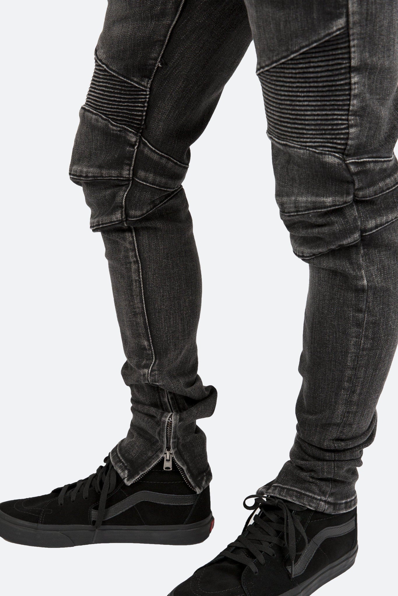 the m14 stretch denim is designed with a relaxed fit through the thigh that tapers from the knee to the ankle, featuring pintuck-stitched moto paneling on the thighs and back yoke, zipper pockets at the upper thigh, and articulated seams at the knees, finishing off with a 10" concealed zipper on the inseam for a carefully optimized fit.