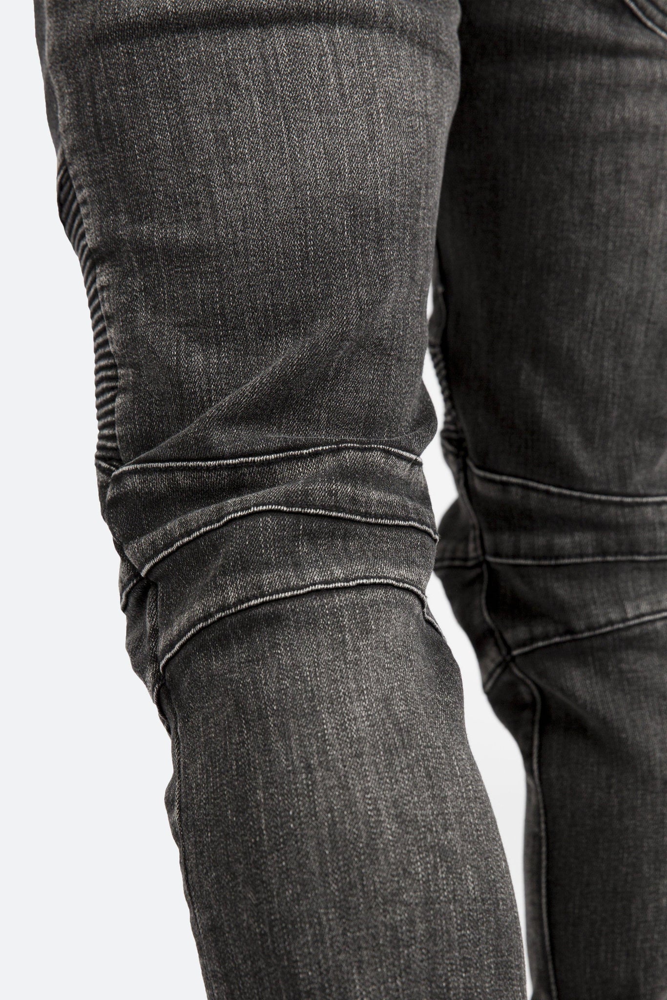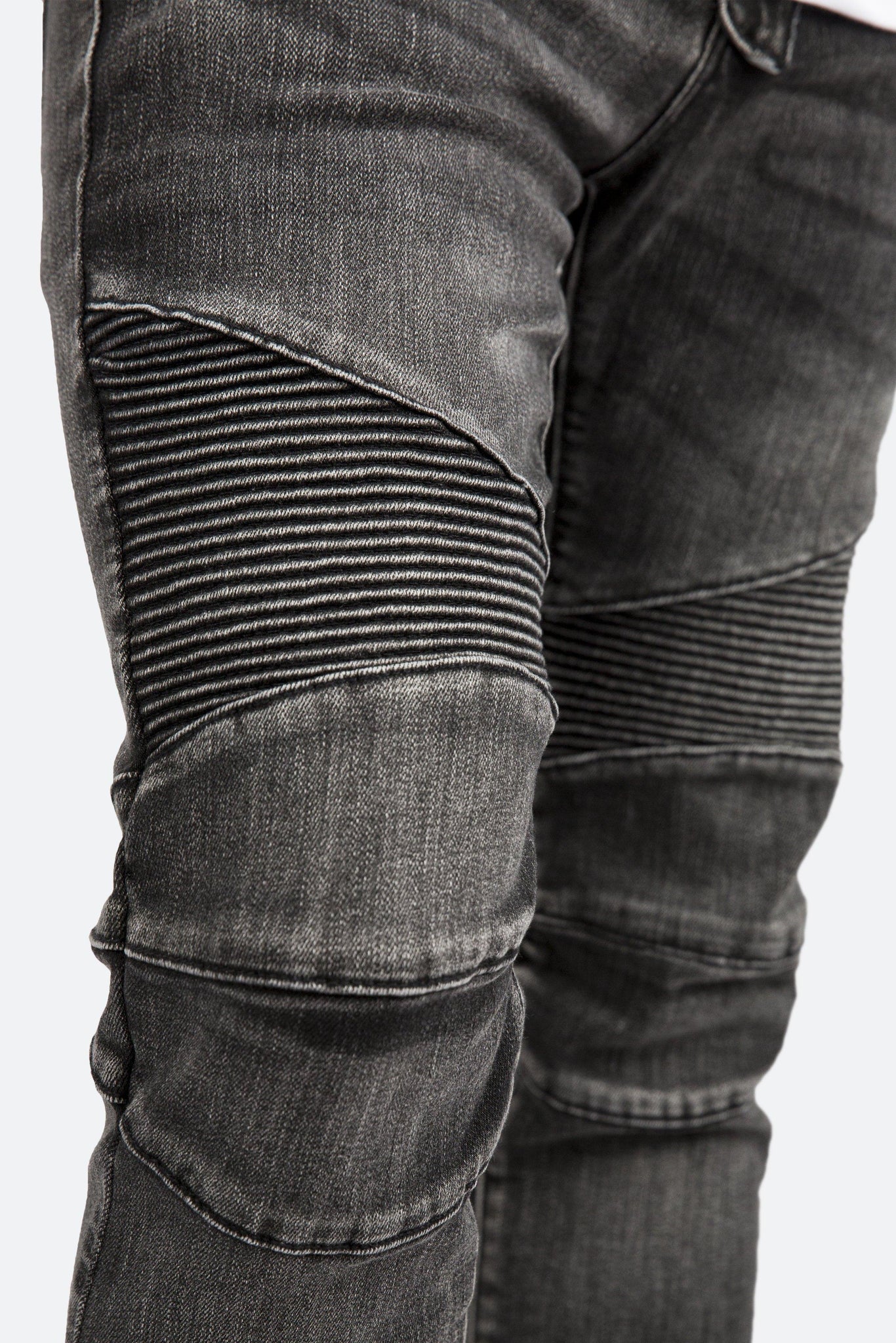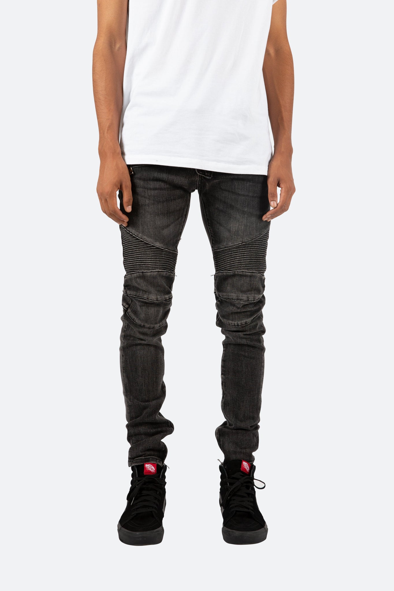 the m14 stretch denim is designed with a relaxed fit through the thigh that tapers from the knee to the ankle, featuring pintuck-stitched moto paneling on the thighs and back yoke, zipper pockets at the upper thigh, and articulated seams at the knees, finishing off with a 10" concealed zipper on the inseam for a carefully optimized fit.