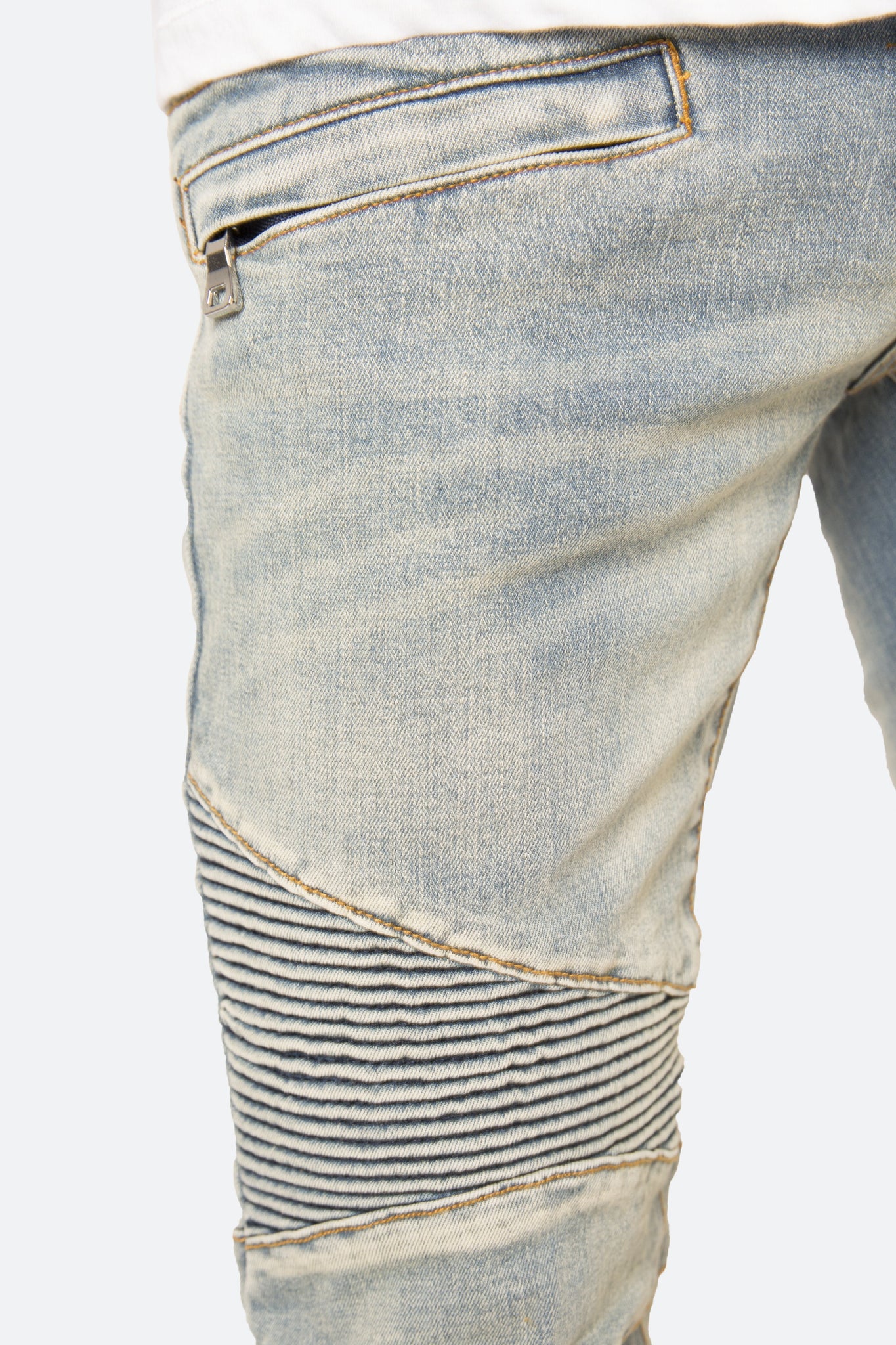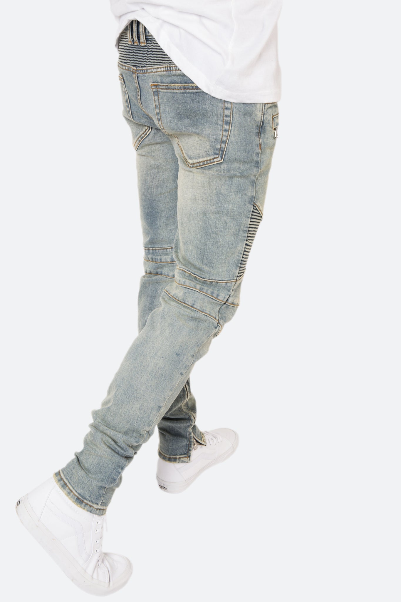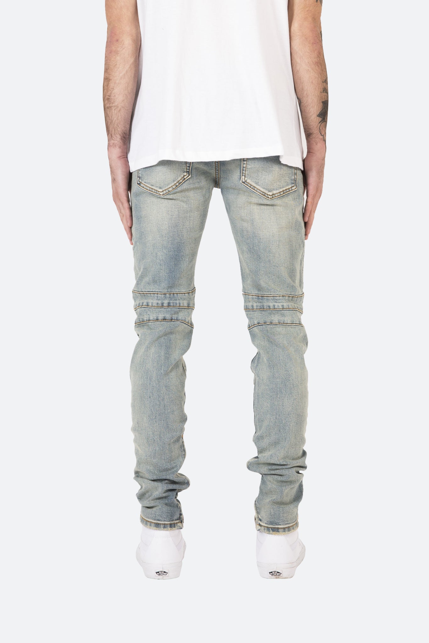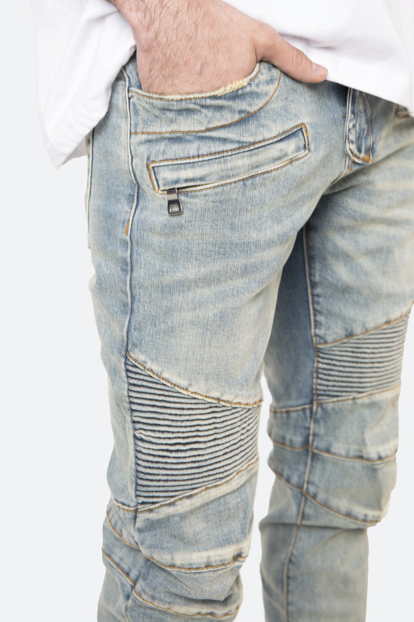 the m14 stretch denim is designed with a relaxed fit through the thigh that tapers from the knee to the ankle, featuring pintuck-stitched moto paneling on the thighs and back yoke, zipper pockets at the upper thigh, and articulated seams at the knees, finishing off with a 10" concealed zipper on the inseam for a carefully optimized fit.