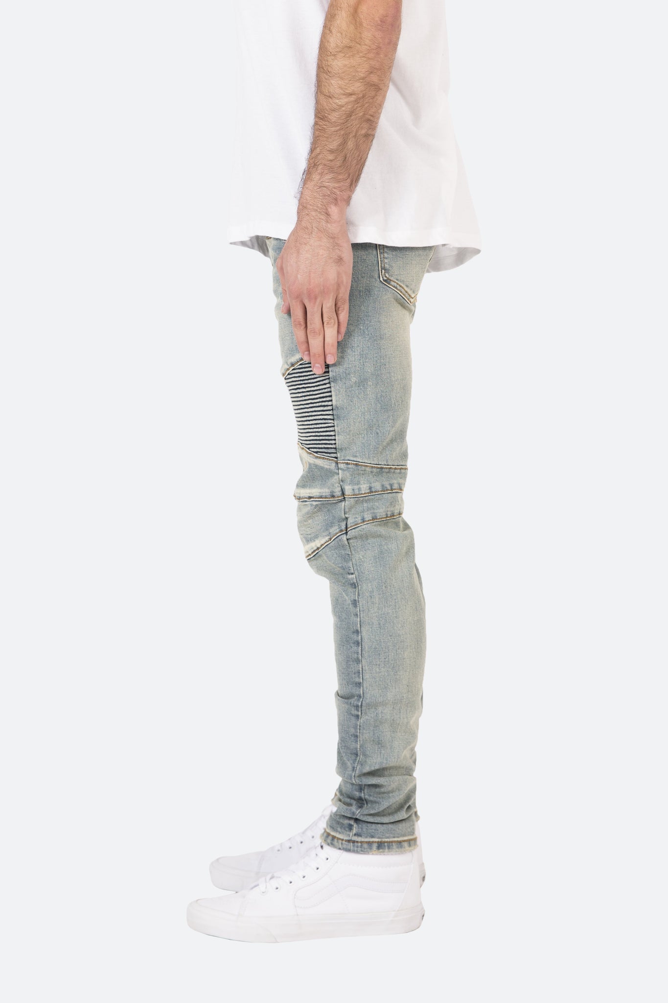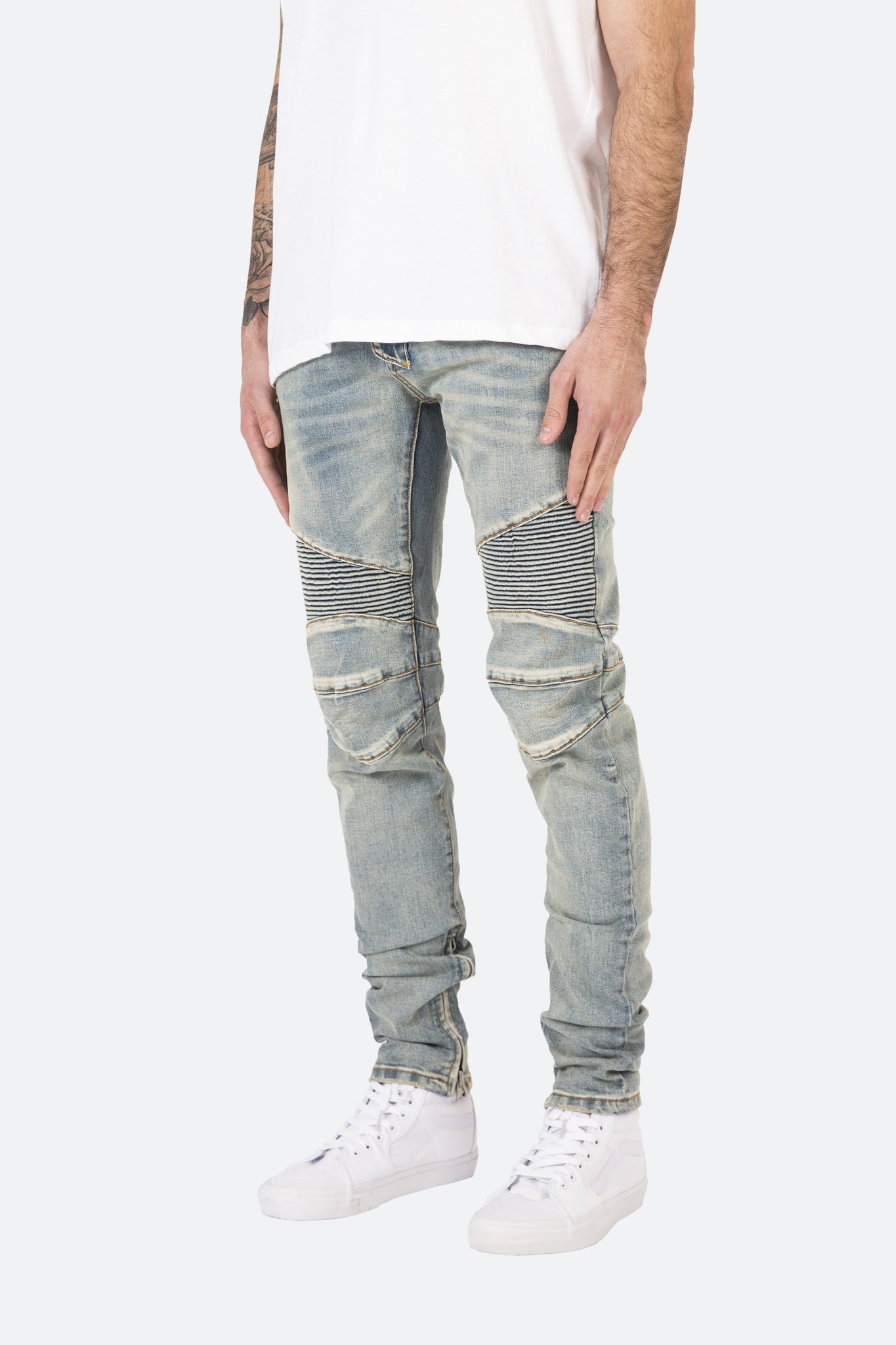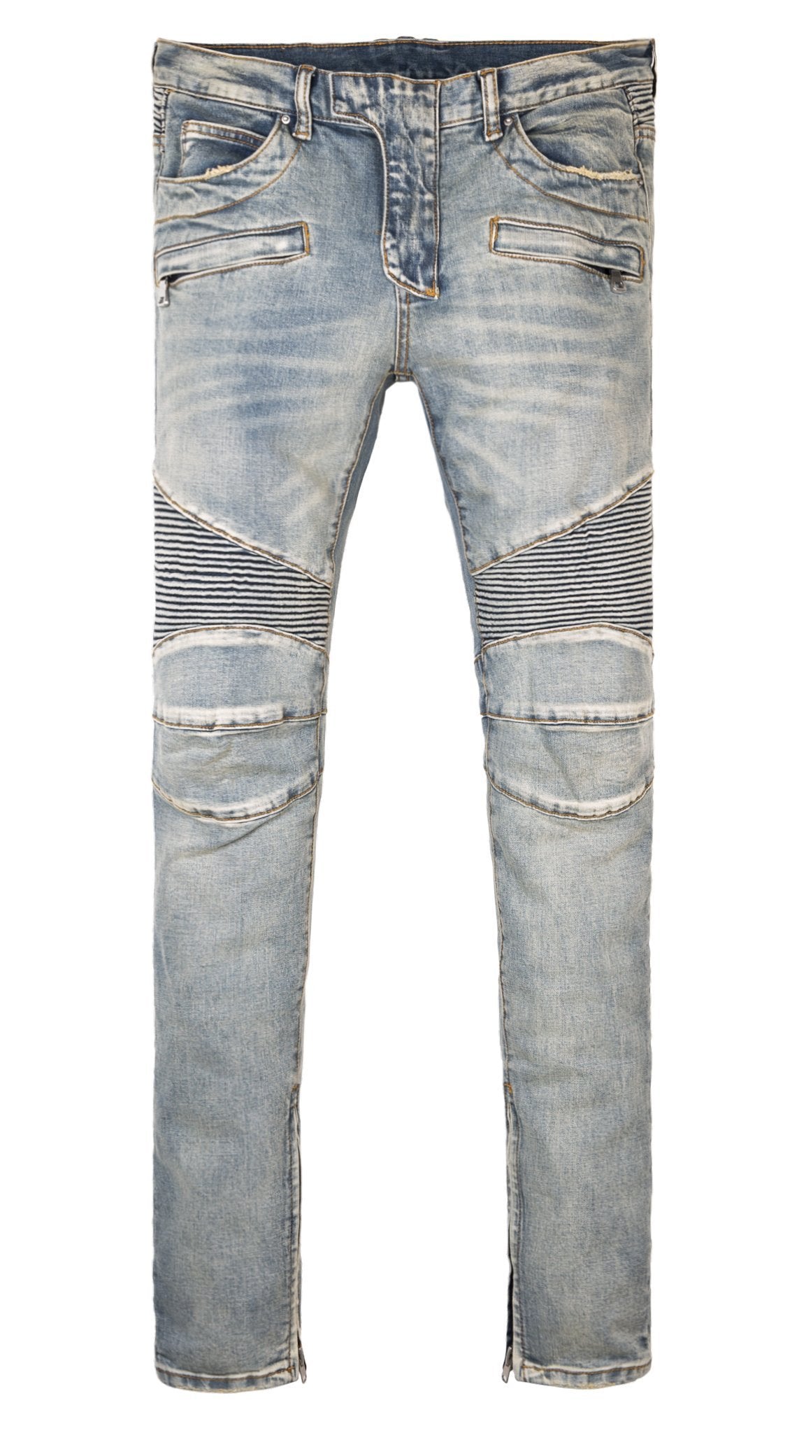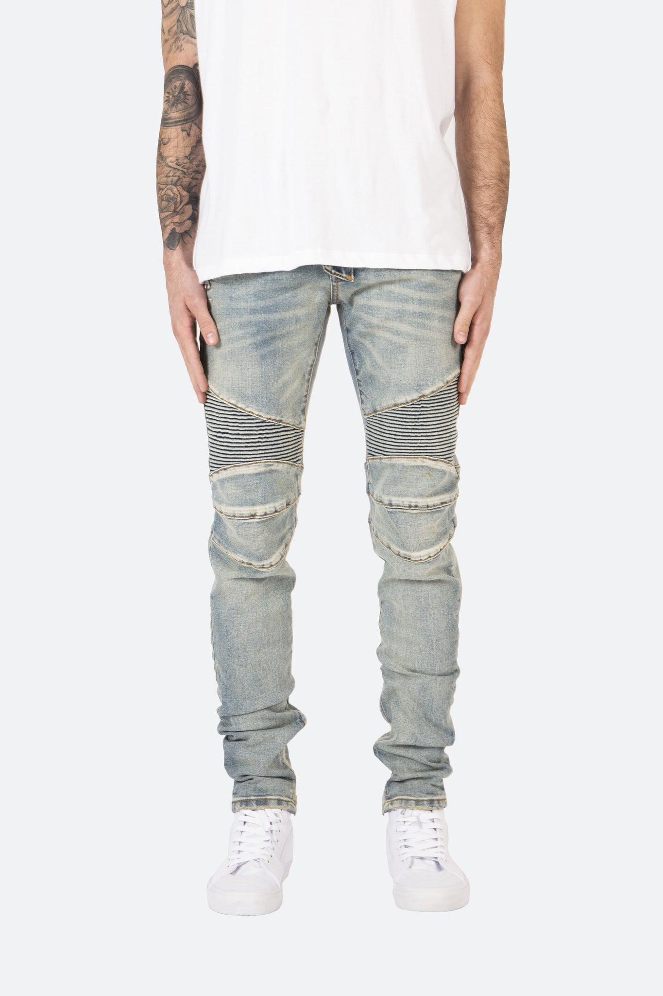 the m14 stretch denim is designed with a relaxed fit through the thigh that tapers from the knee to the ankle, featuring pintuck-stitched moto paneling on the thighs and back yoke, zipper pockets at the upper thigh, and articulated seams at the knees, finishing off with a 10" concealed zipper on the inseam for a carefully optimized fit.