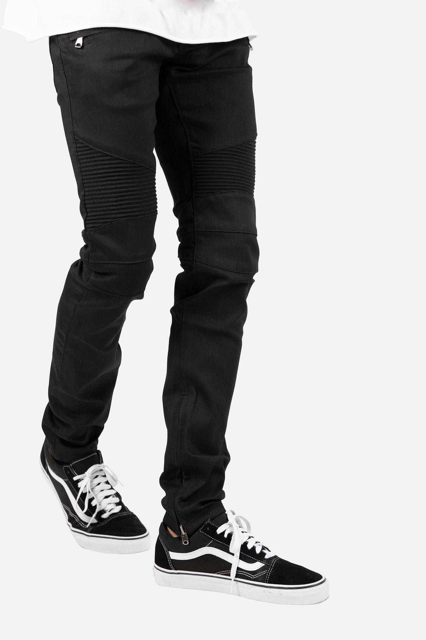 the m14 stretch denim is designed with a relaxed fit through the thigh that tapers from the knee to the ankle, featuring pintuck-stitched moto paneling on the thighs and back yoke, zipper pockets at the upper thigh, and articulated seams at the knees, finishing off with a 10" concealed zipper on the inseam for a carefully optimized fit.