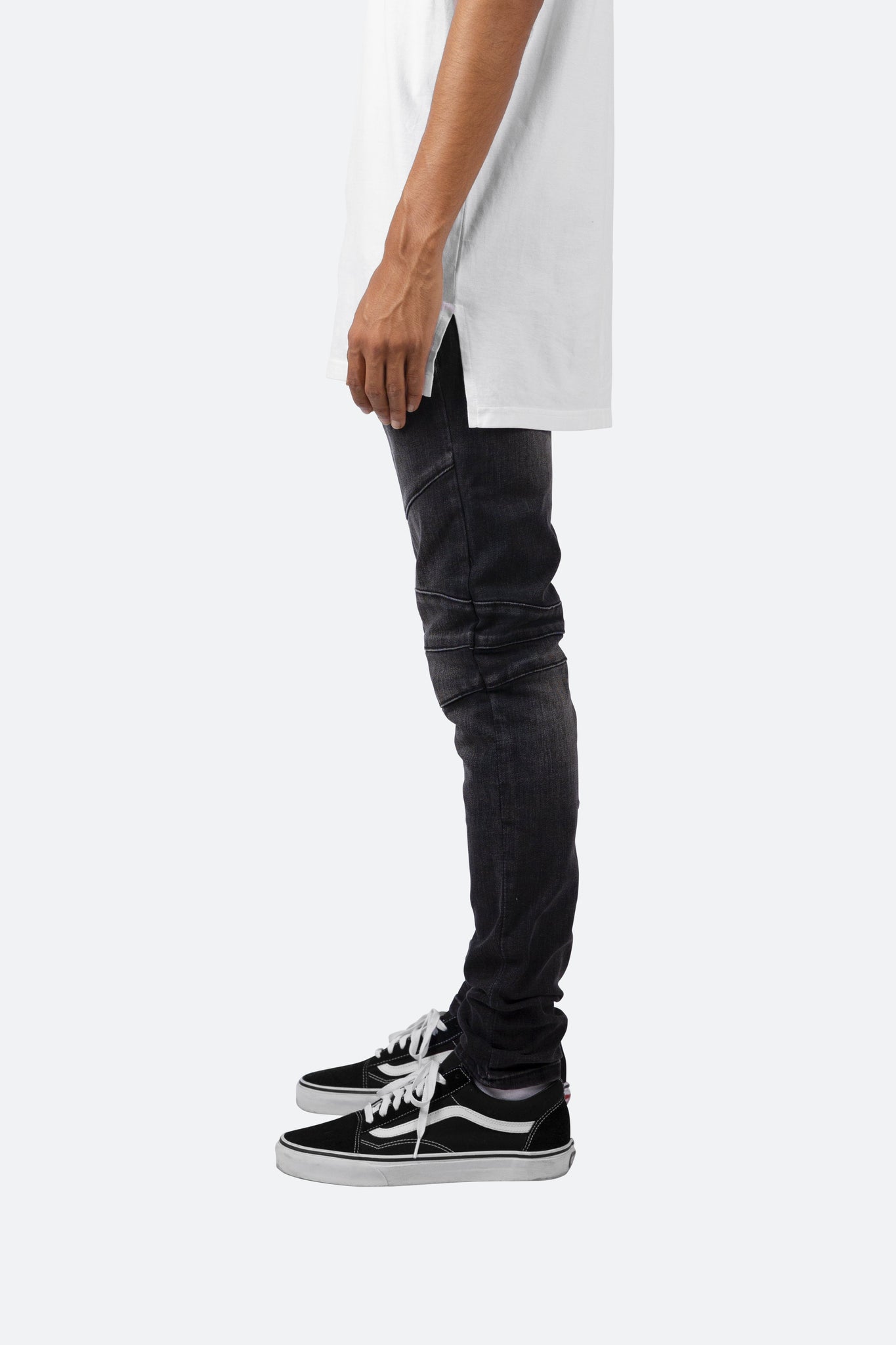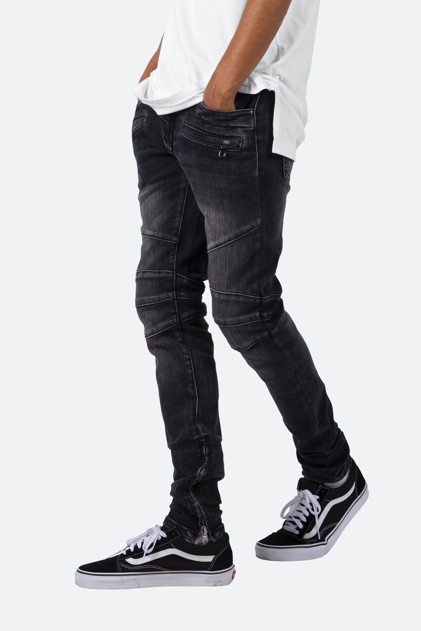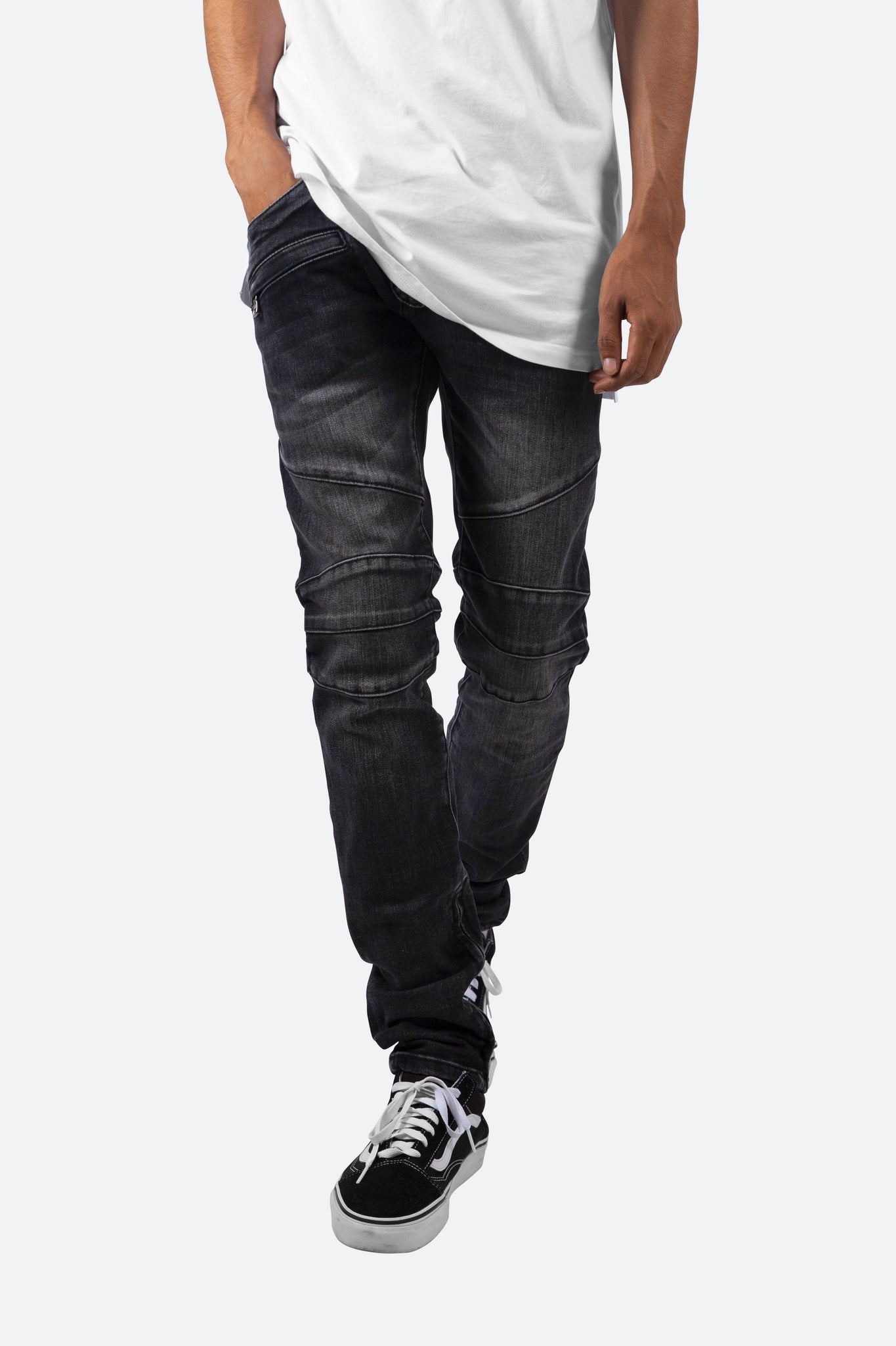 the M171 Stretch Moto Denim is designed with a relaxed fit through the thigh that tapers from the knee to the ankle, featuring moto paneling on the thighs and back yoke, zipper pockets at the upper thigh, and articulated seams at the knees, finishing off with a 10" concealed zipper on the inseam for a carefully optimized fit.