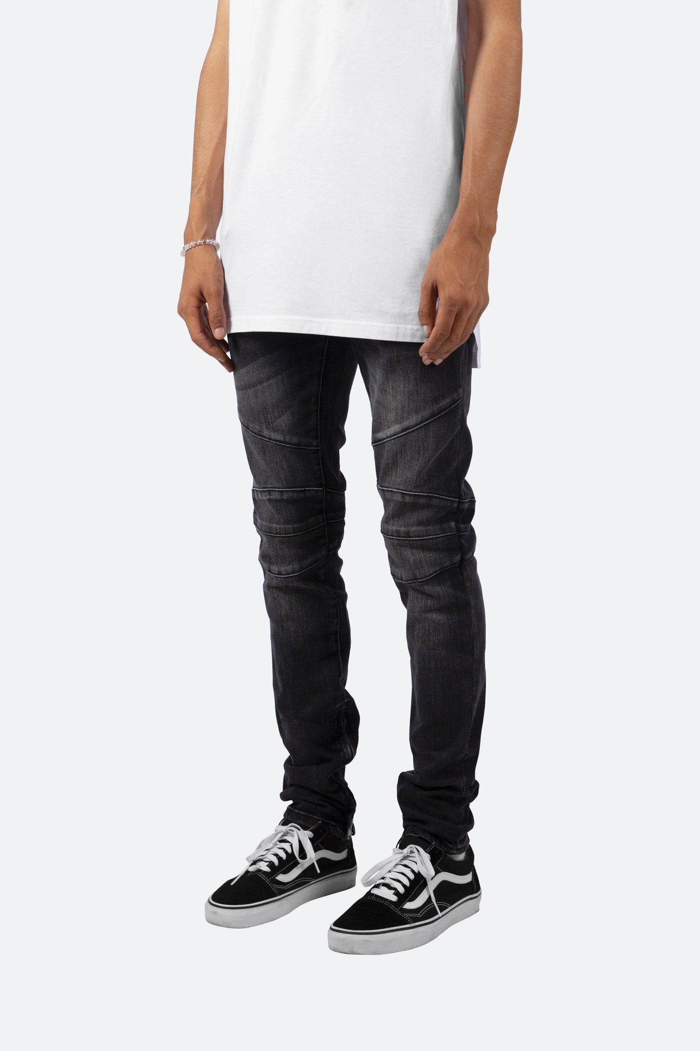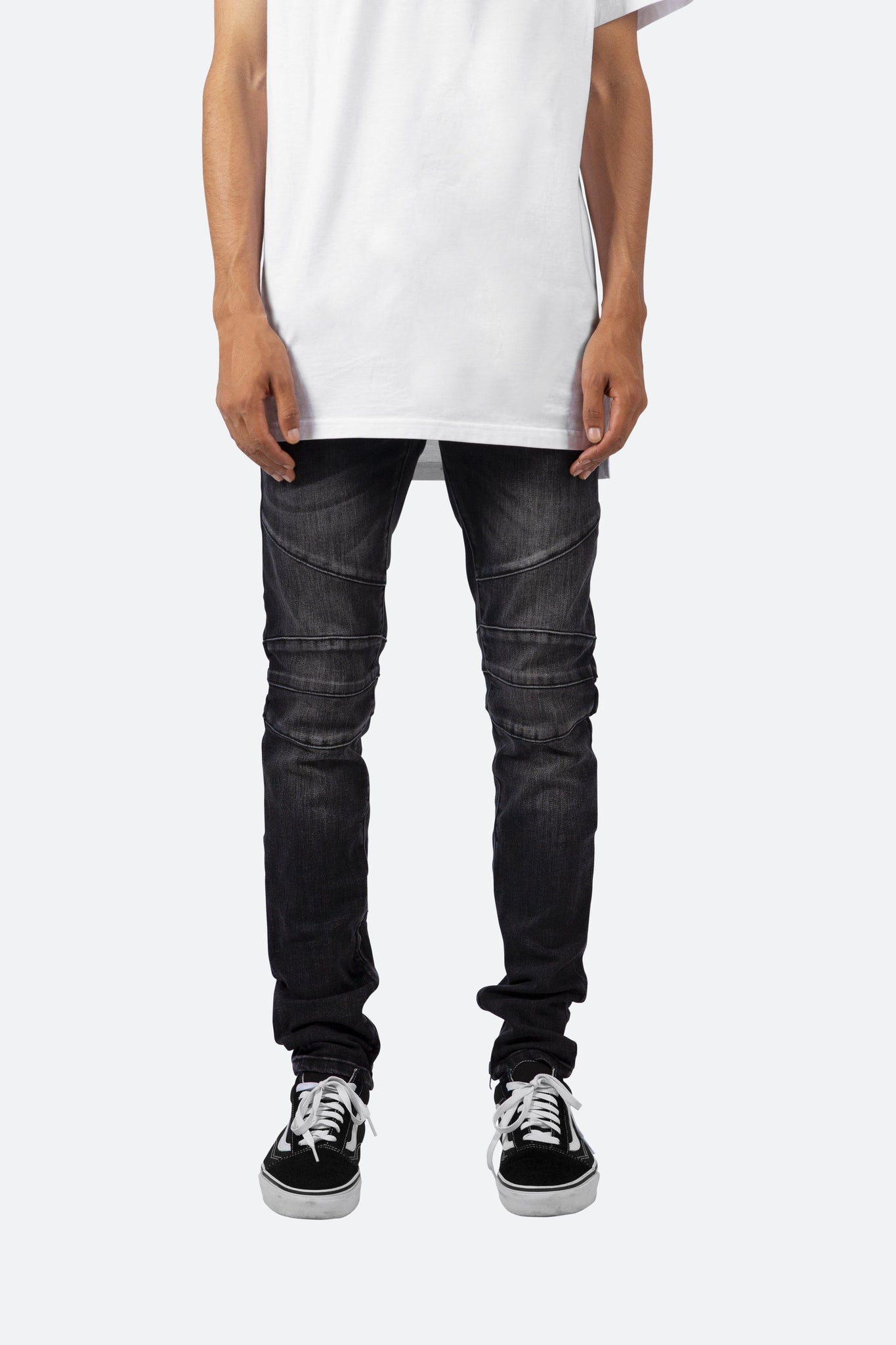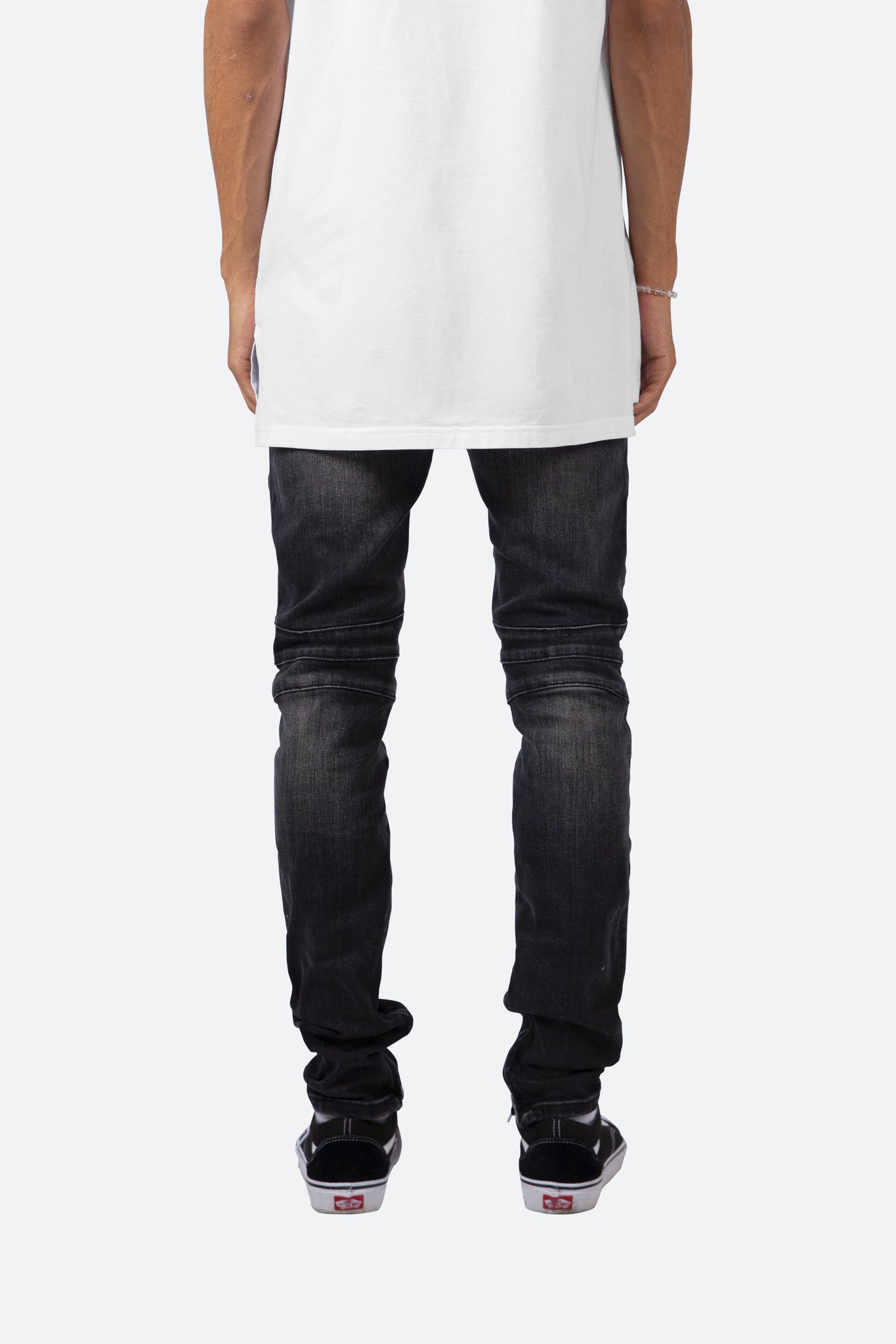 the M171 Stretch Moto Denim is designed with a relaxed fit through the thigh that tapers from the knee to the ankle, featuring moto paneling on the thighs and back yoke, zipper pockets at the upper thigh, and articulated seams at the knees, finishing off with a 10" concealed zipper on the inseam for a carefully optimized fit.