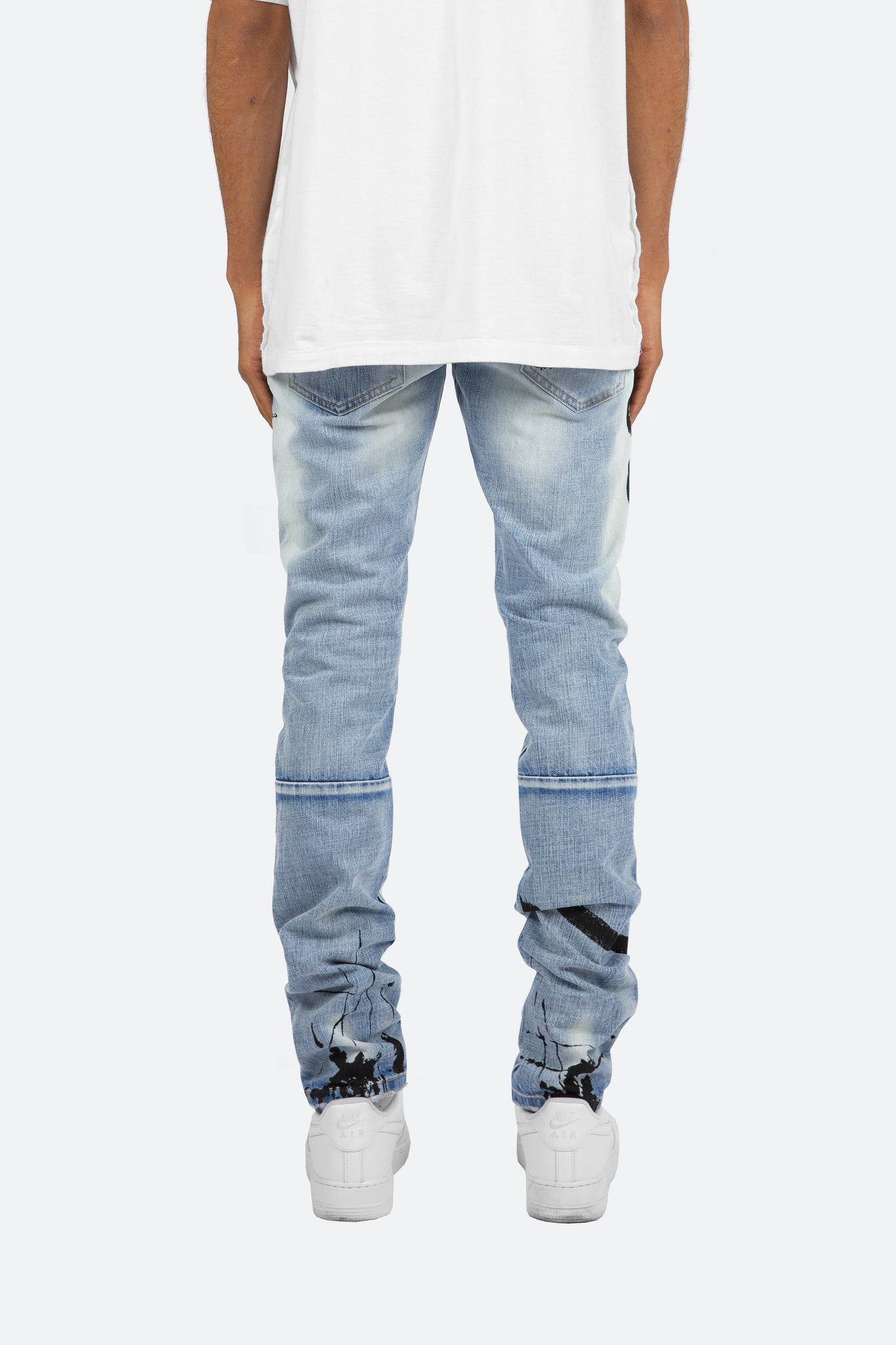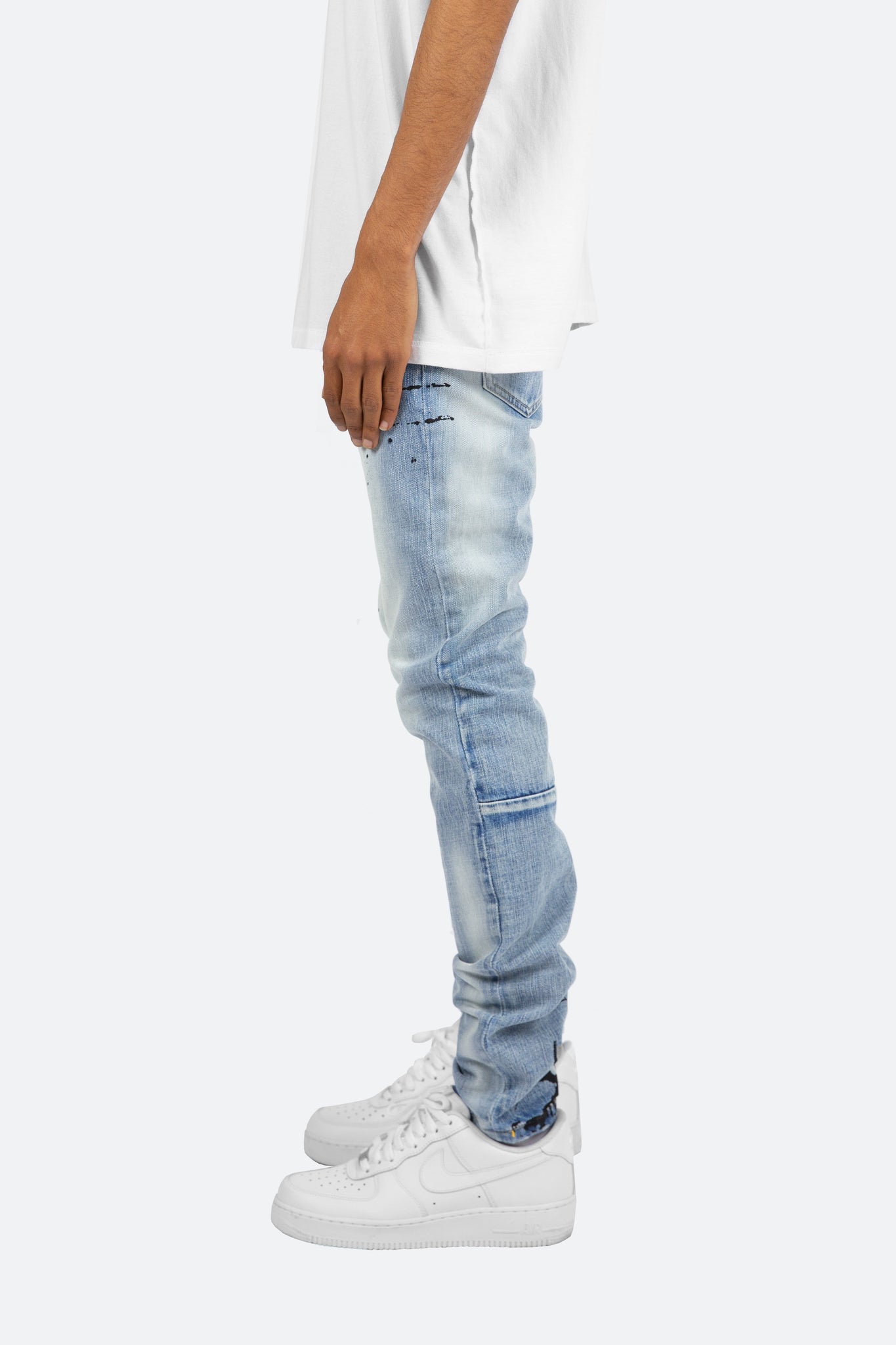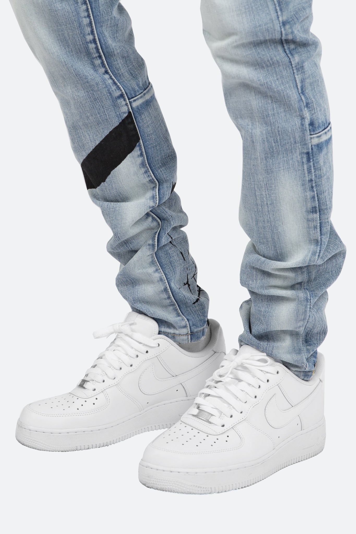 the M306 Denim is part of our new M300 line of zipperless M Denim. The M306 denim features a relaxed fit through the thigh that tapers from the knee to the ankle, light blue wash, and finished with black paint throughout.
