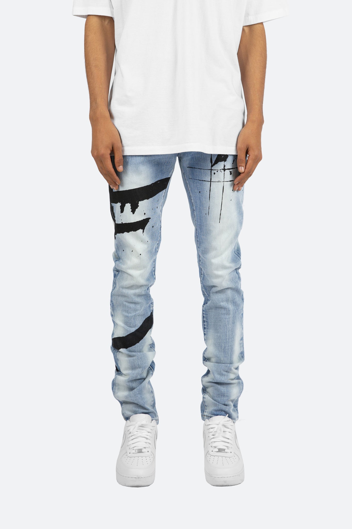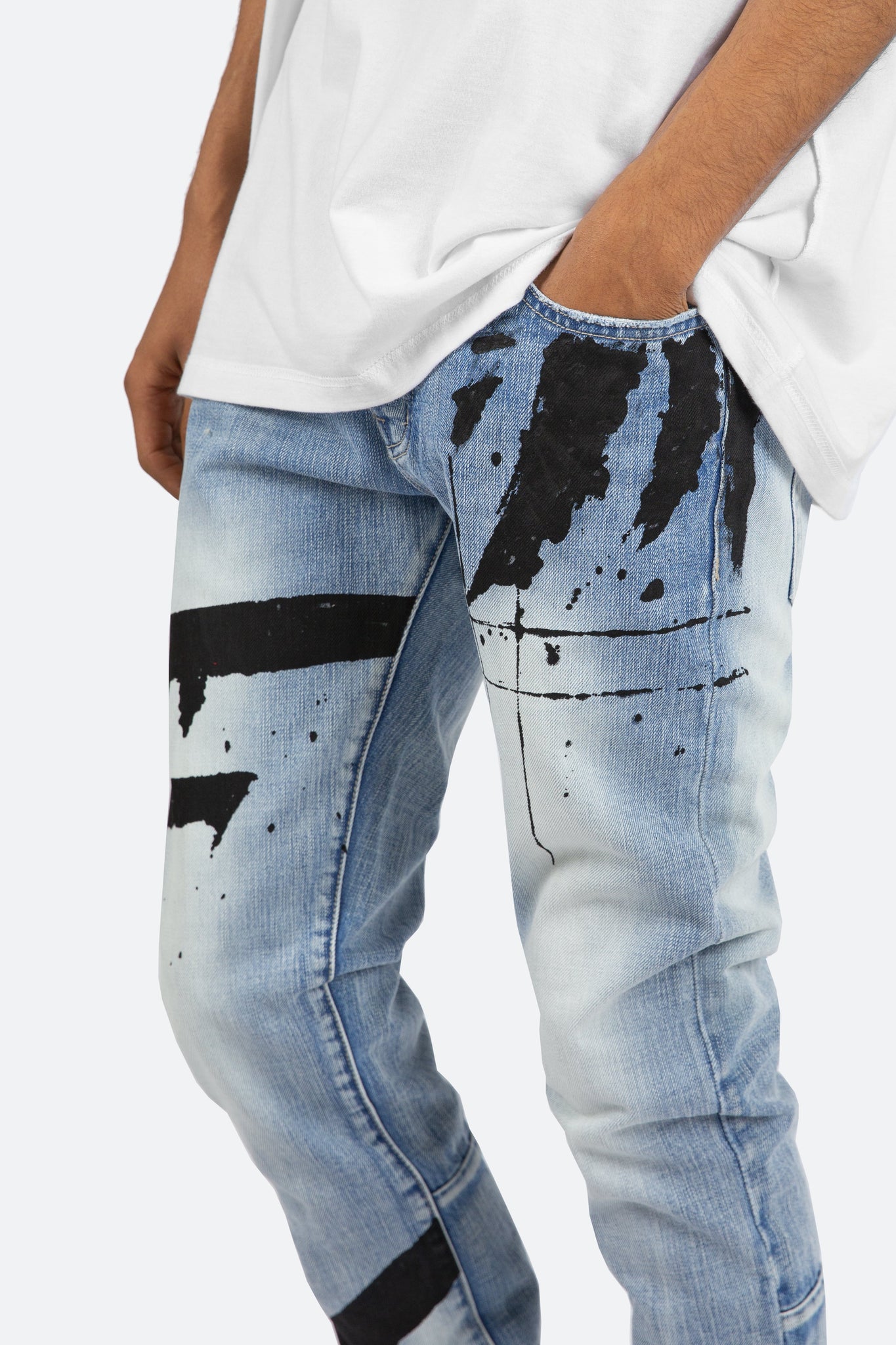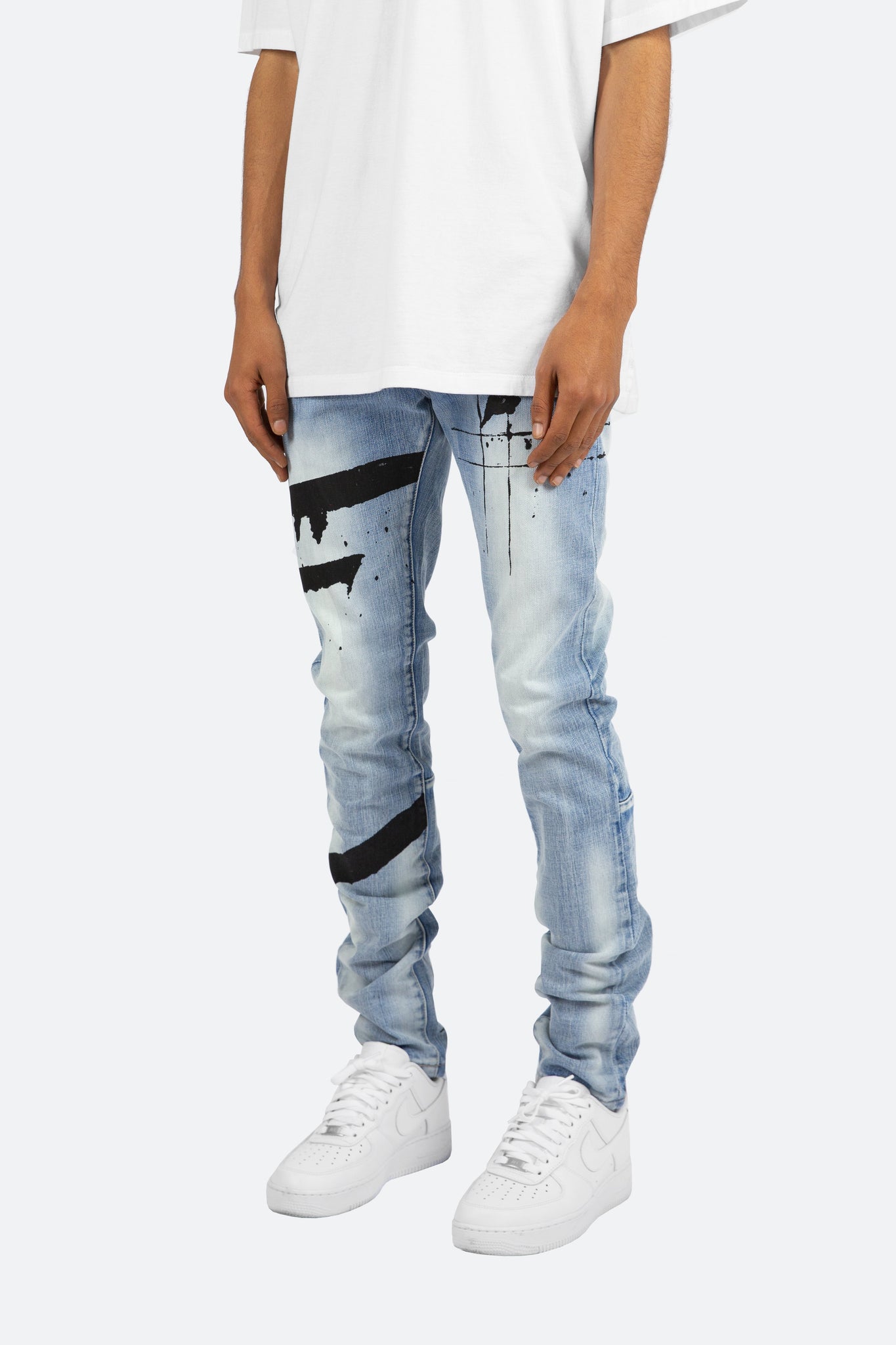 the M306 Denim is part of our new M300 line of zipperless M Denim. The M306 denim features a relaxed fit through the thigh that tapers from the knee to the ankle, light blue wash, and finished with black paint throughout.