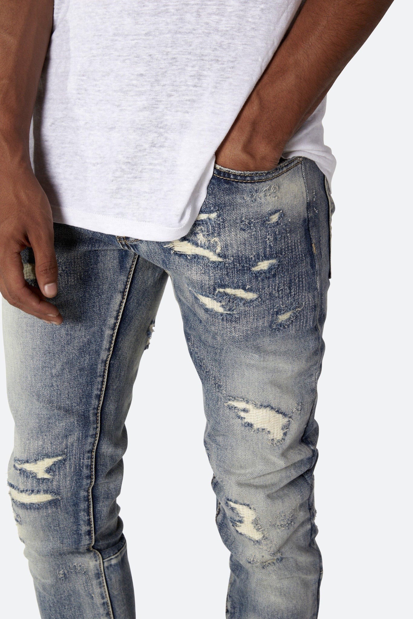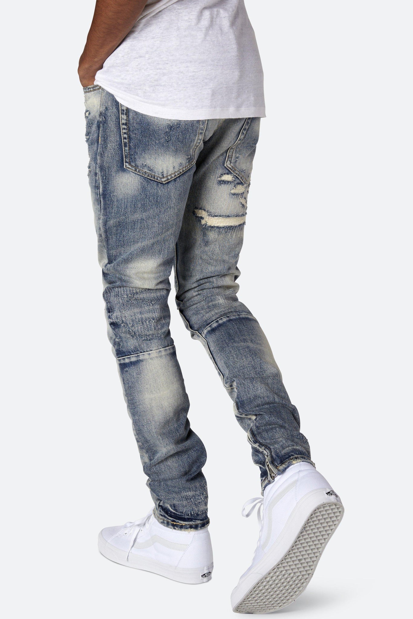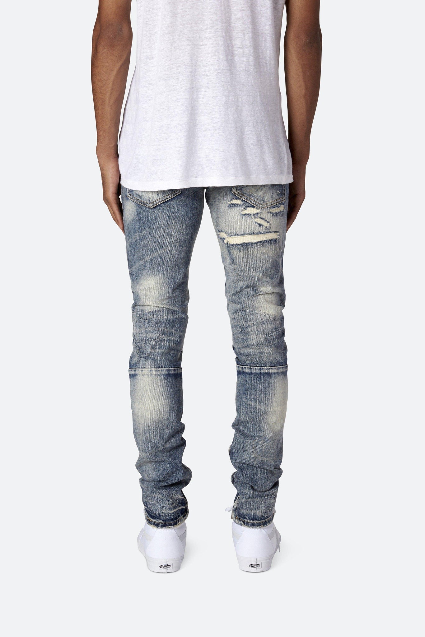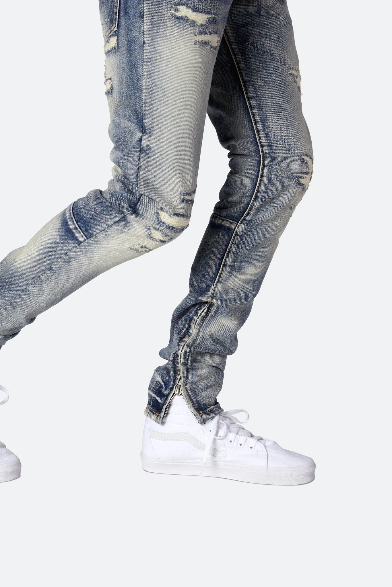 Developed in Los Angeles, the blue M41 Denim is designed with a relaxed fit through the thigh that tapers from the knee to the ankle, with repaired distressing details throughout with a medium wash, finishing off with a 10" concealed zipper on the inseam and a rear calf panel for a carefully optimized fit.