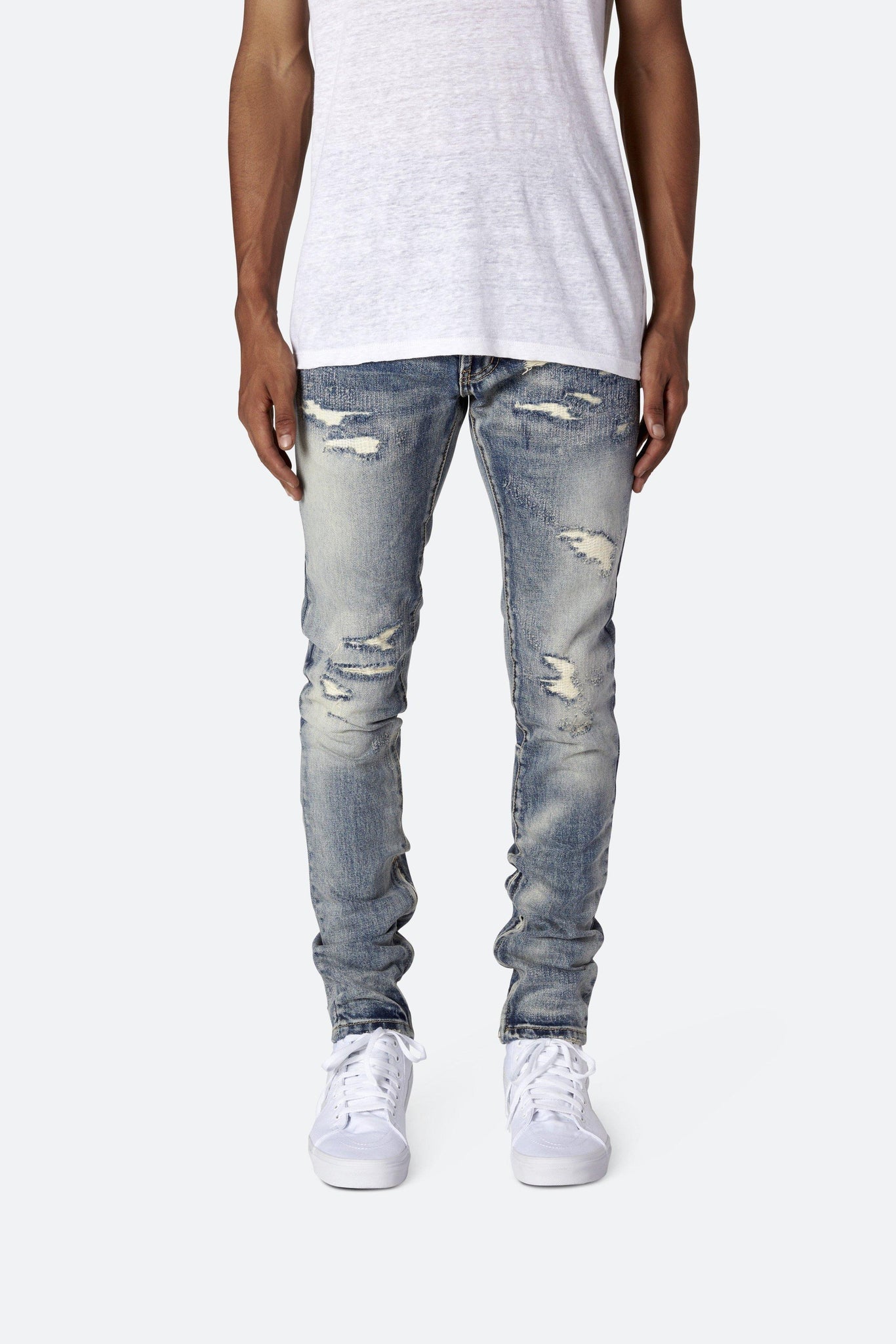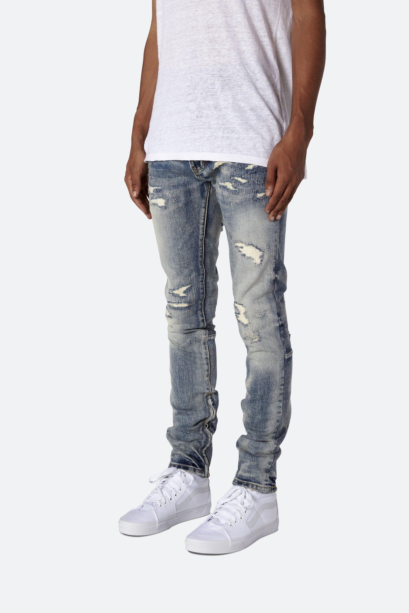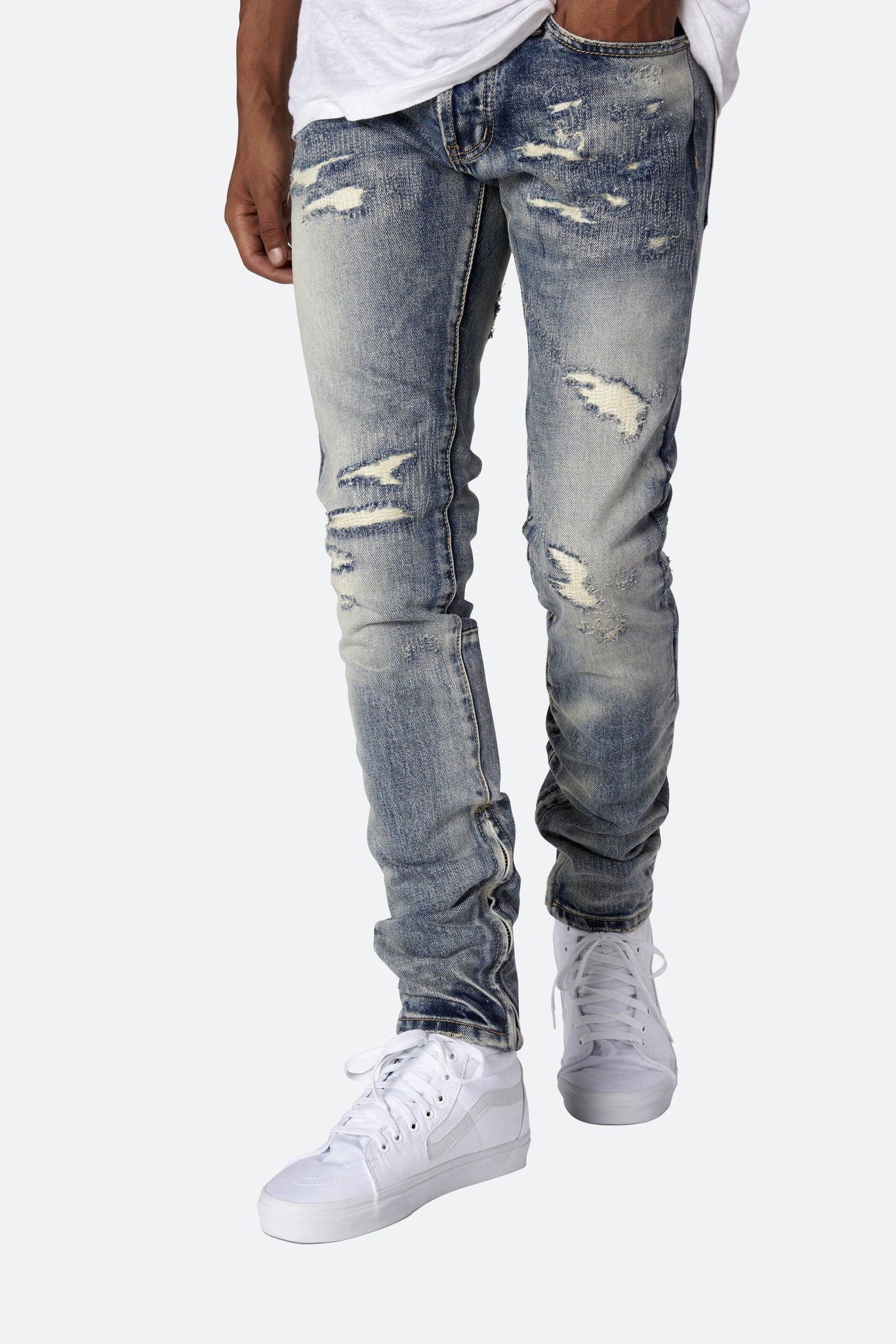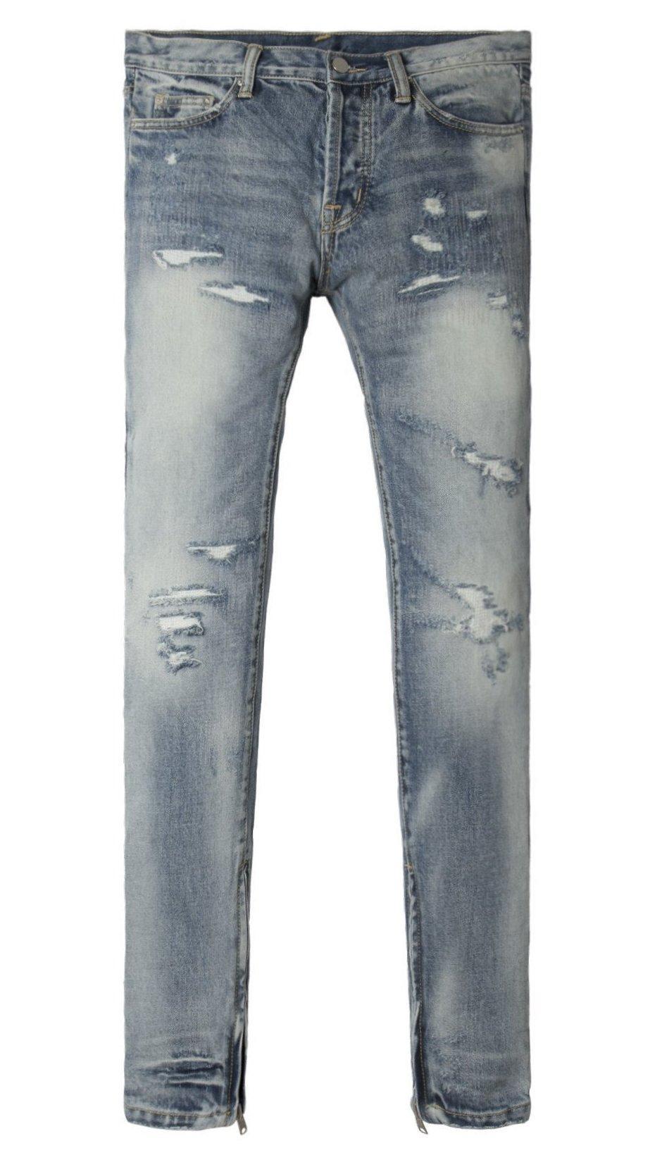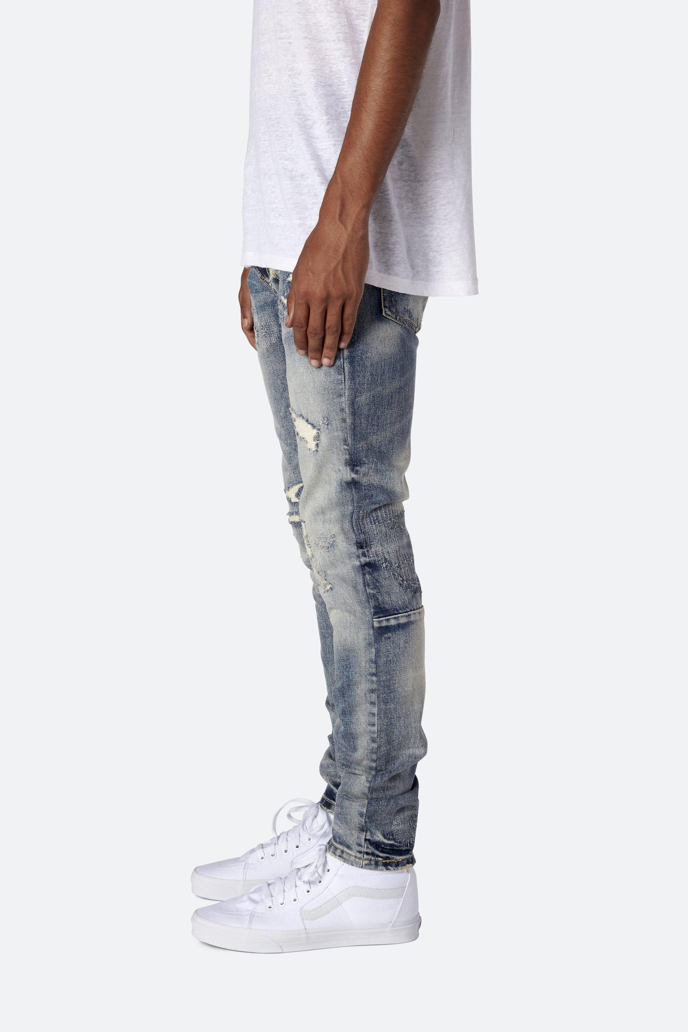 Developed in Los Angeles, the blue M41 Denim is designed with a relaxed fit through the thigh that tapers from the knee to the ankle, with repaired distressing details throughout with a medium wash, finishing off with a 10" concealed zipper on the inseam and a rear calf panel for a carefully optimized fit.