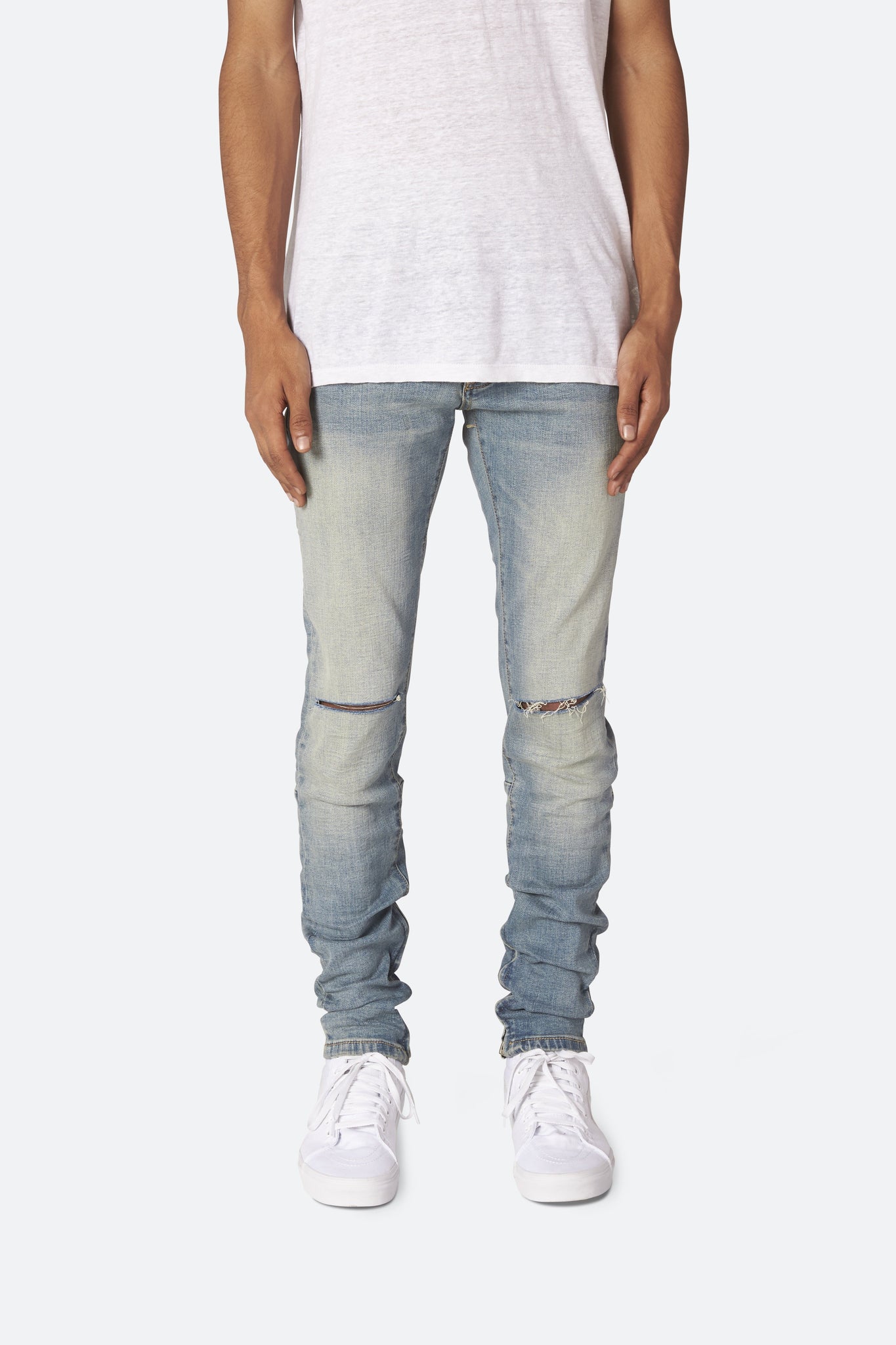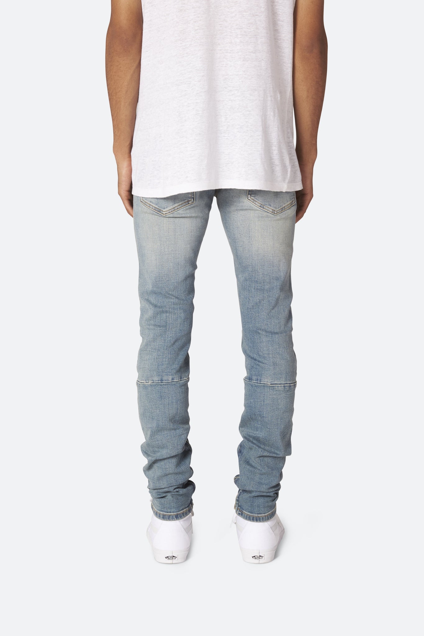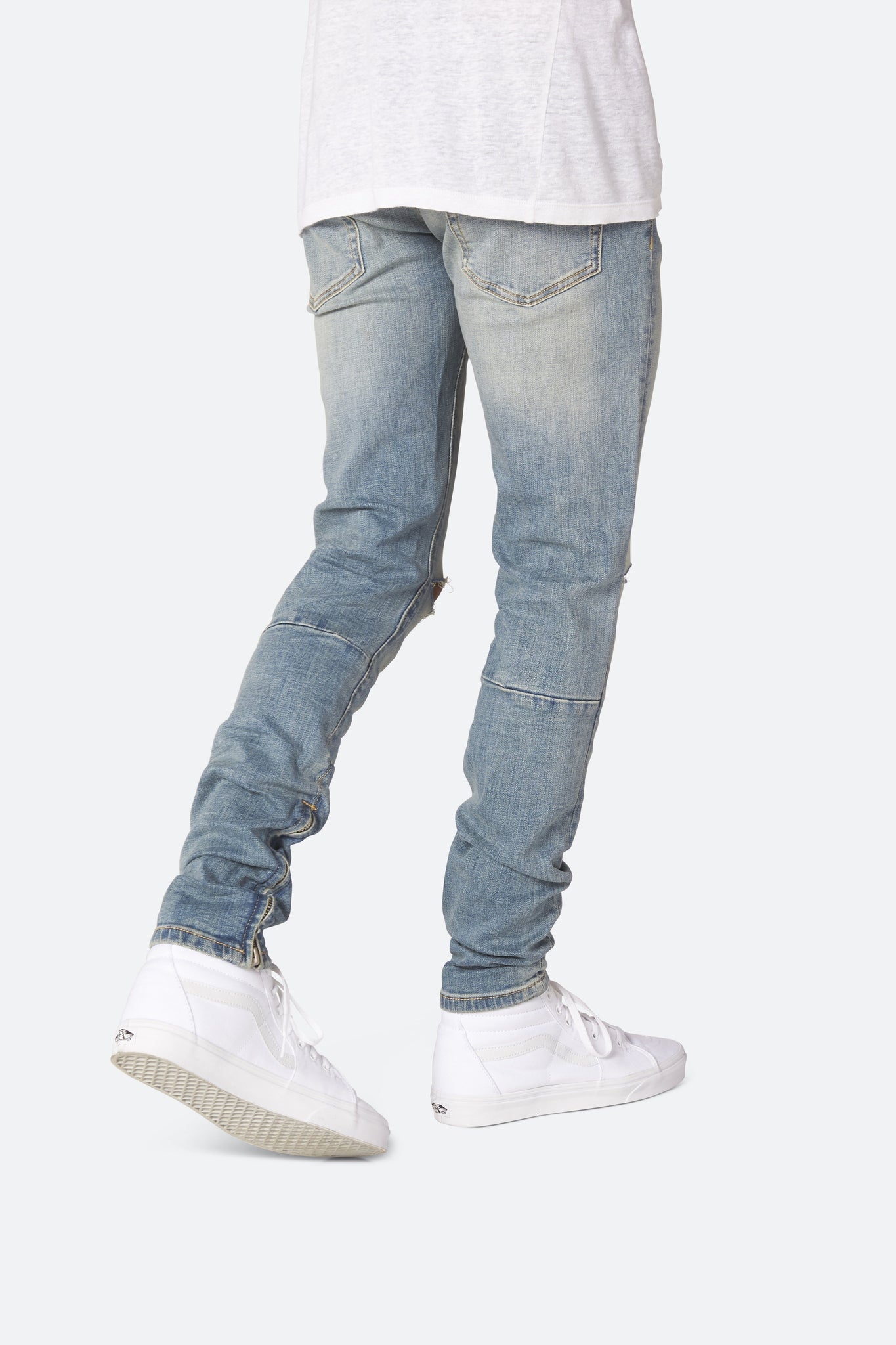 Developed in Los Angeles, the blue M6 Stretch Denim is designed with a relaxed fit through the thigh that tapers from the knee to the ankle, with a distress detail at the knee and a warm wash throughout, finishing off with a 10" concealed zipper on the inseam and a rear calf panel for a carefully optimized fit.
