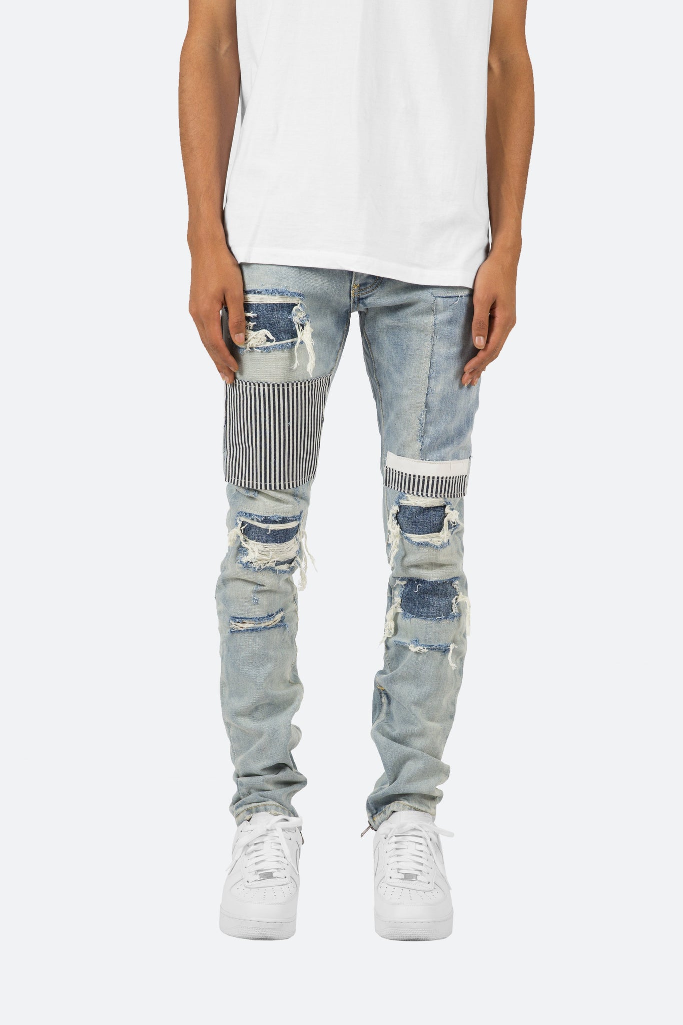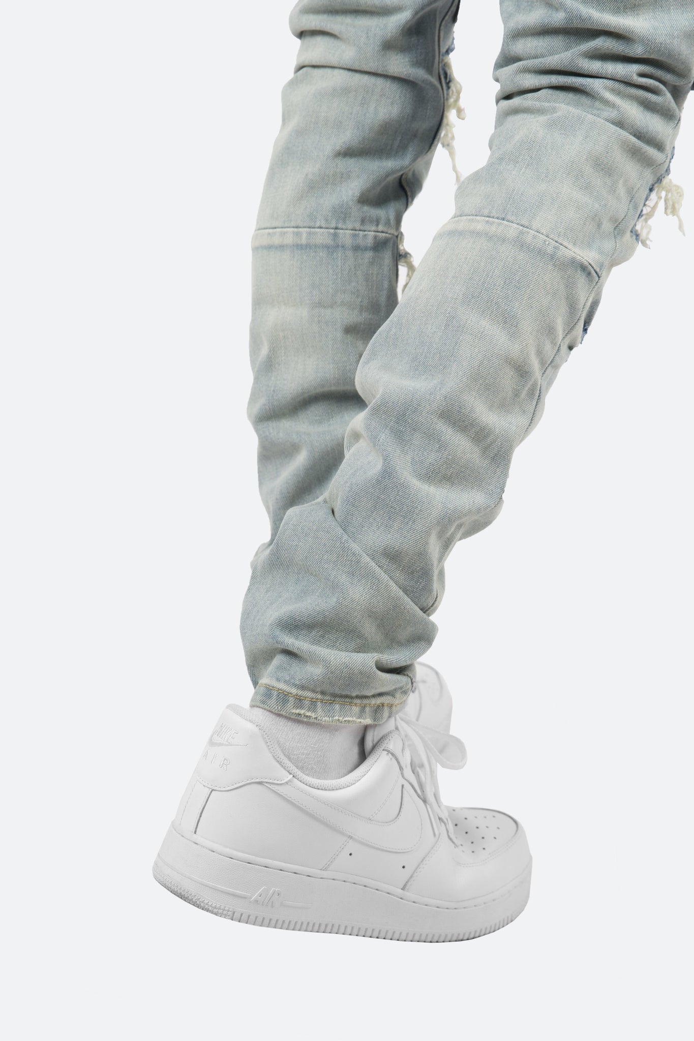 the m74 denim is designed with a relaxed fit through the thigh that tapers from the knee to the ankle, with distressed and repaired details throughout, finishing off with a 10" concealed zipper on the inseam and a rear calf panel for a carefully optimized fit.
