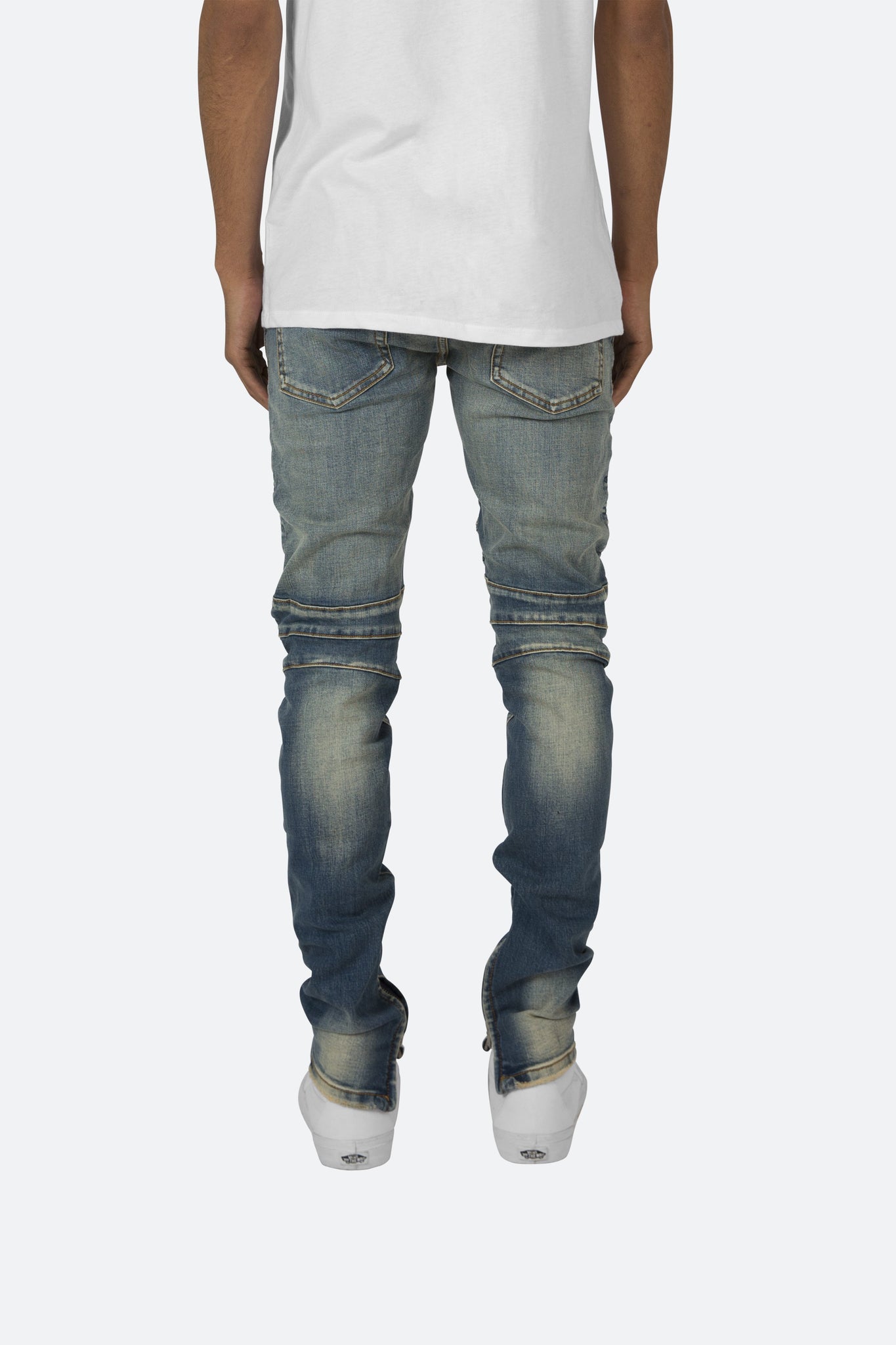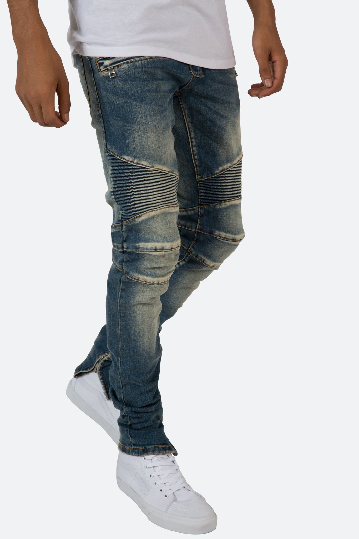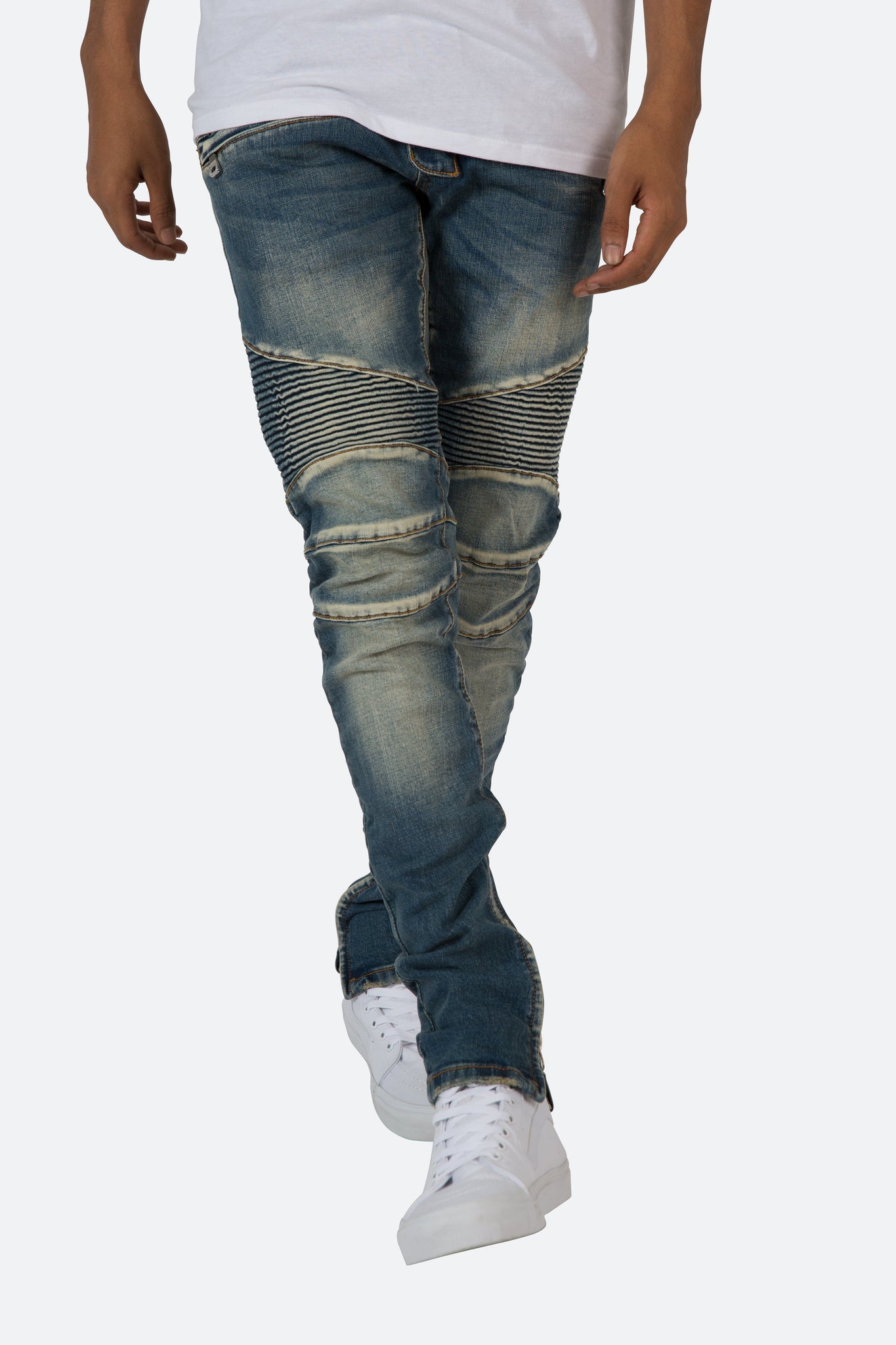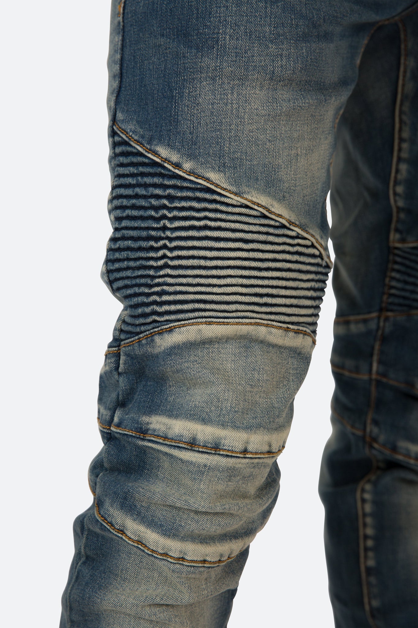 the m14 stretch denim is designed with a relaxed fit through the thigh that tapers from the knee to the ankle, featuring pintuck-stitched moto paneling on the thighs and back yoke, zipper pockets at the upper thigh, and articulated seams at the knees, finishing off with a 10" concealed zipper on the inseam for a carefully optimized fit.