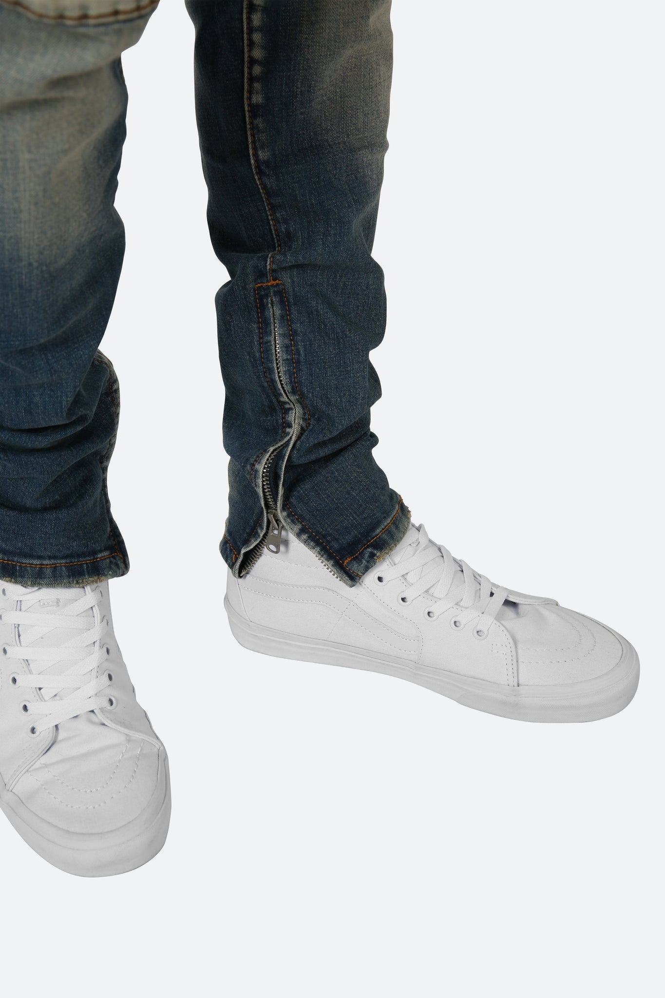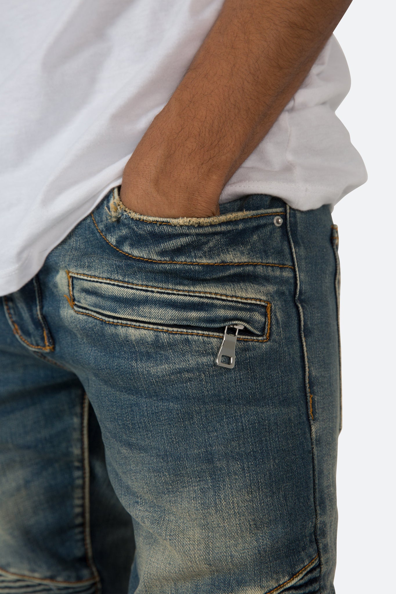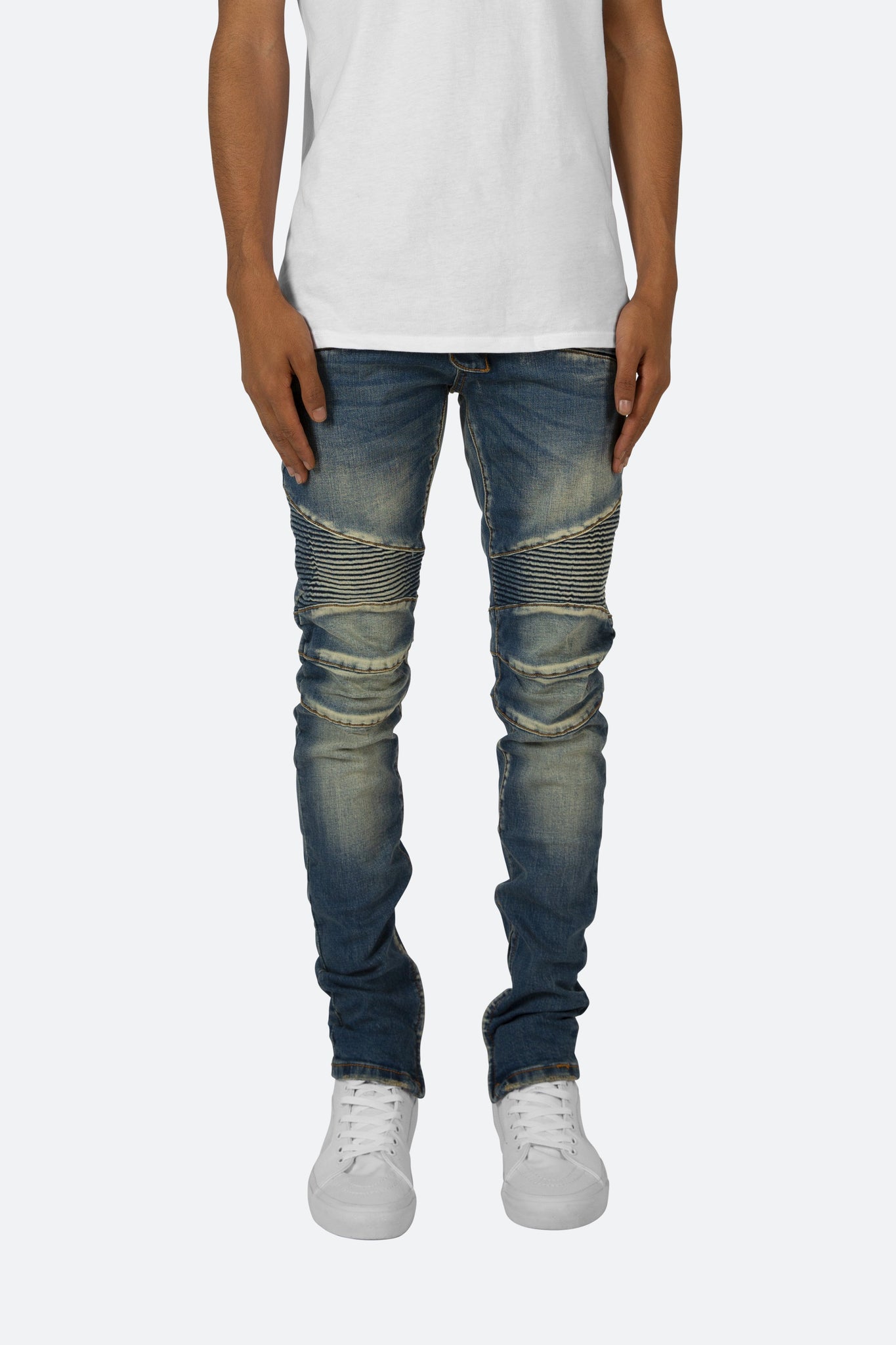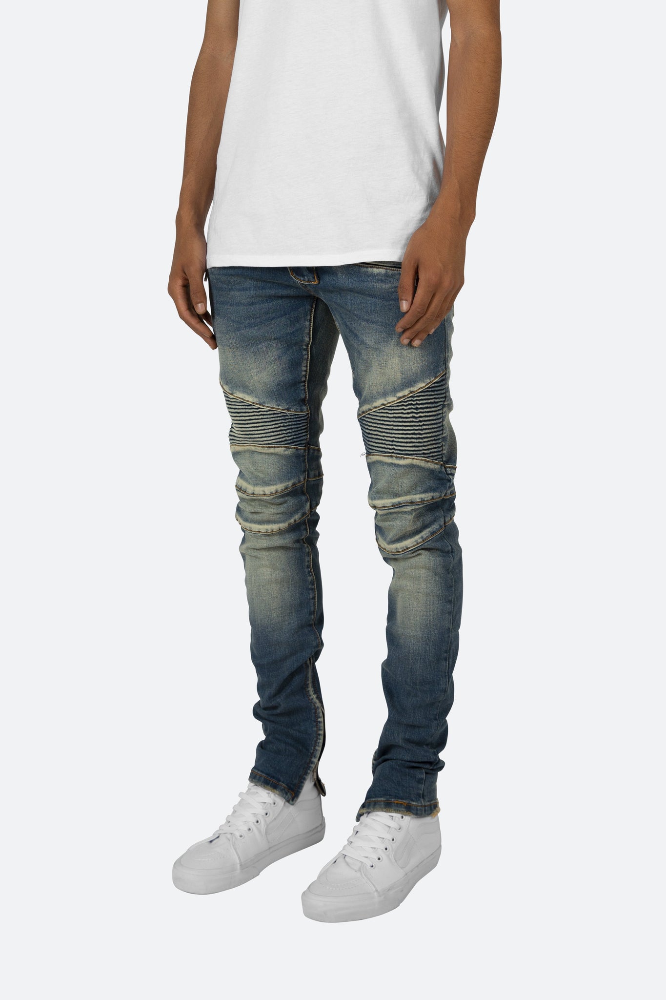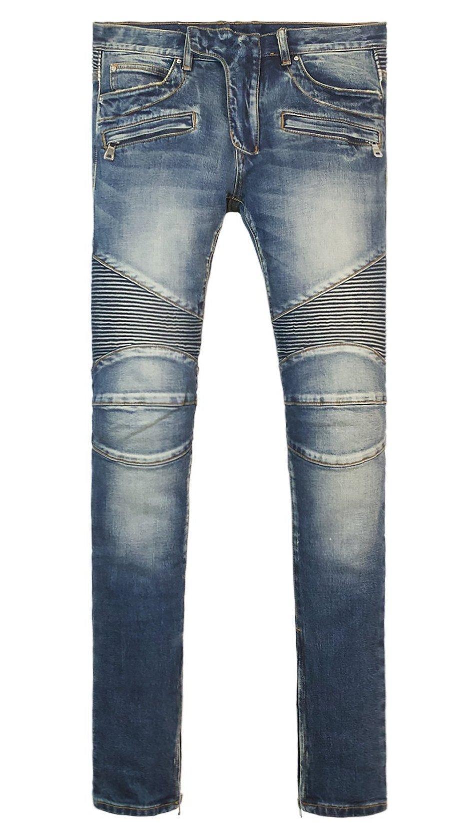 the m14 stretch denim is designed with a relaxed fit through the thigh that tapers from the knee to the ankle, featuring pintuck-stitched moto paneling on the thighs and back yoke, zipper pockets at the upper thigh, and articulated seams at the knees, finishing off with a 10" concealed zipper on the inseam for a carefully optimized fit.
