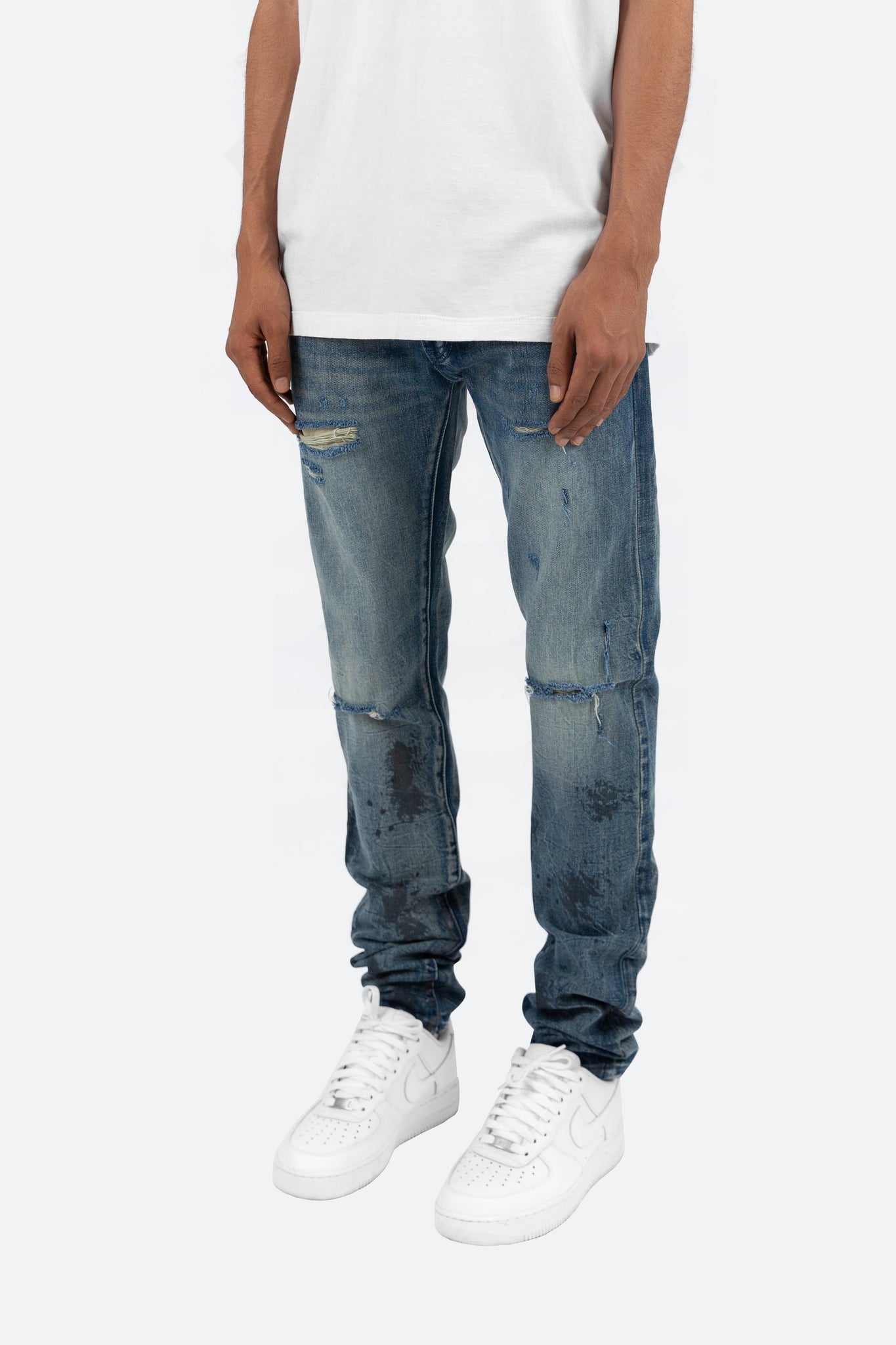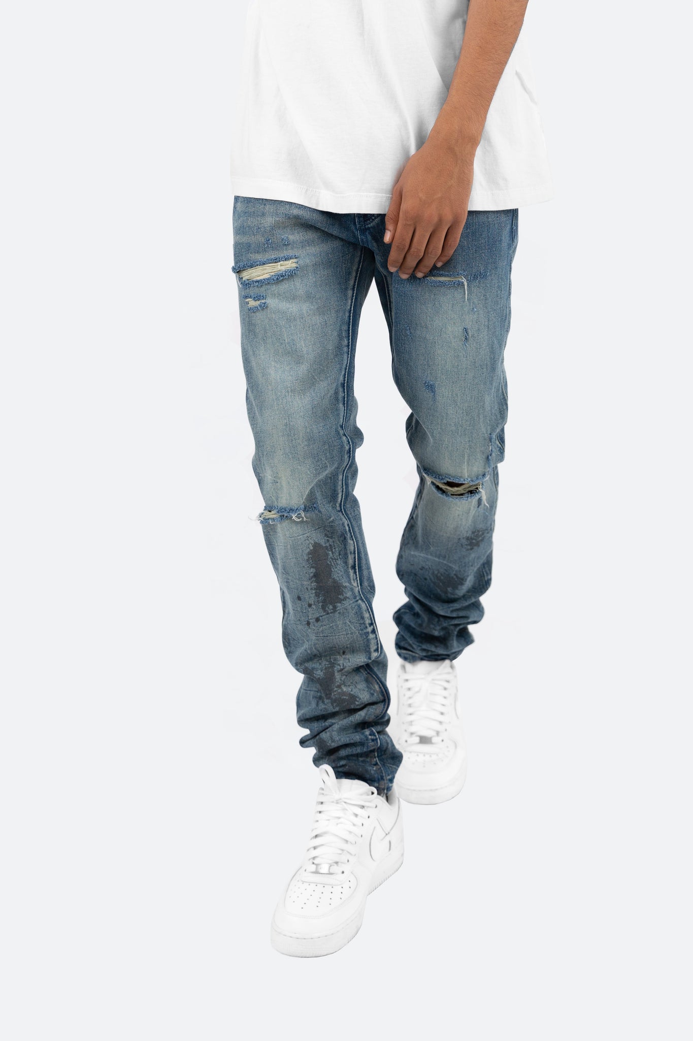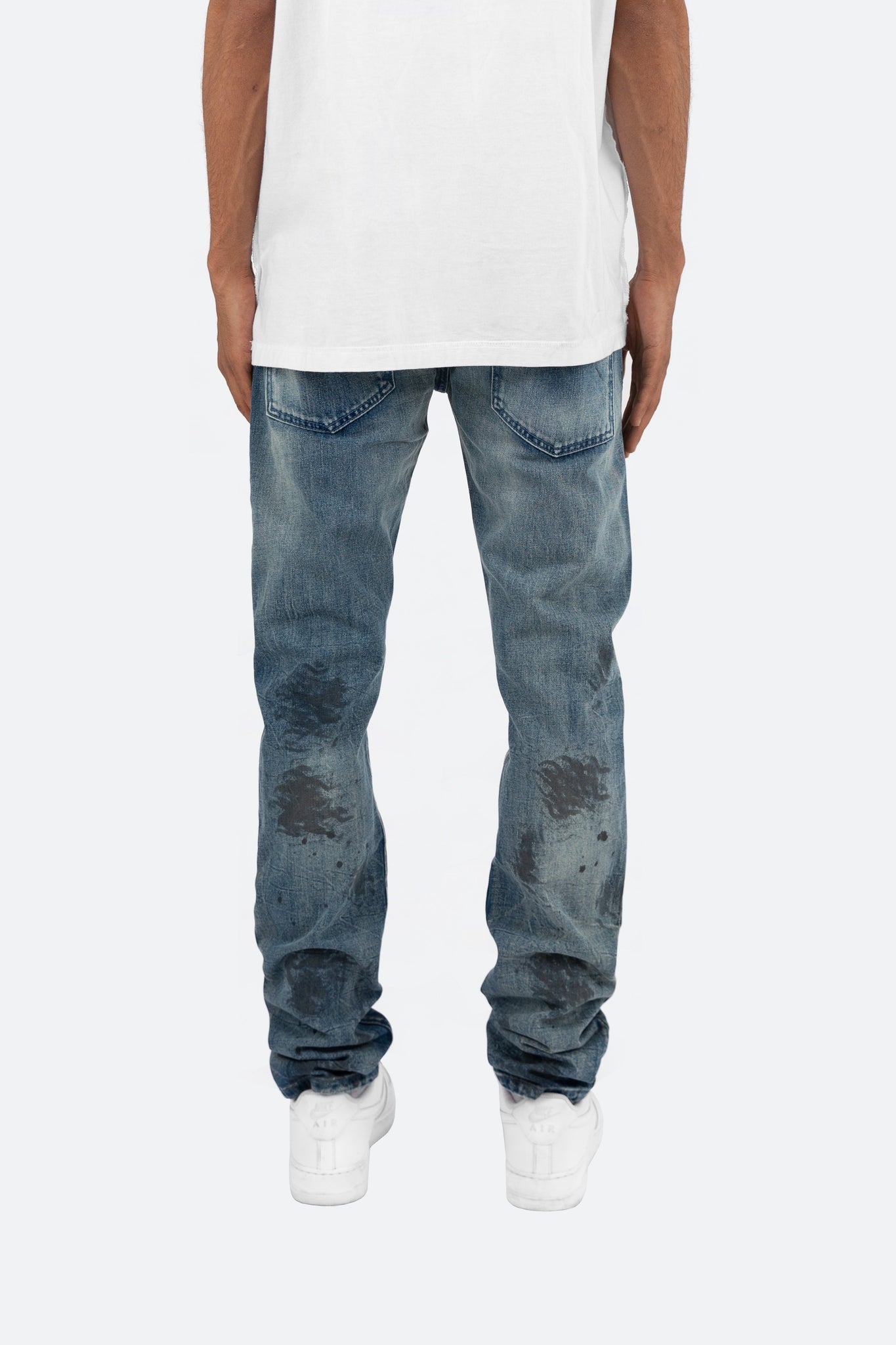 the S174 Denim is designed with our new S fit, which is relaxed through the thigh and a straight leg, featuring a dark vintage wash throughout, distressing at the knees and thighs, and finished with black paint details from the knees down.