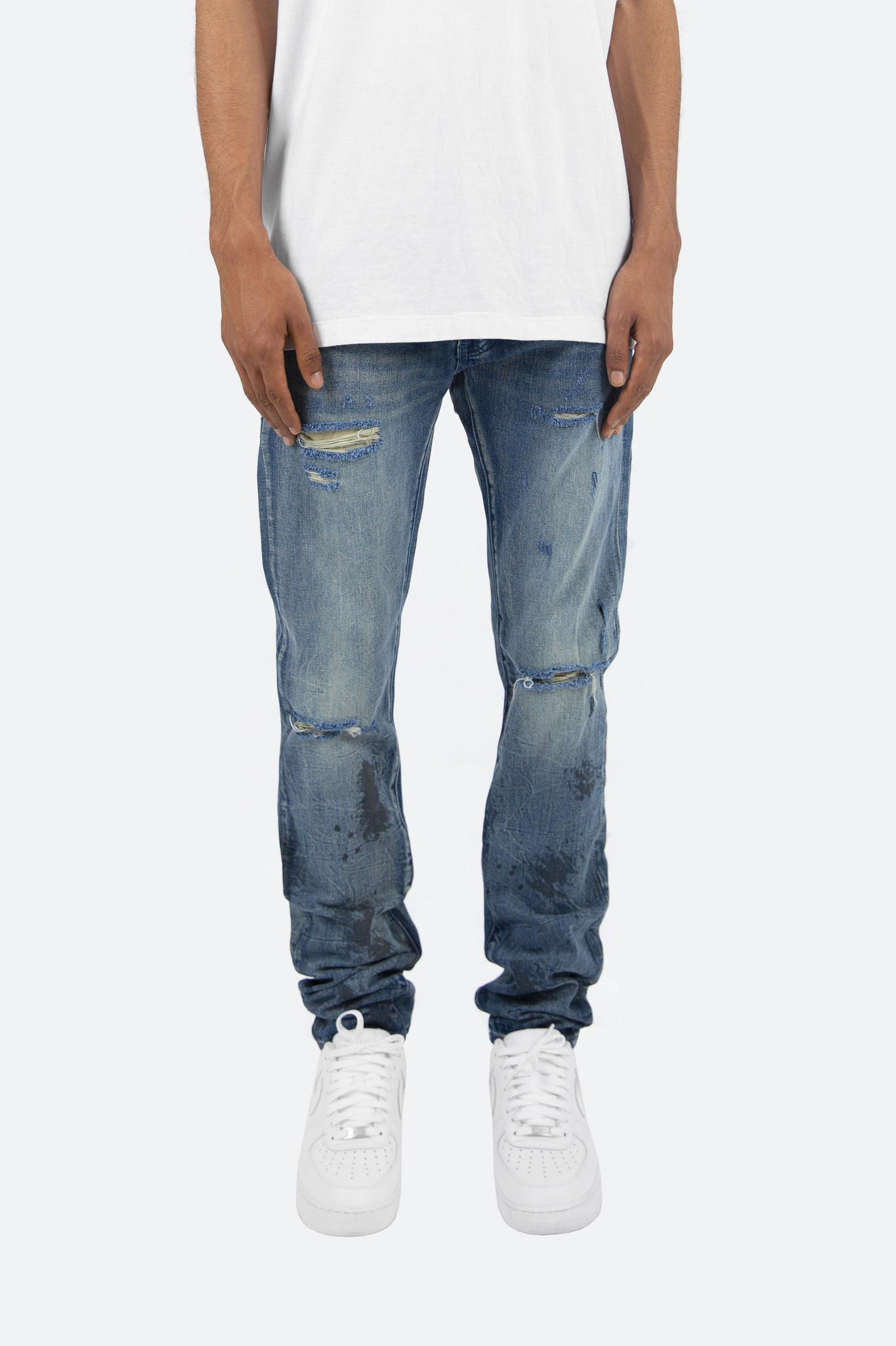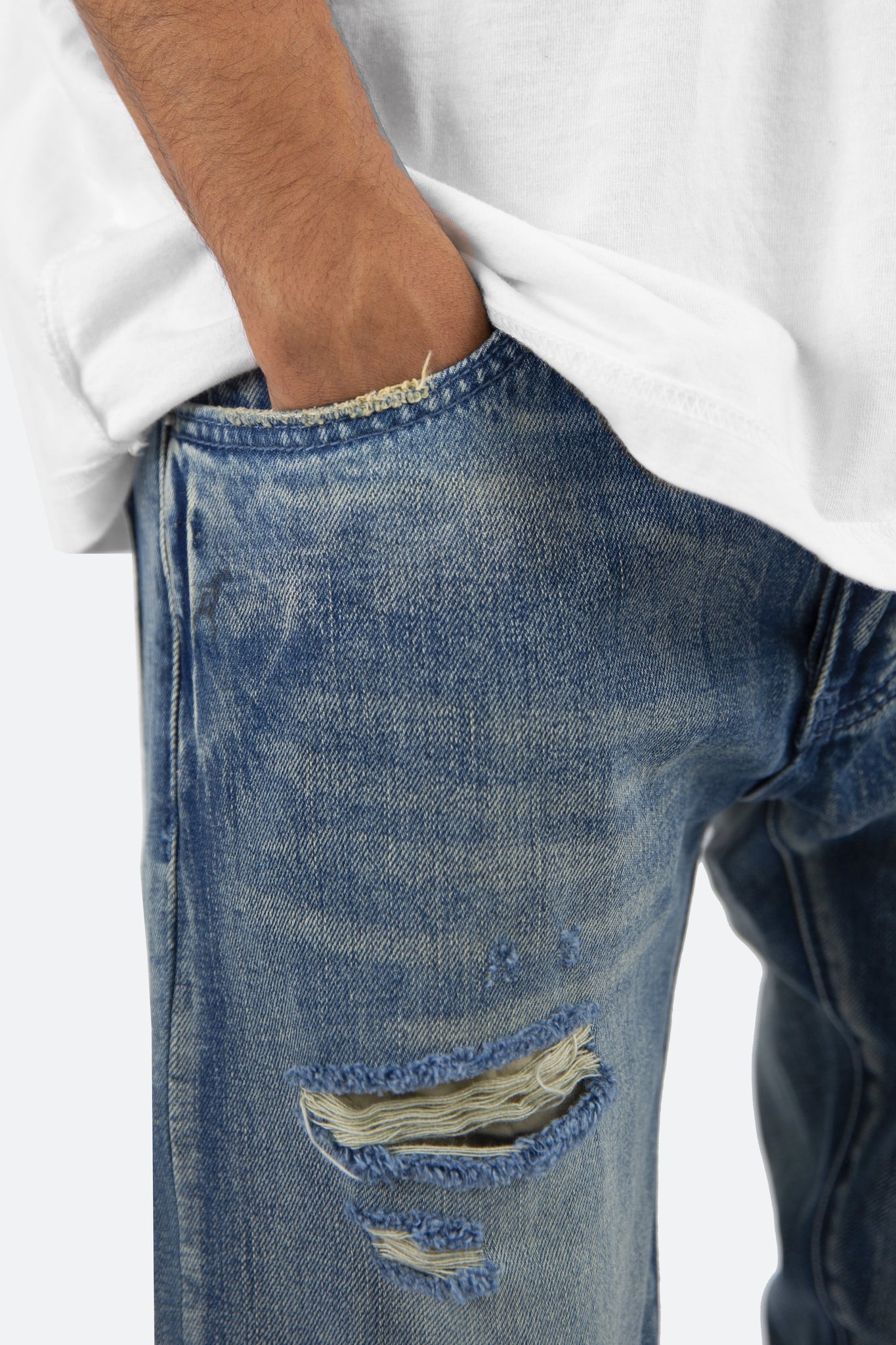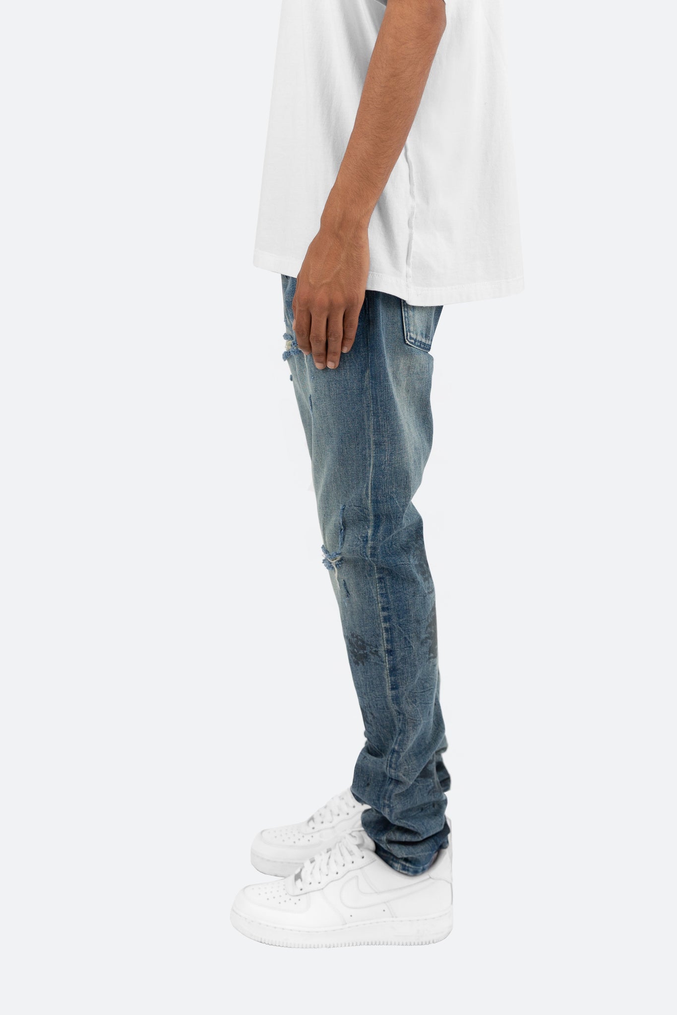 the S174 Denim is designed with our new S fit, which is relaxed through the thigh and a straight leg, featuring a dark vintage wash throughout, distressing at the knees and thighs, and finished with black paint details from the knees down.