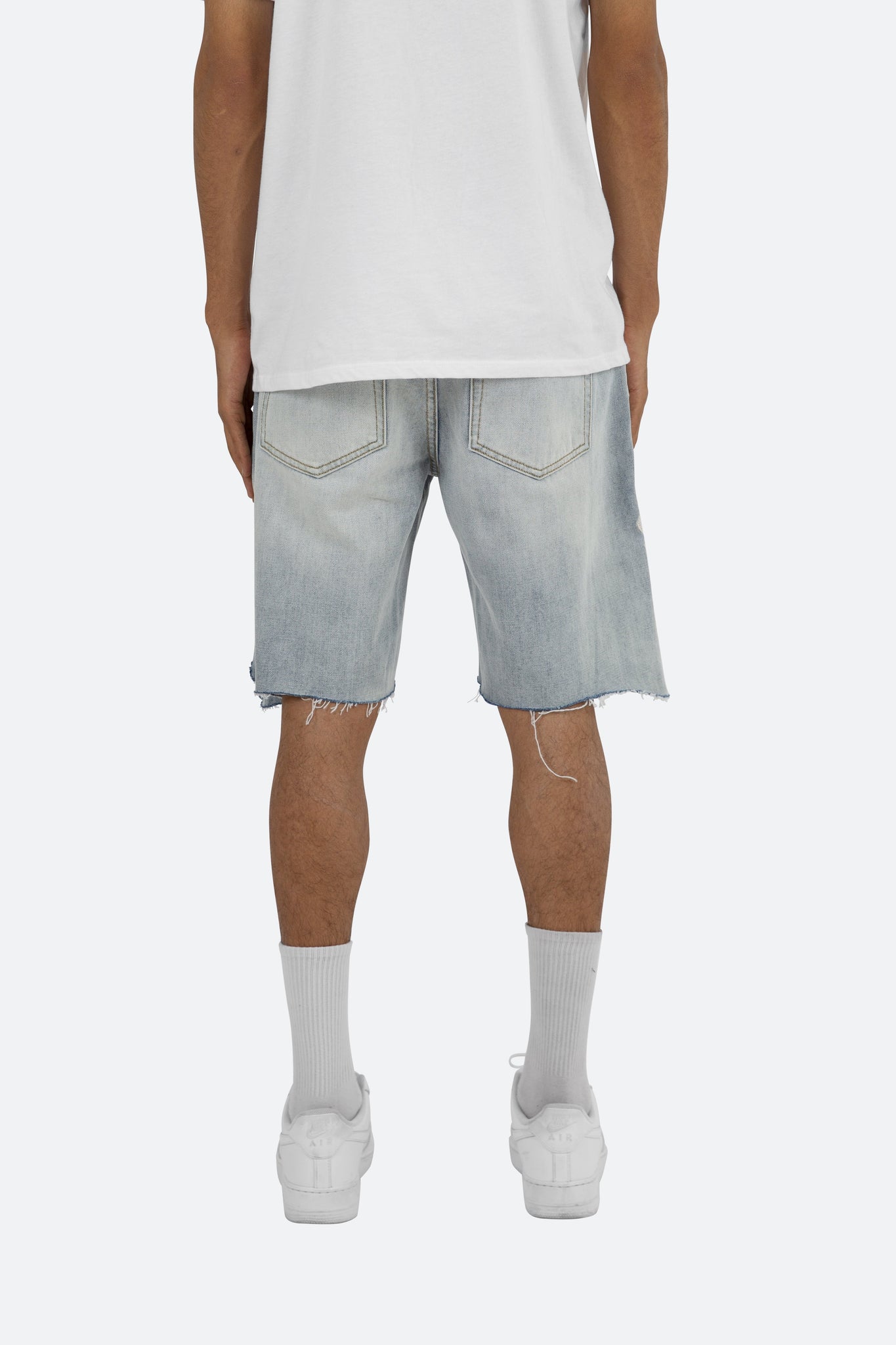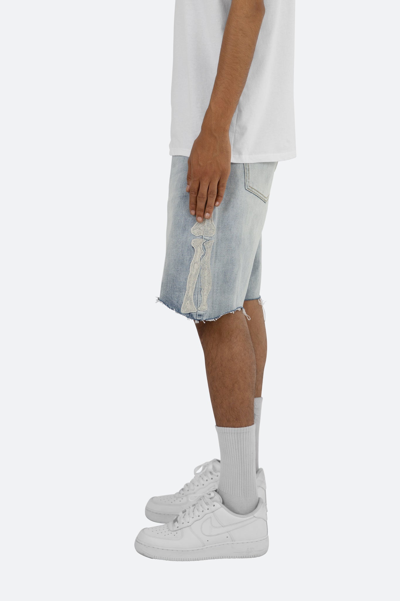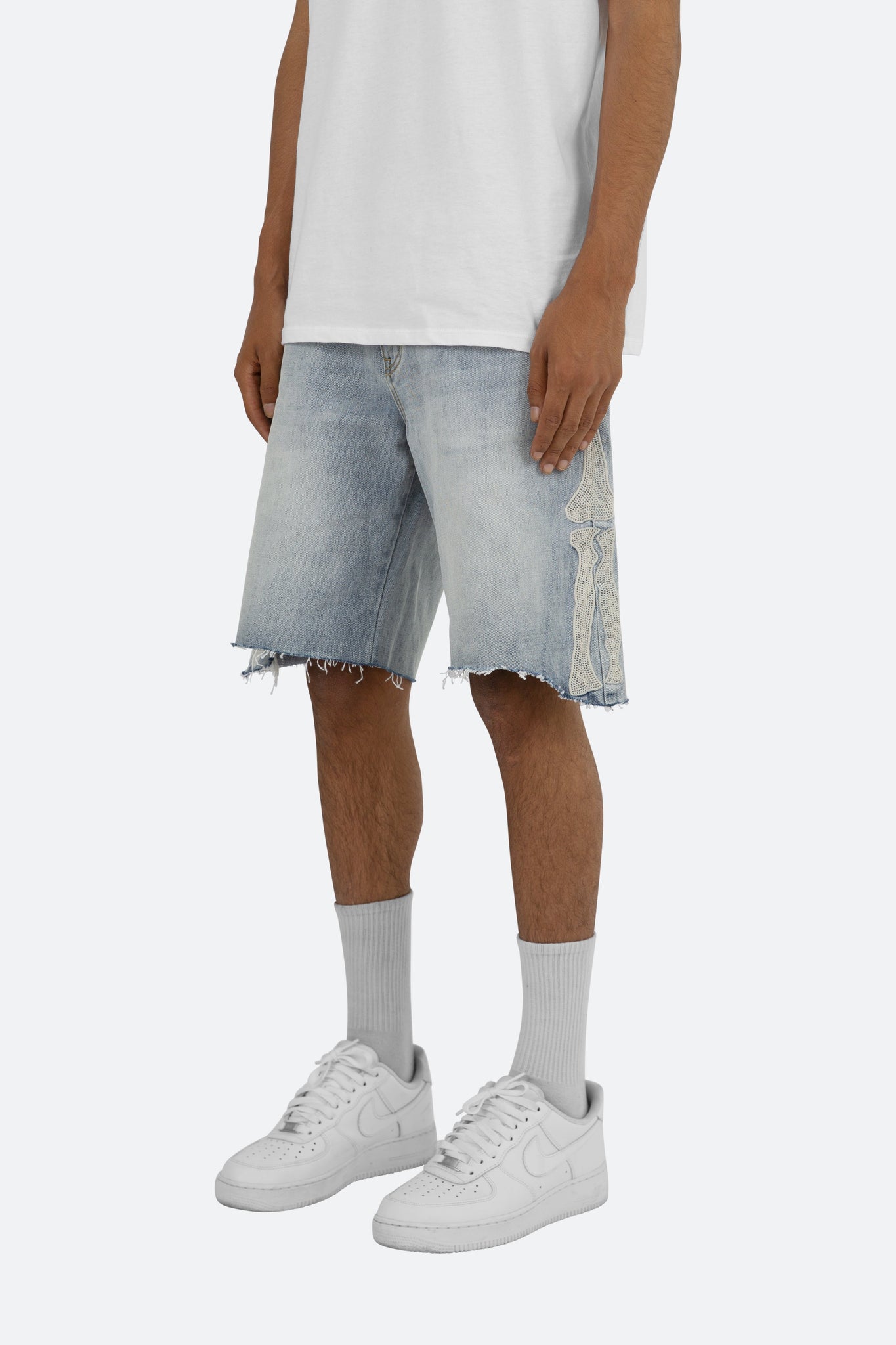the R194 Denim Shorts are designed with a relaxed fit throughout, featuring chain stitched embroidered bones on the outseam, and finished off with raw hem.