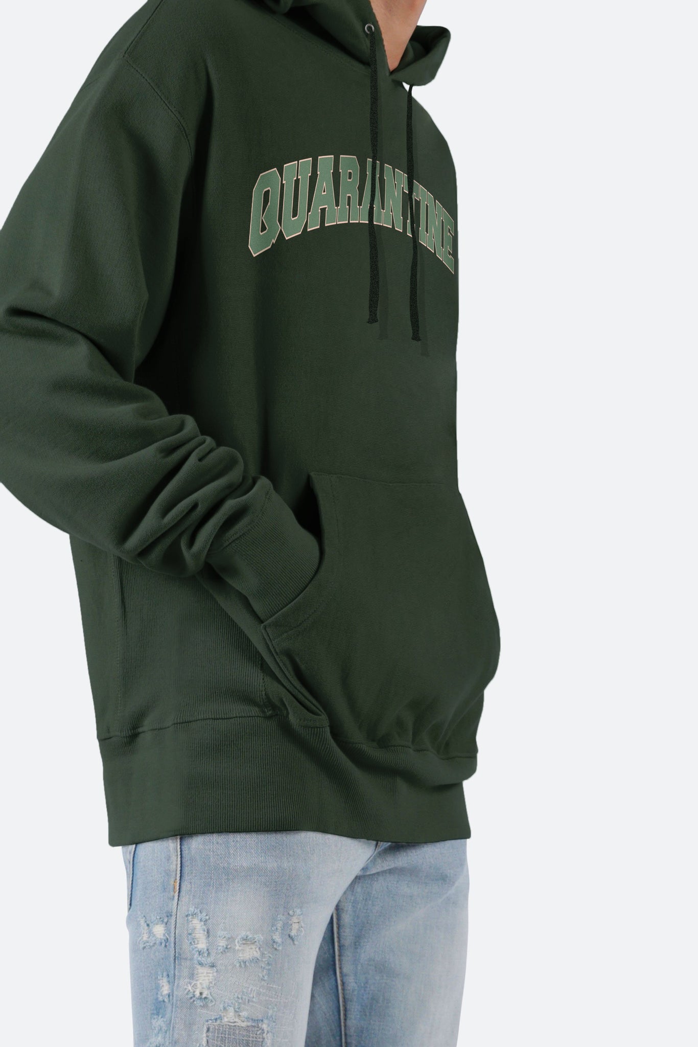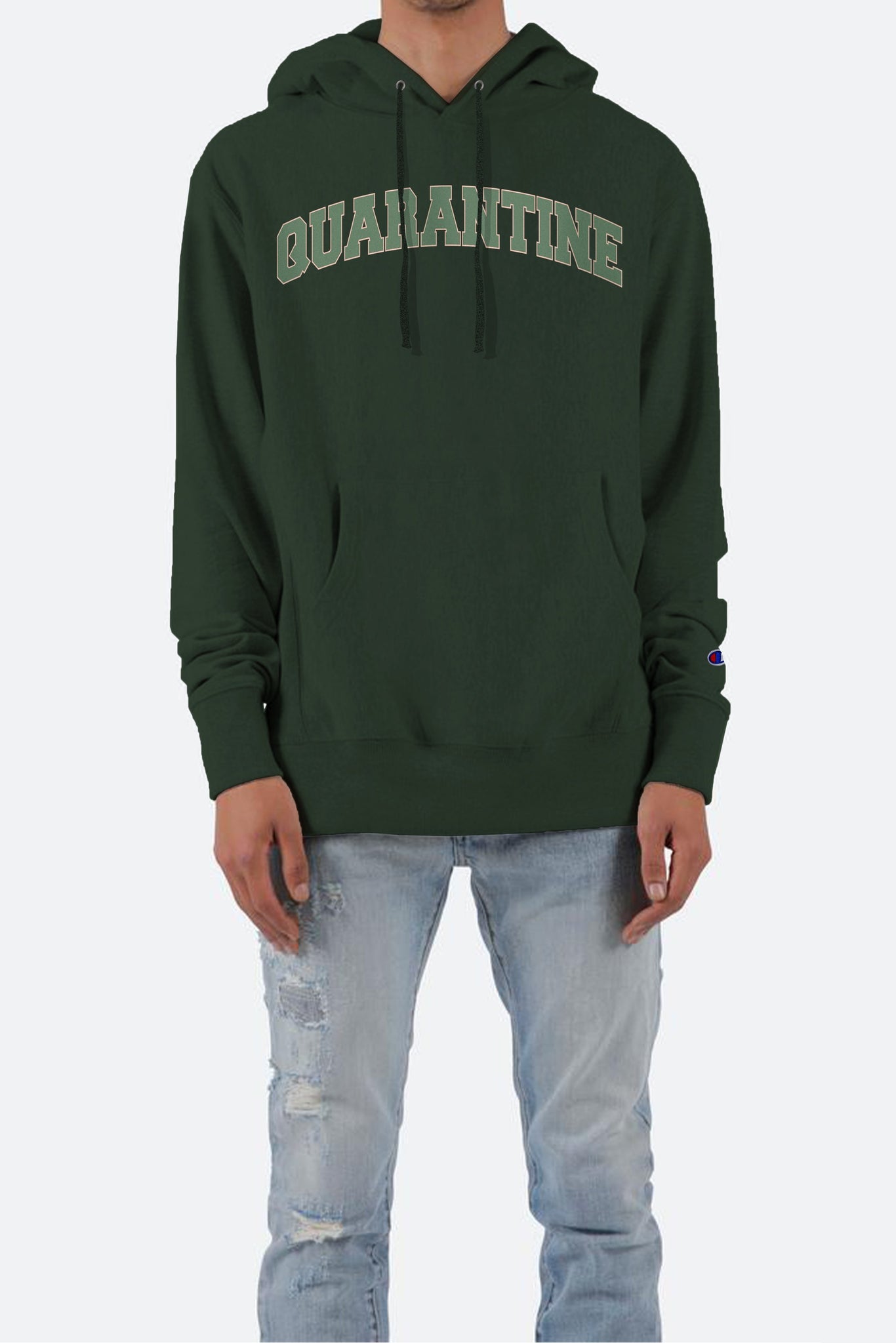 the Quarantine Champion Hoodie features a relaxed fit, a front pouch pocket, and body matched ribbing at the waist, side seam, and wrists, finished with a screen print on the chest all on a Champion Reverse Weave Hoodie.