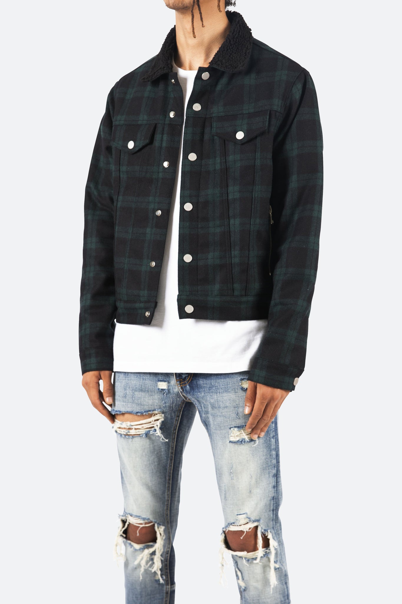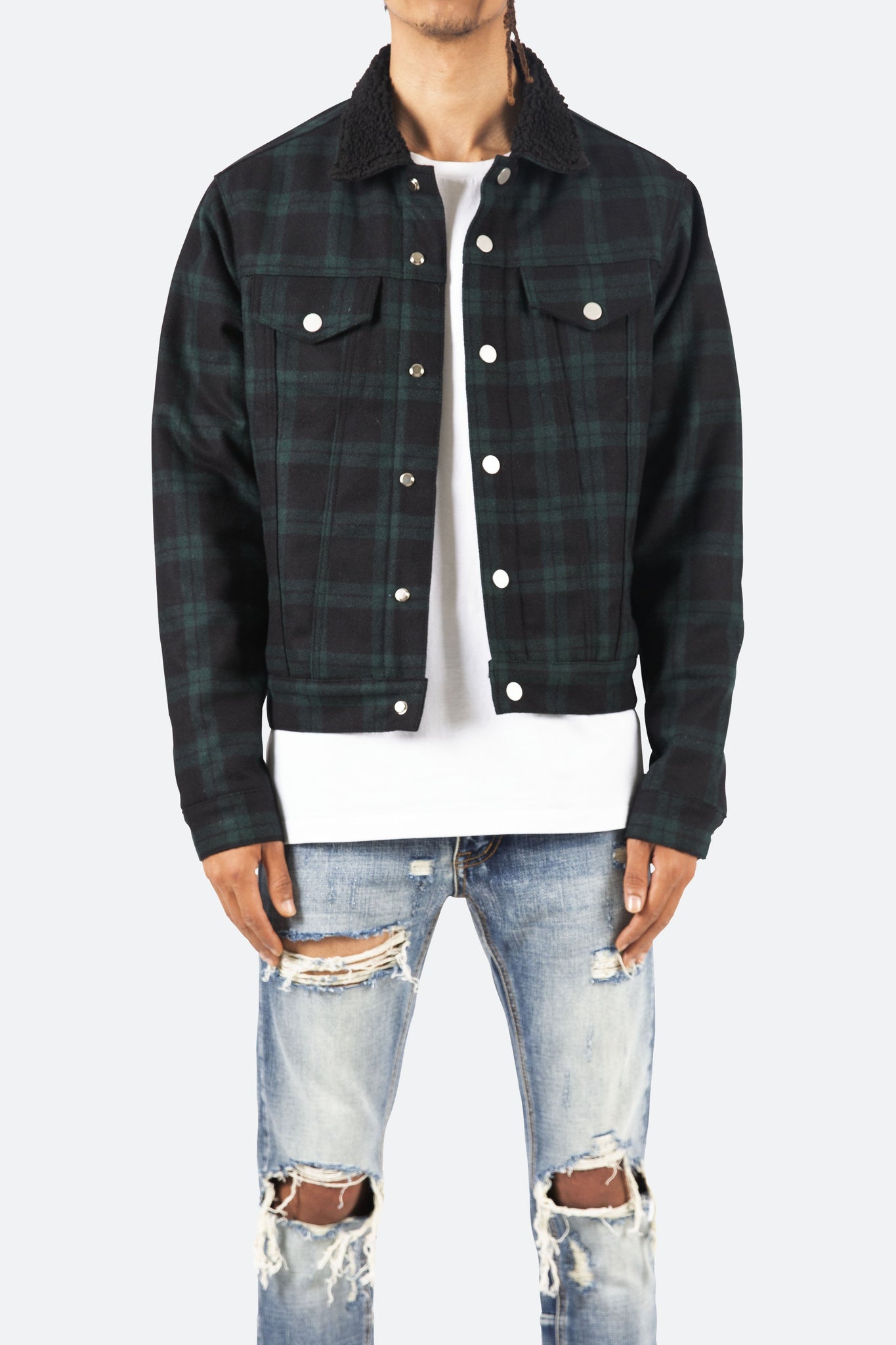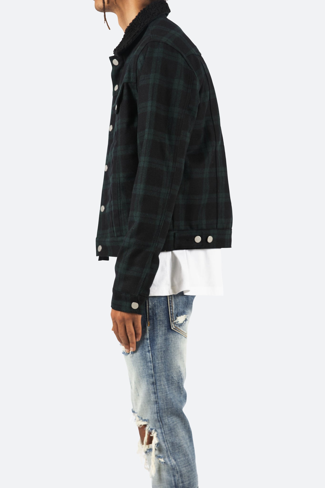 the Flannel Sherpa Jacket is designed with a standard fit, a button placket and closures at the wrists, pockets on both the chest and lower front and is constructed from a custom developed brushed plaid, and is finished with a quilted lining and exposed sherpa collar.