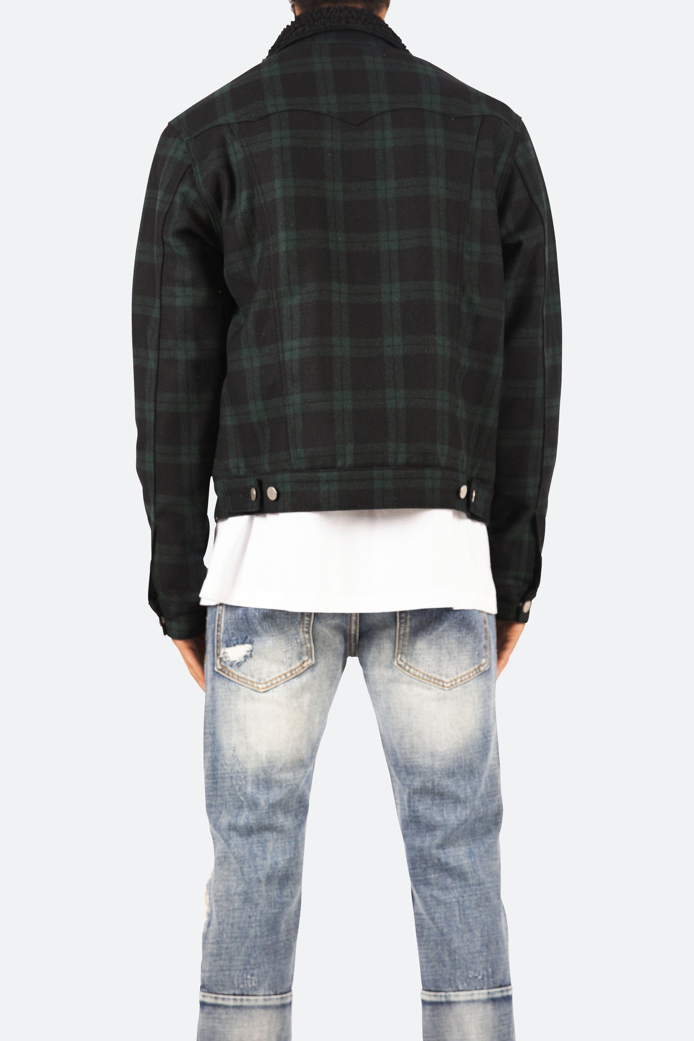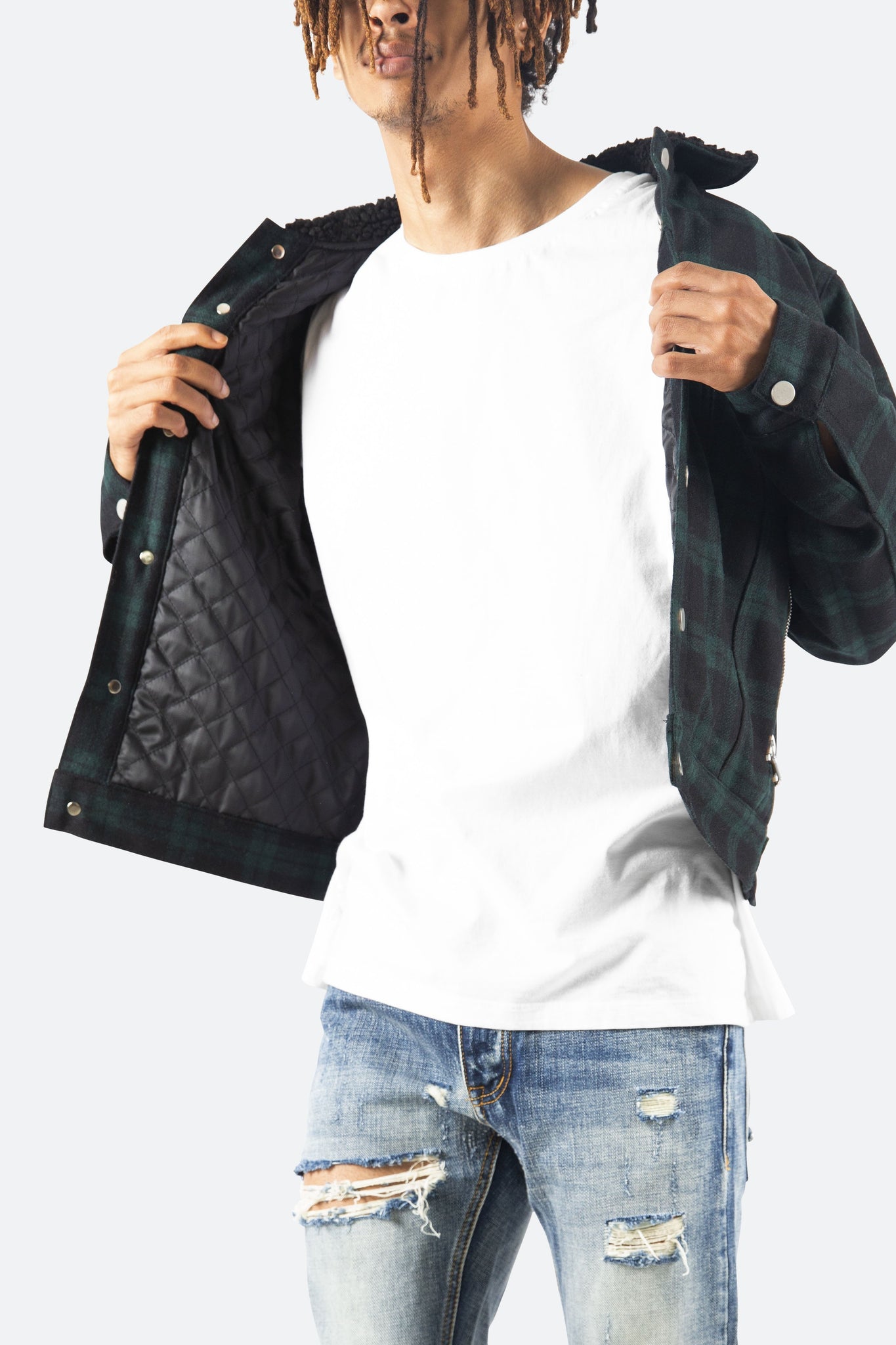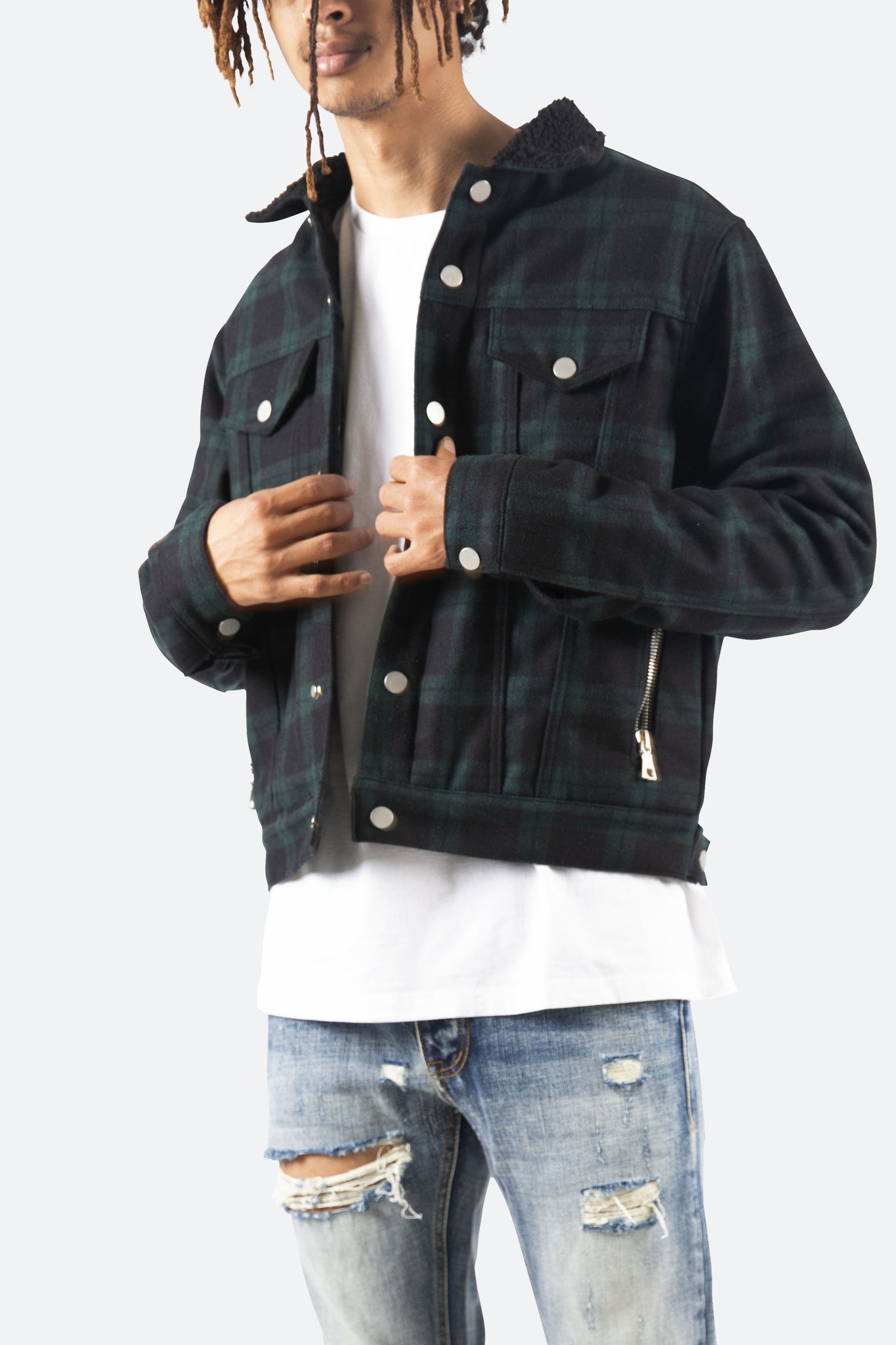 the Flannel Sherpa Jacket is designed with a standard fit, a button placket and closures at the wrists, pockets on both the chest and lower front and is constructed from a custom developed brushed plaid, and is finished with a quilted lining and exposed sherpa collar.