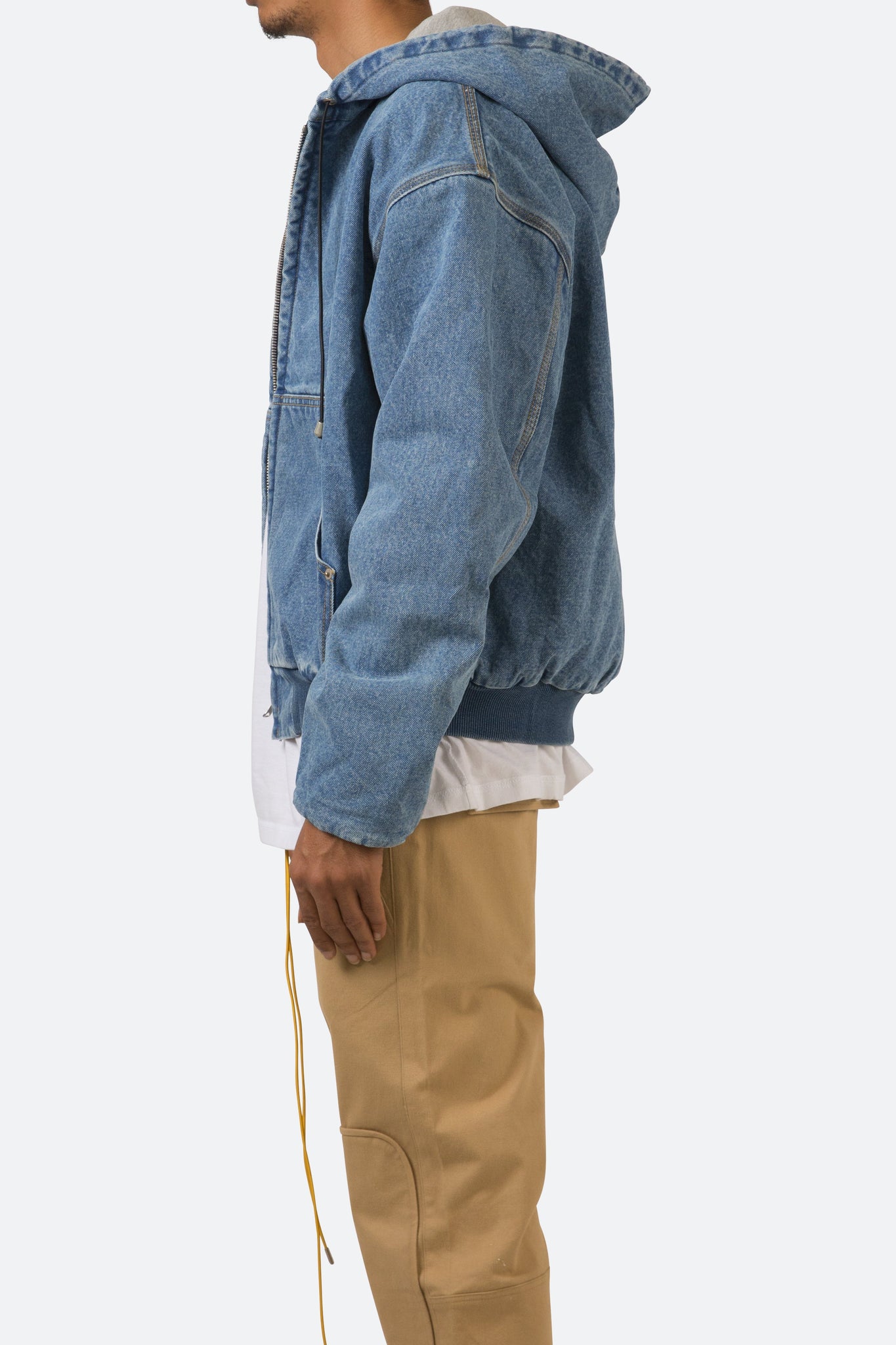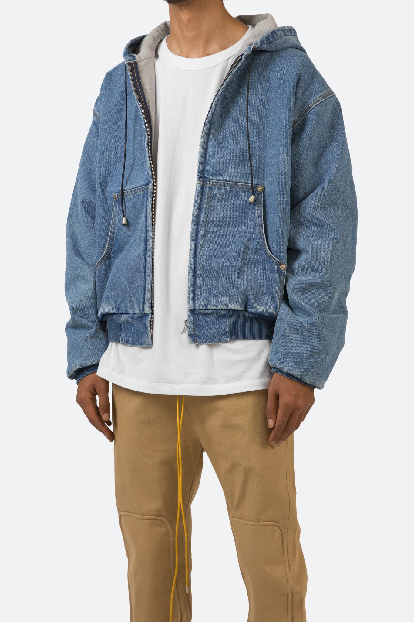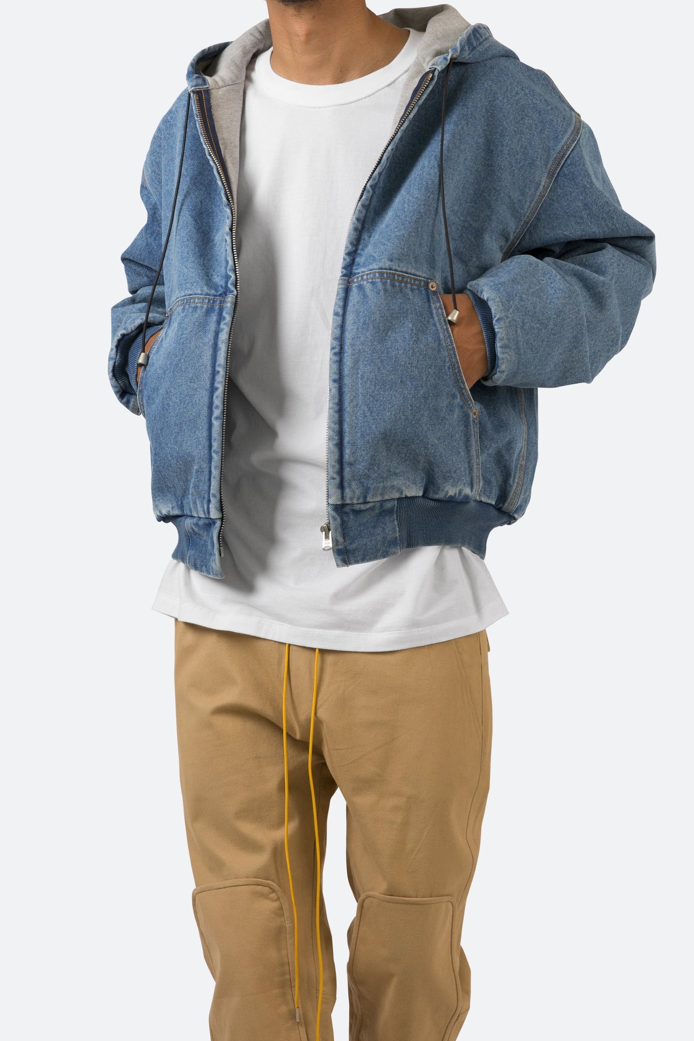 the Hooded Denim Work Jacket is made from 13.5oz denim and features a 280 GSM grey fleece lining, heavyweight zipper enclosure, lined hood, and ribbed cuffs at the sleeves and waist. The fit is relaxed, with a cropped body length and slightly dropped shoulder.