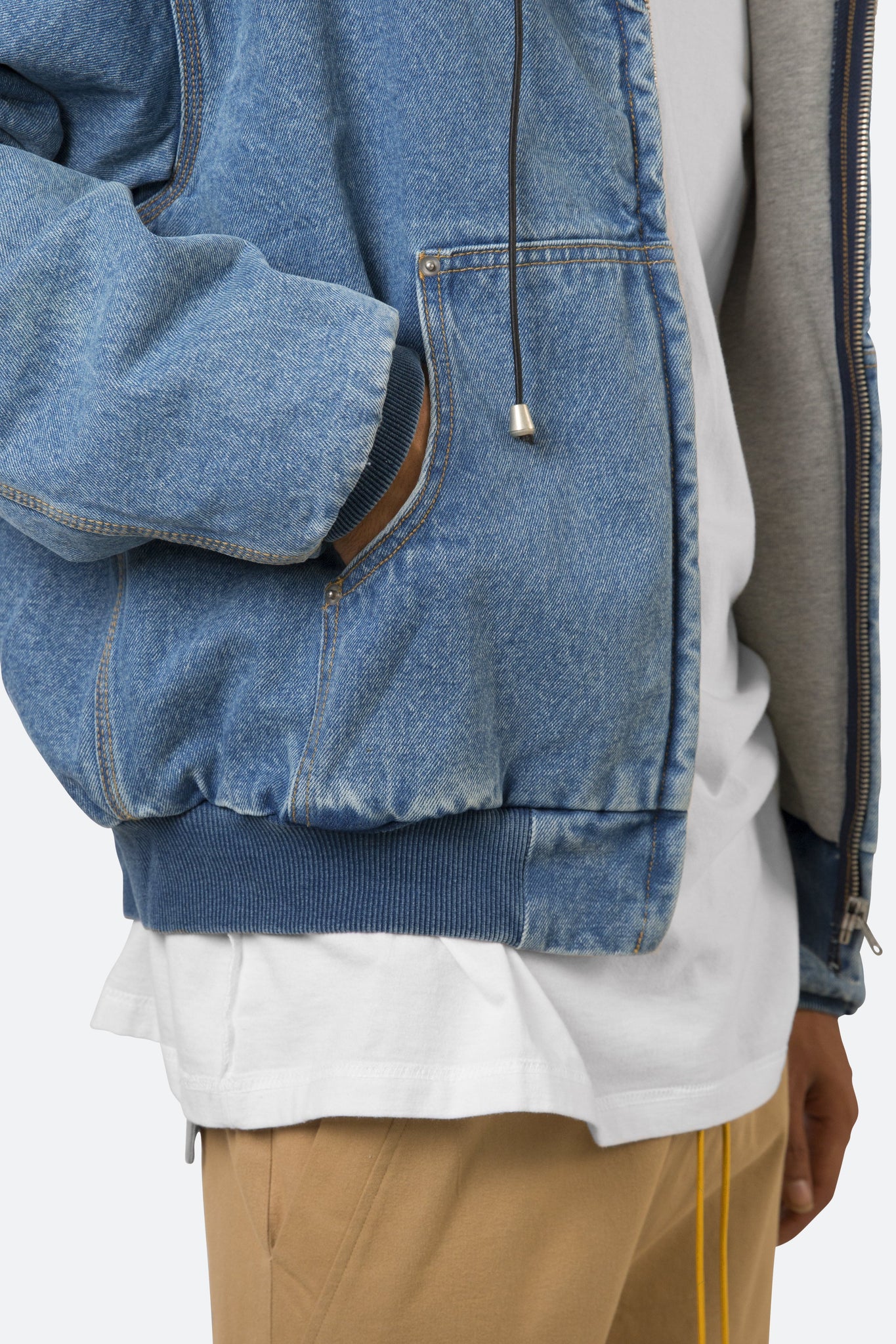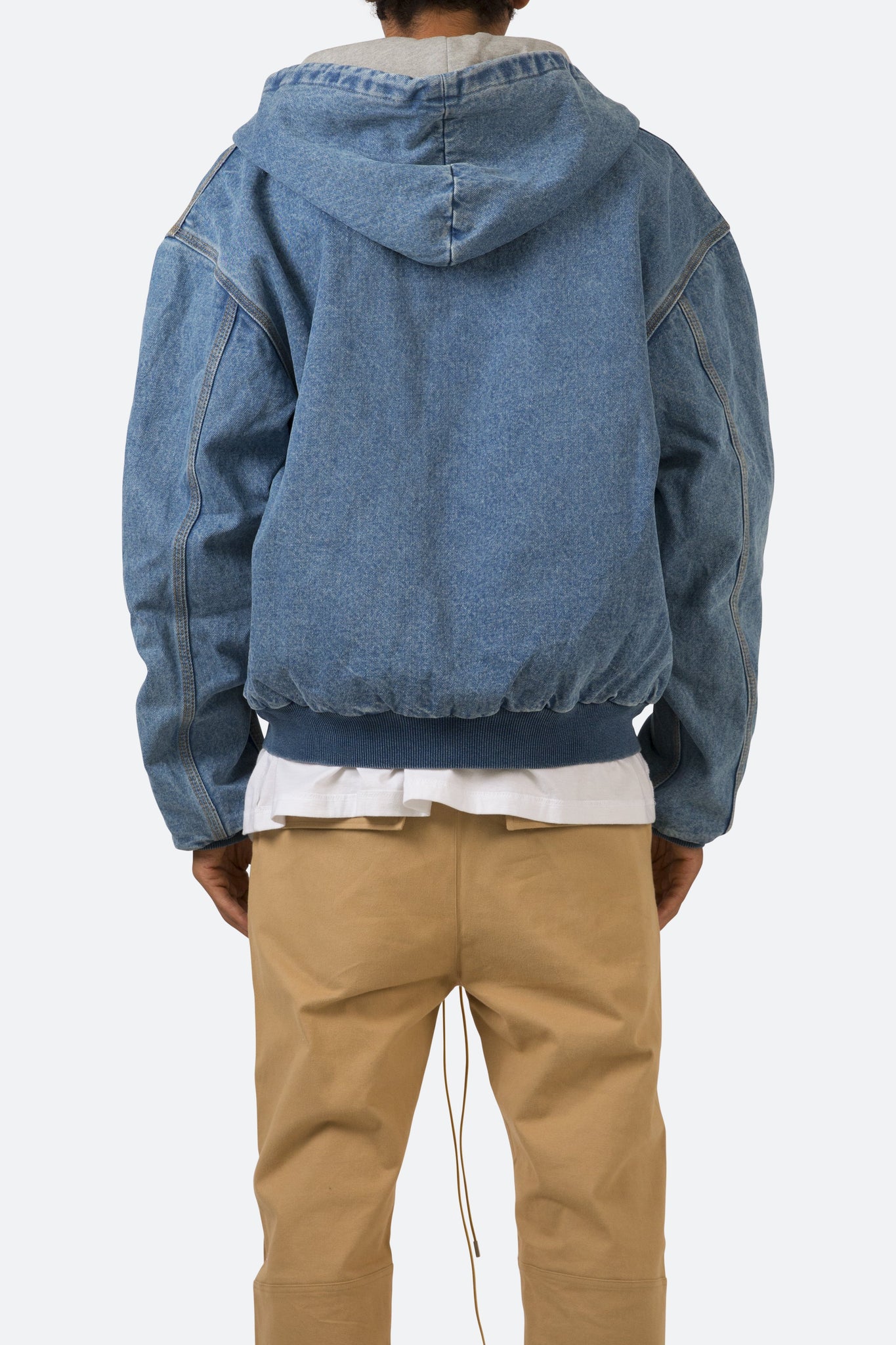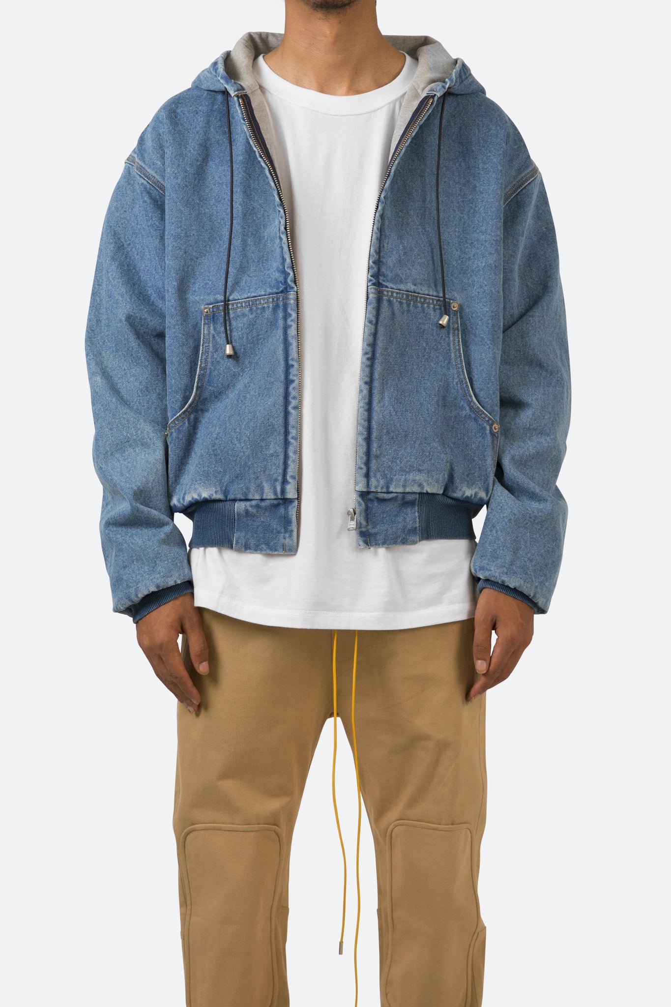 the Hooded Denim Work Jacket is made from 13.5oz denim and features a 280 GSM grey fleece lining, heavyweight zipper enclosure, lined hood, and ribbed cuffs at the sleeves and waist. The fit is relaxed, with a cropped body length and slightly dropped shoulder.