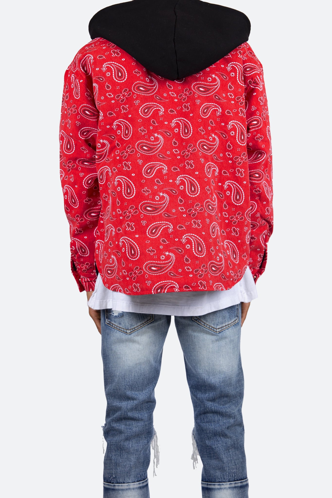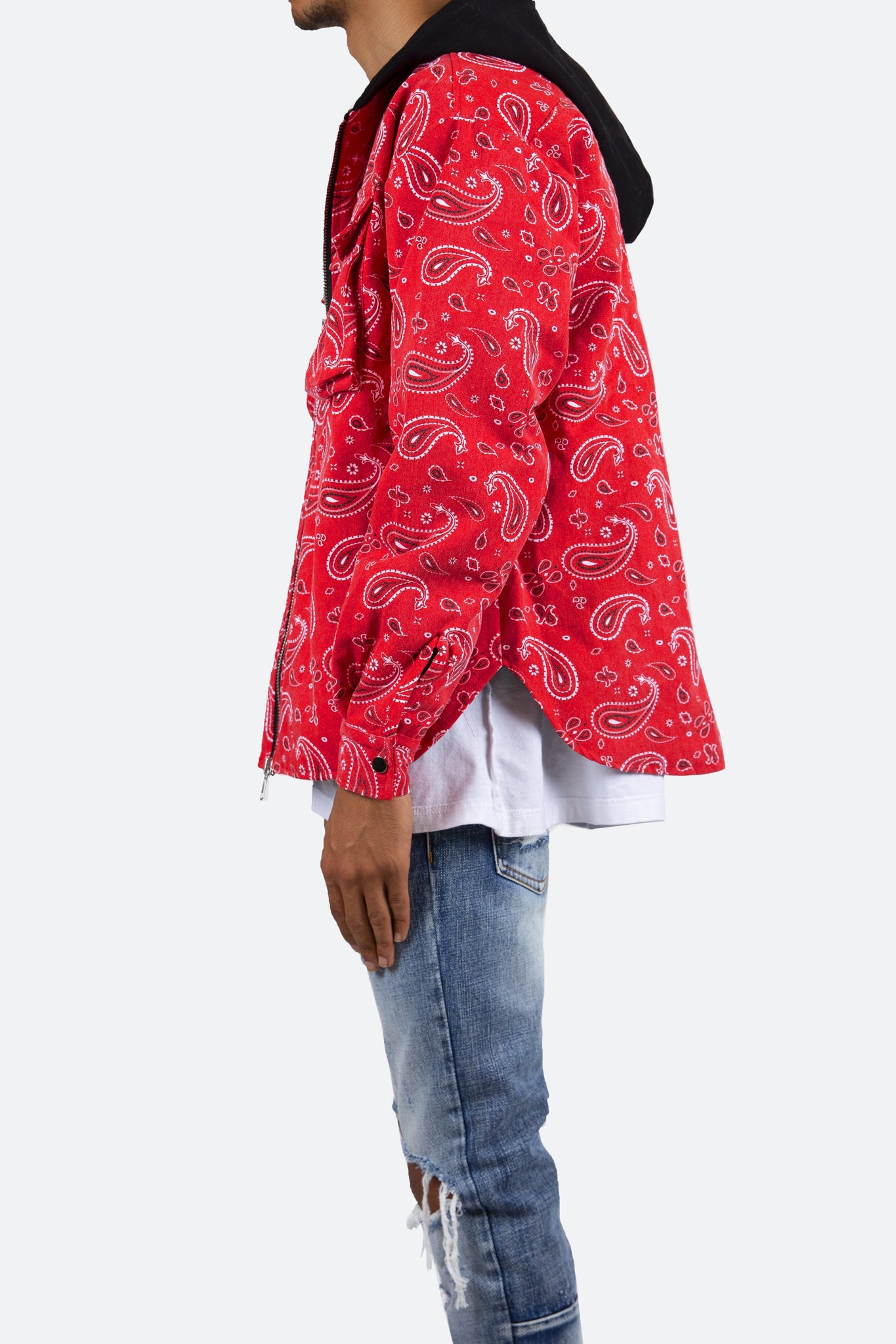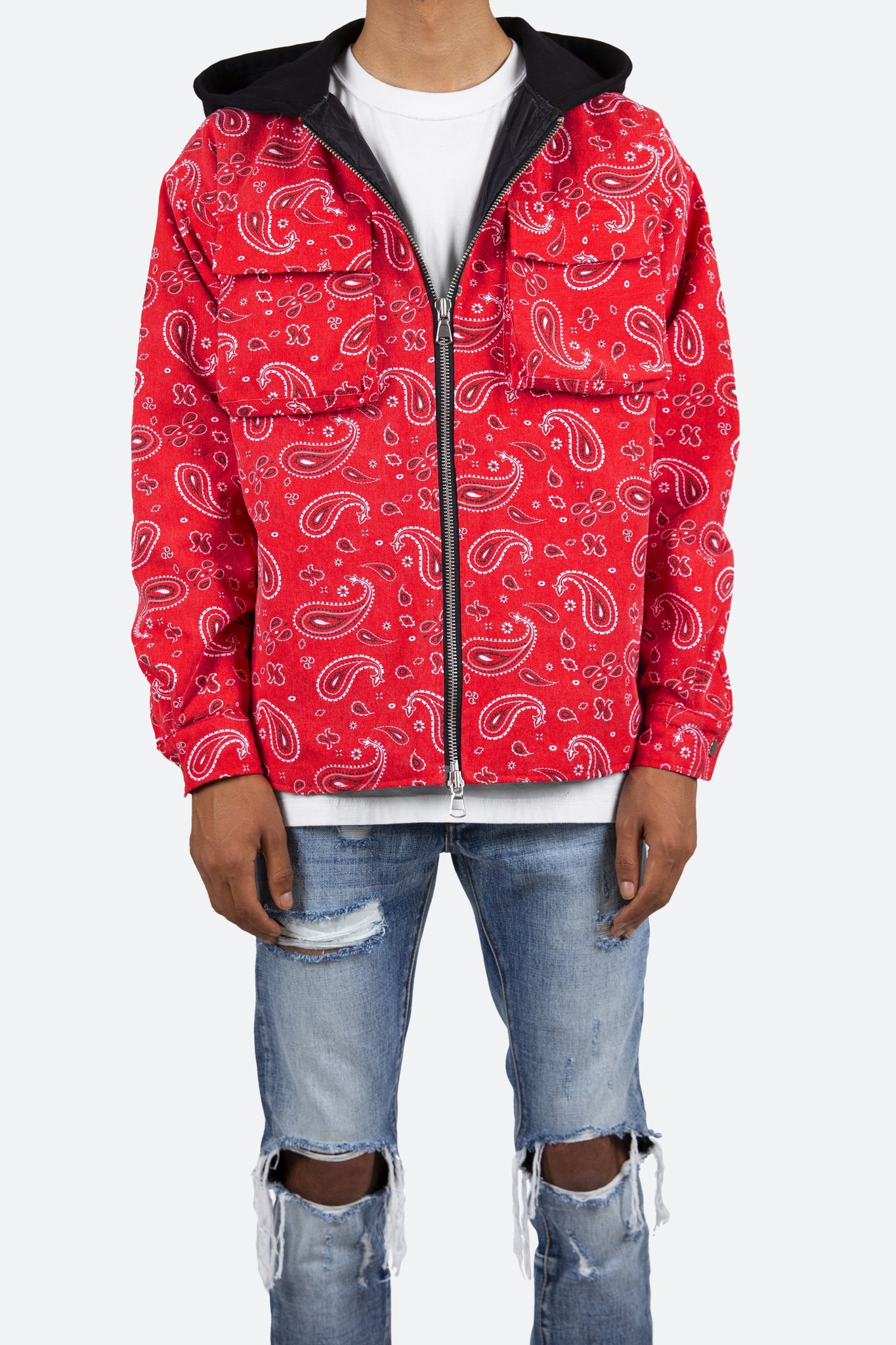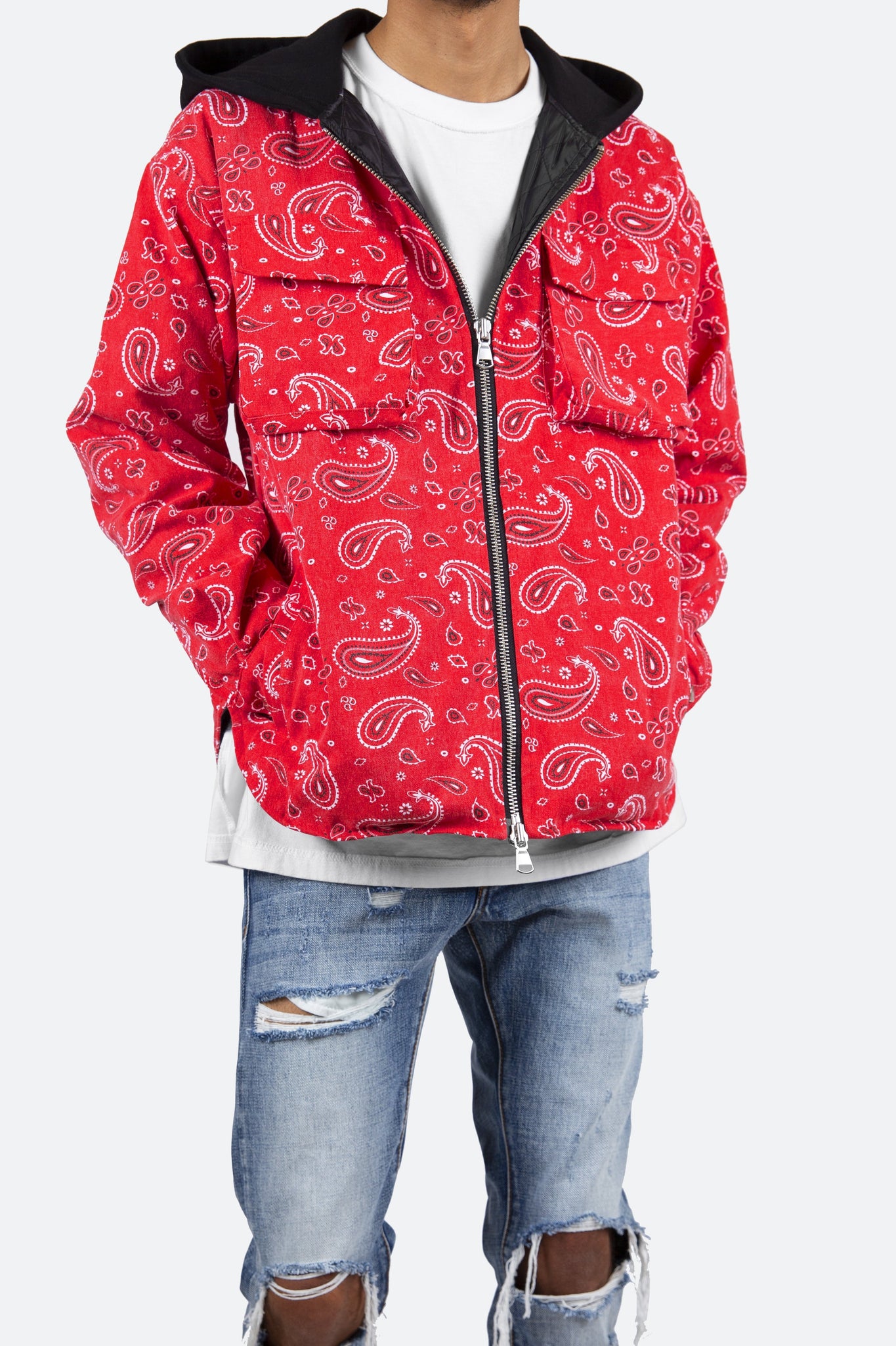 the Paisley Hooded Zip Up is designed with a relaxed fit and features a scoop hemline, a two-way zipper closure, welt pockets, french terry hood, cargo pockets at the chest, constructed from a printed paisley twill shell with a vintage wash and finished with a quilted nylon lining.