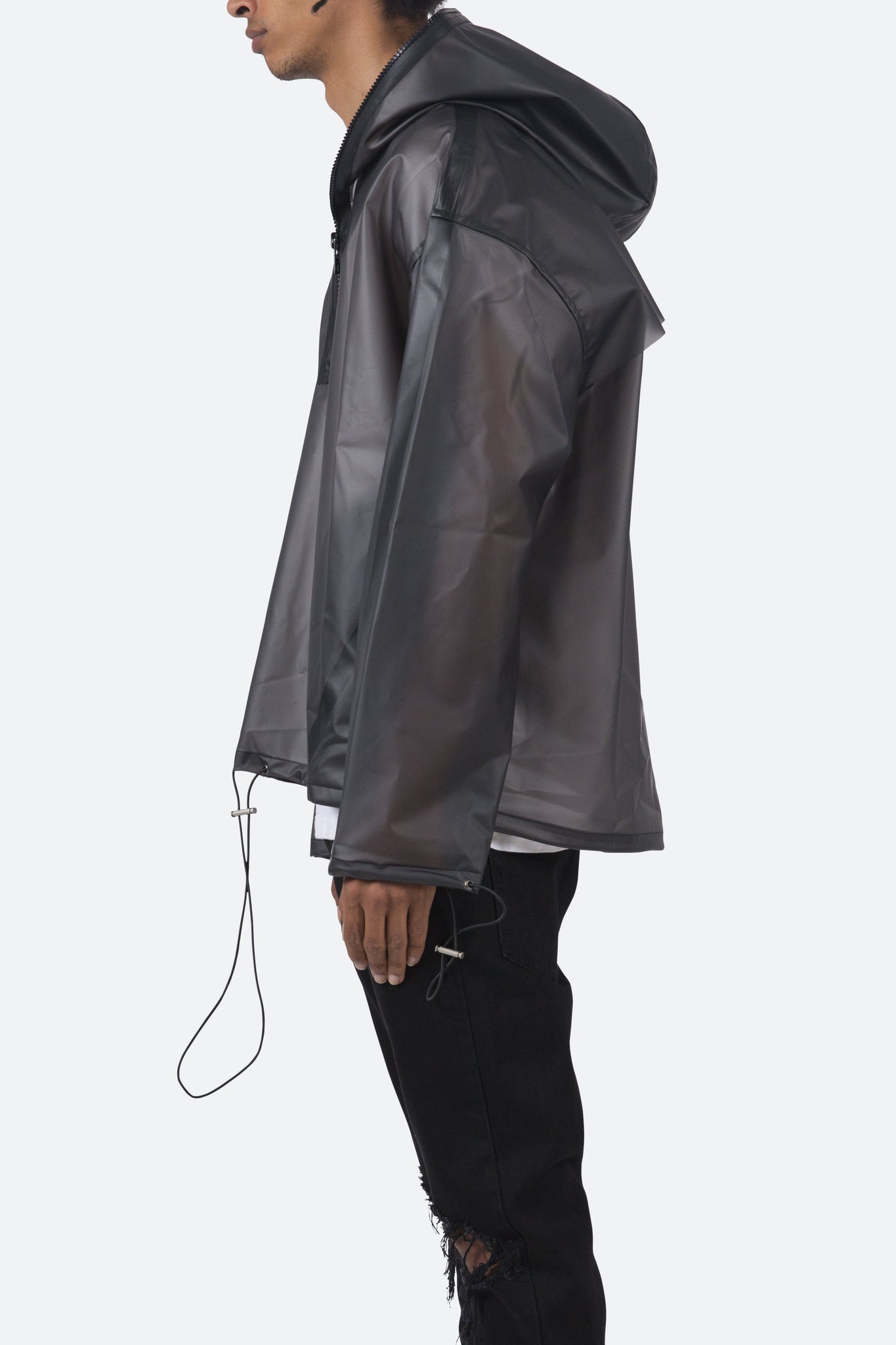 the Rubberized Half Zip is constructed in a relaxed fit, featuring half zip at the chest and hood, elastic cinch closures at the waist and wrists, taped seams, and is completed in a rubber-like polyester fabric.