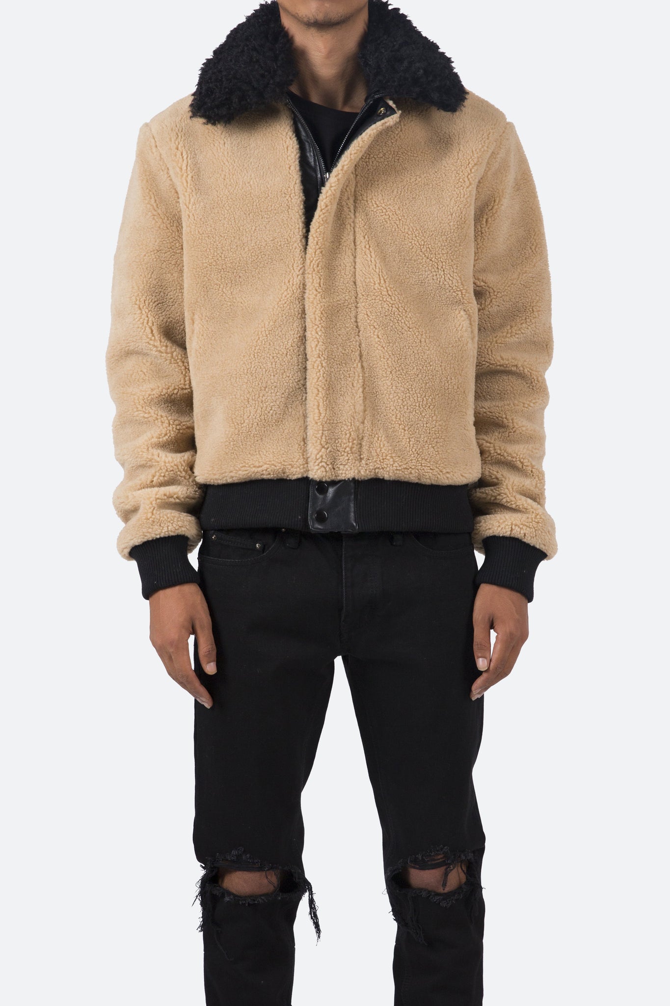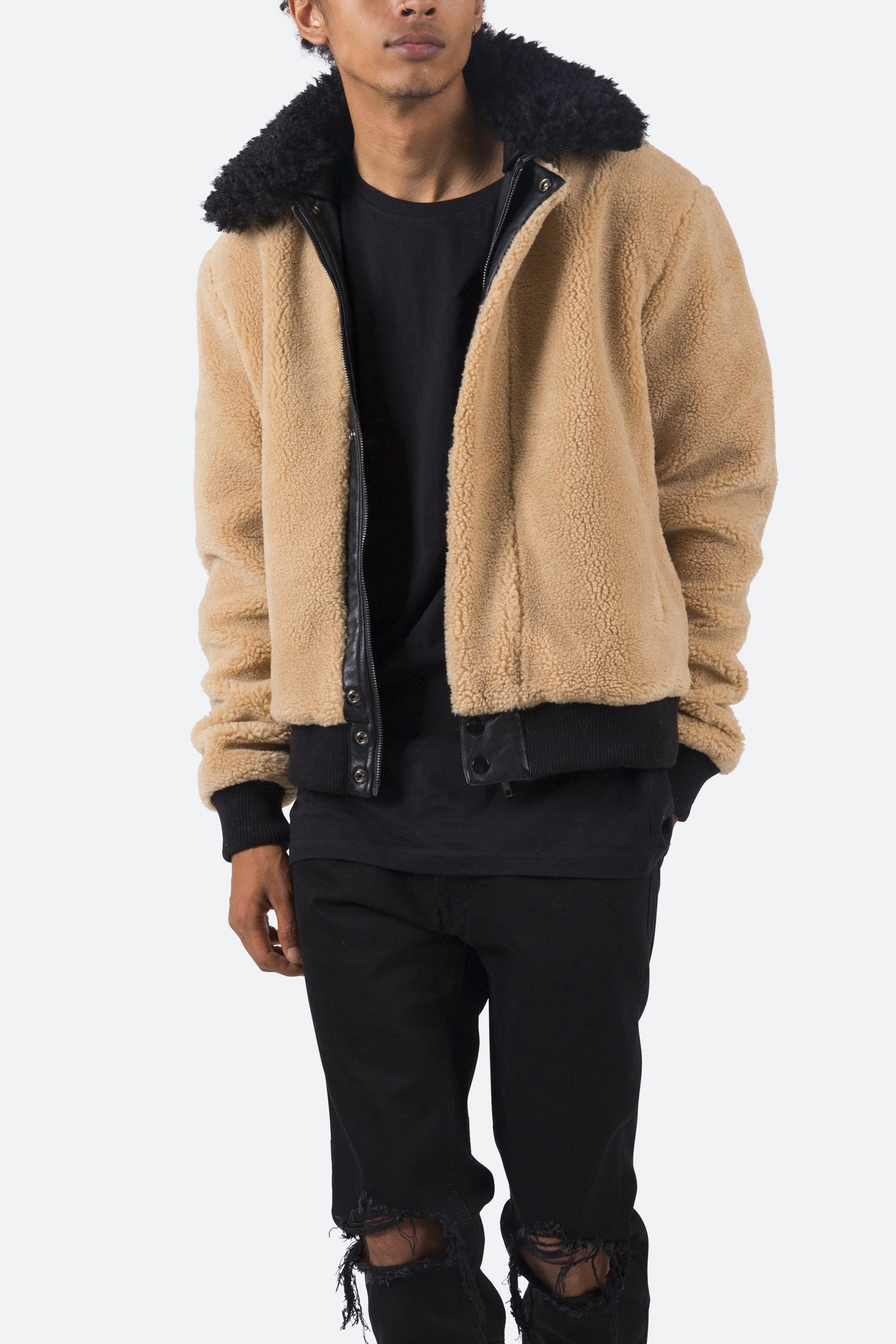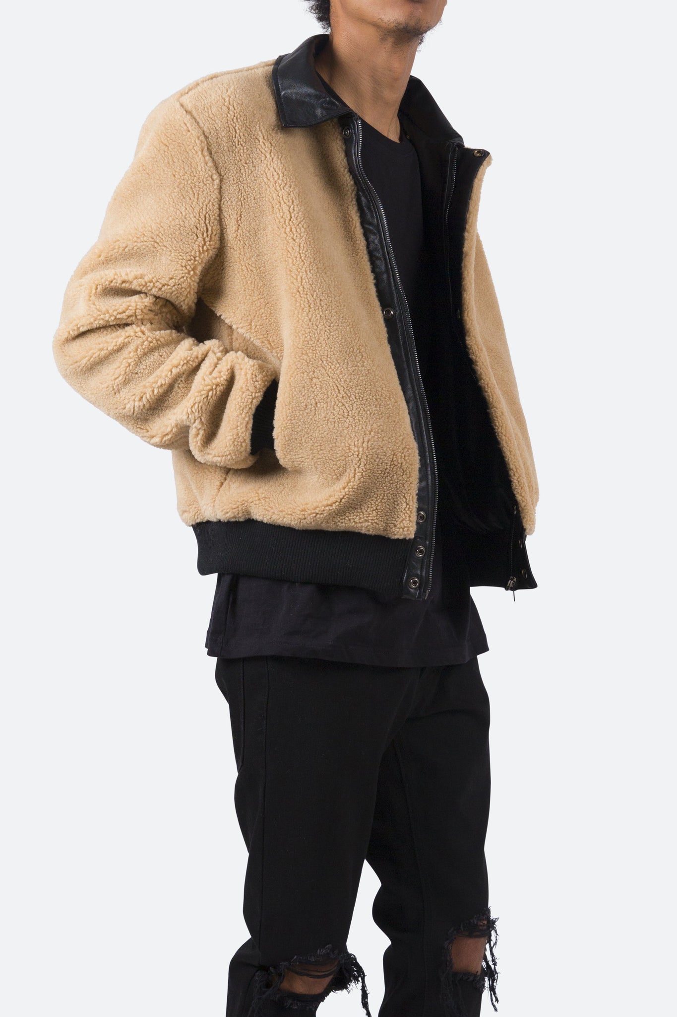 the Sherpa Bomber Jacket is constructed in a standard fit, features zipper closure with poly-leather placket, ribbing at the wrist and waist, and a long-nap faux fur collar that is removable to expose a poly-leather collar.