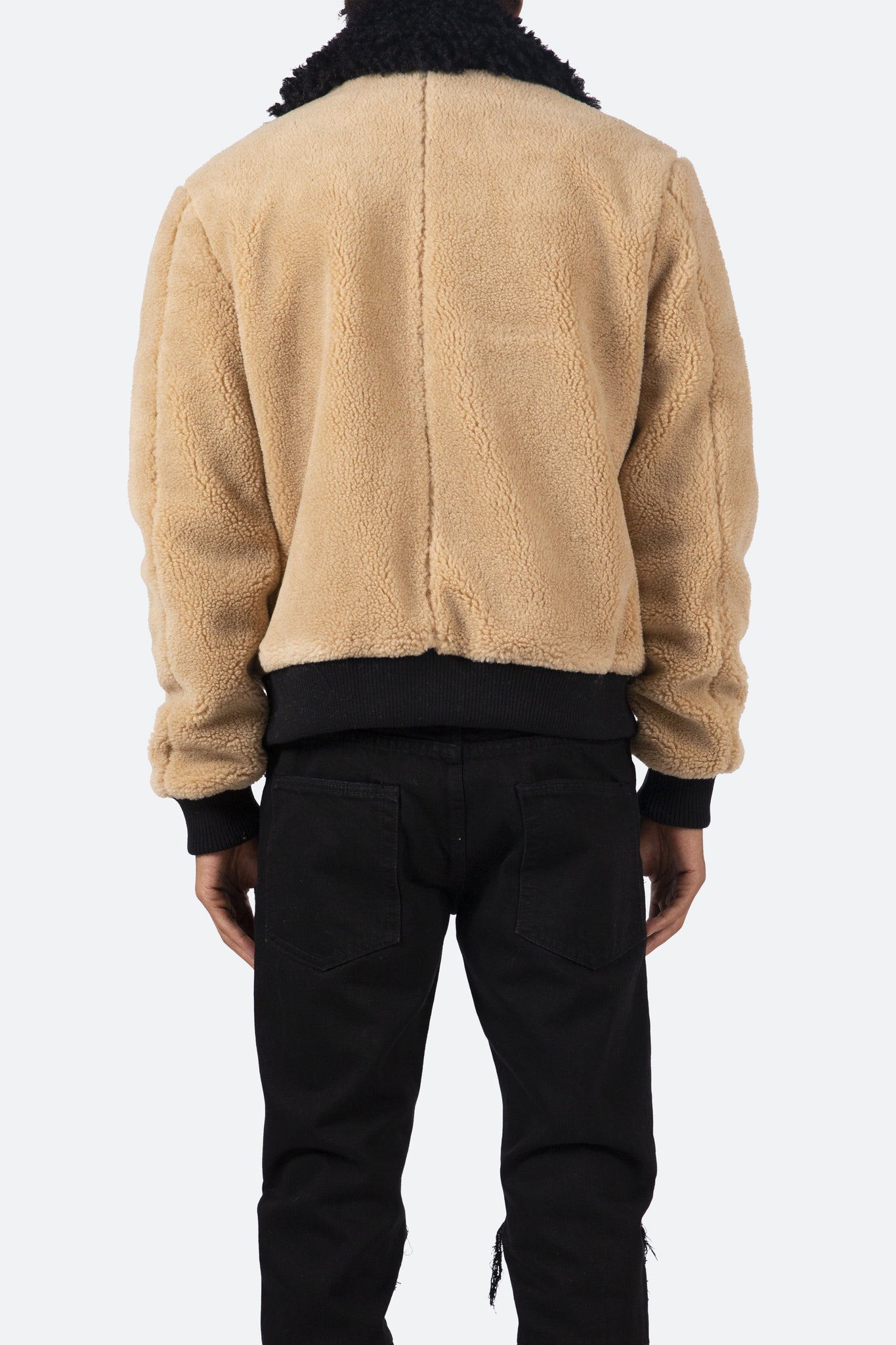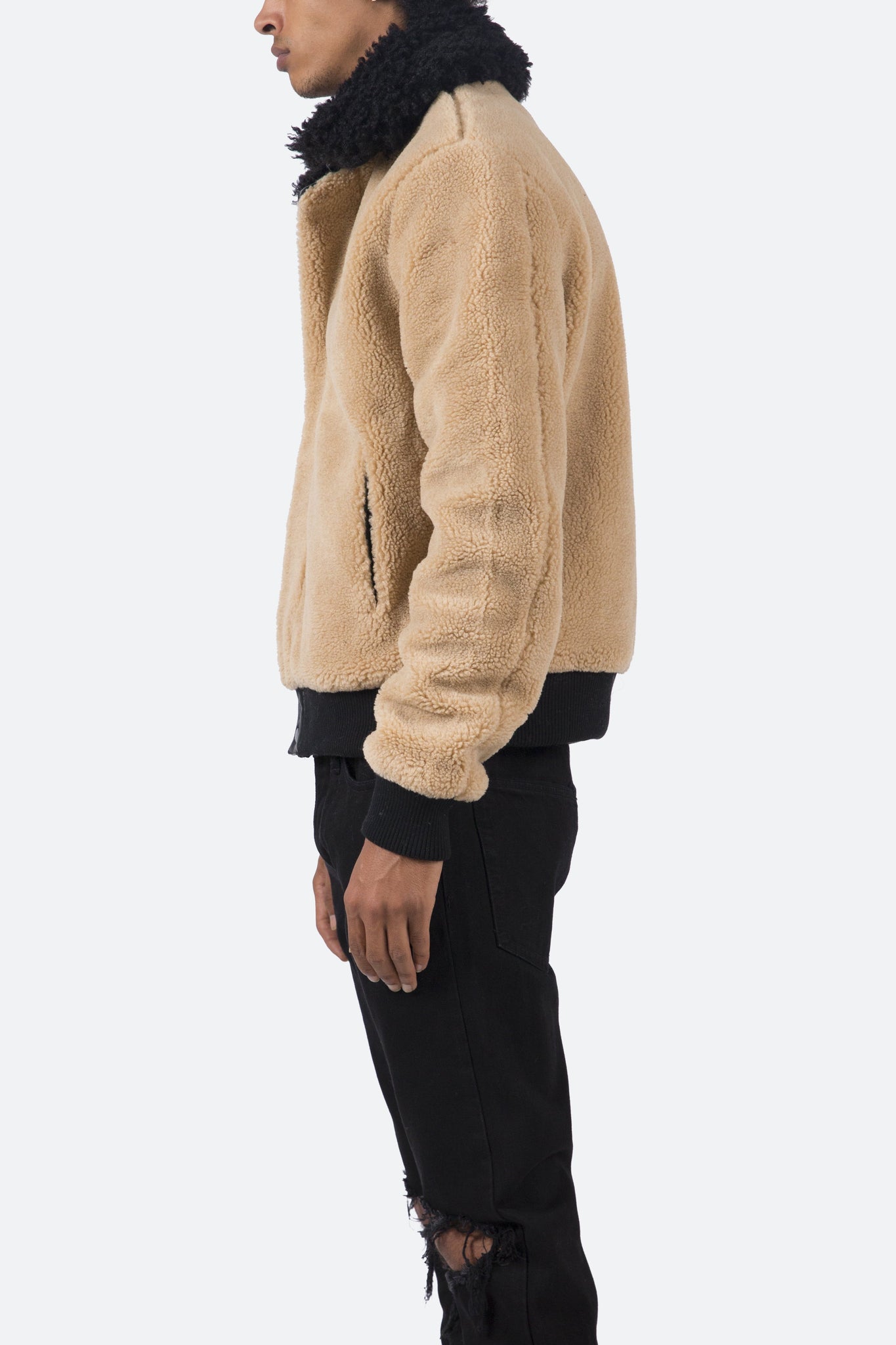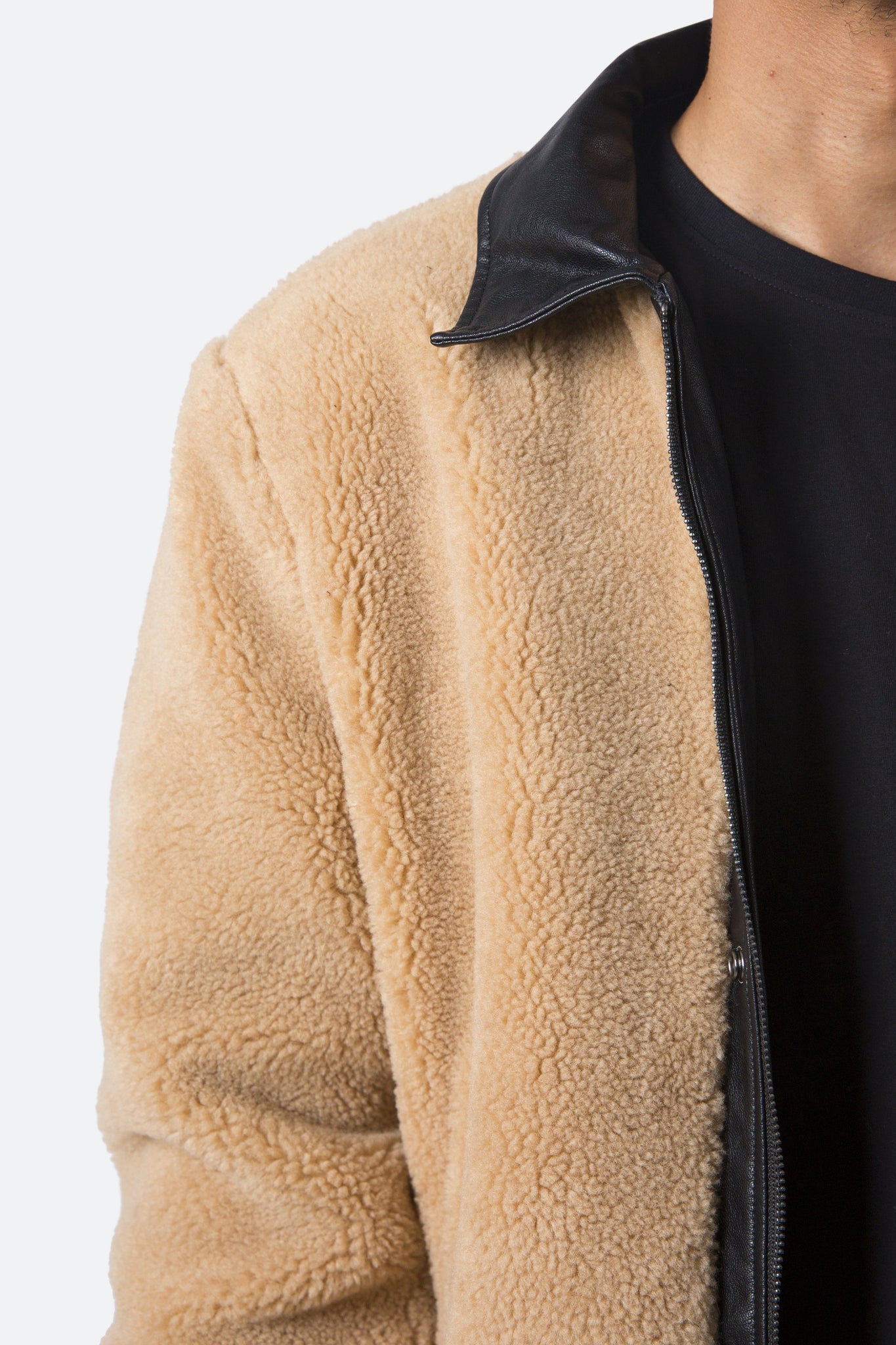 the Sherpa Bomber Jacket is constructed in a standard fit, features zipper closure with poly-leather placket, ribbing at the wrist and waist, and a long-nap faux fur collar that is removable to expose a poly-leather collar.