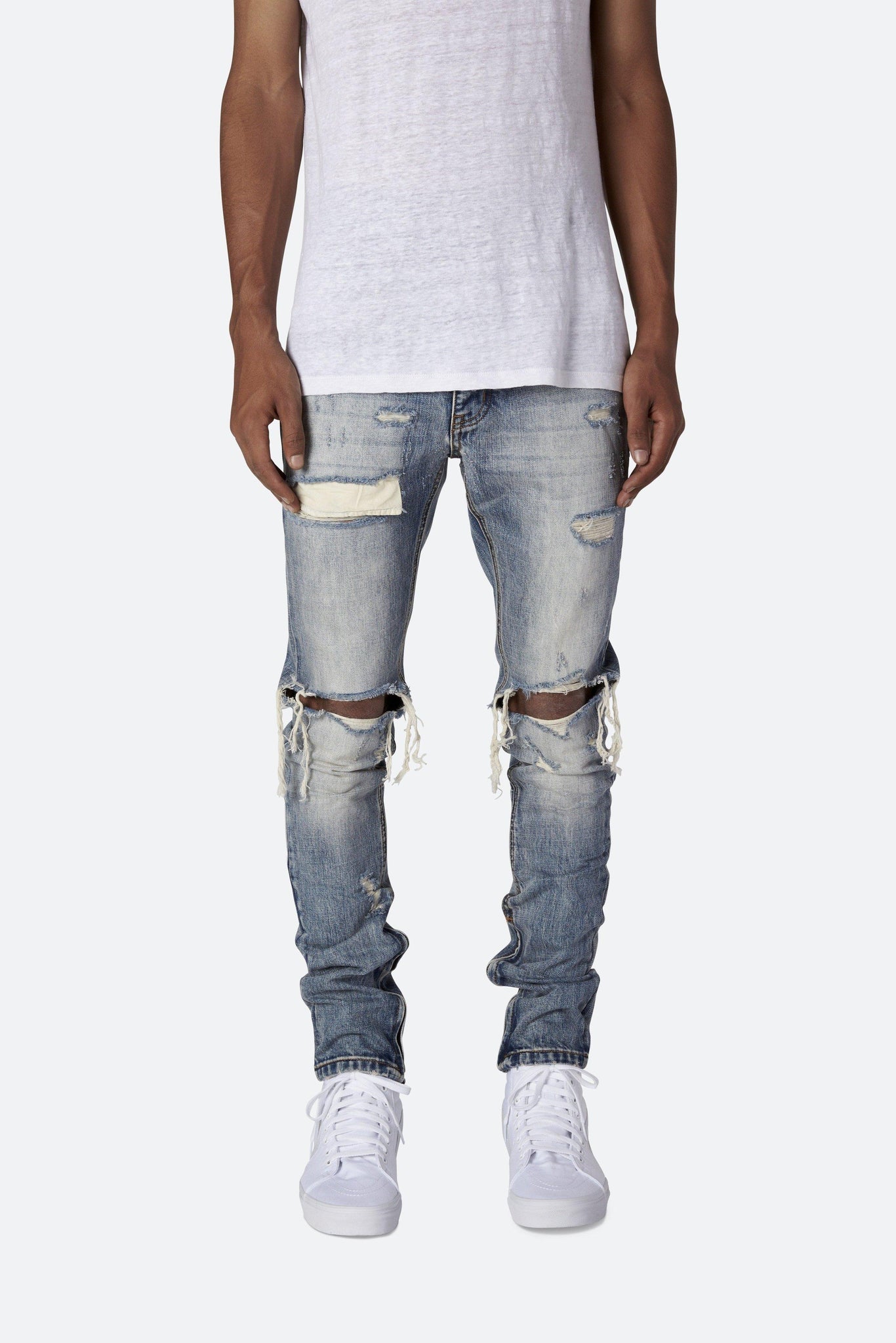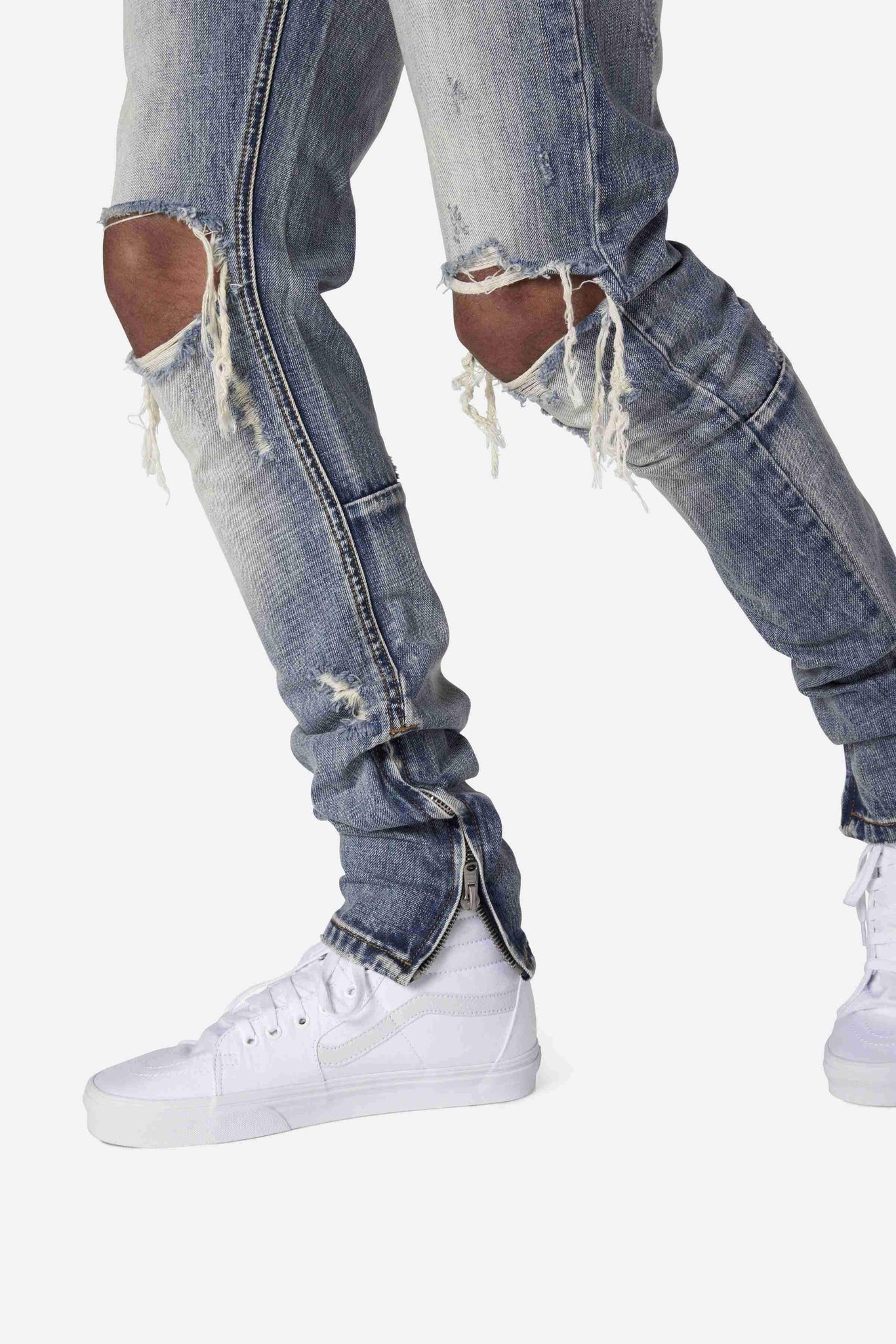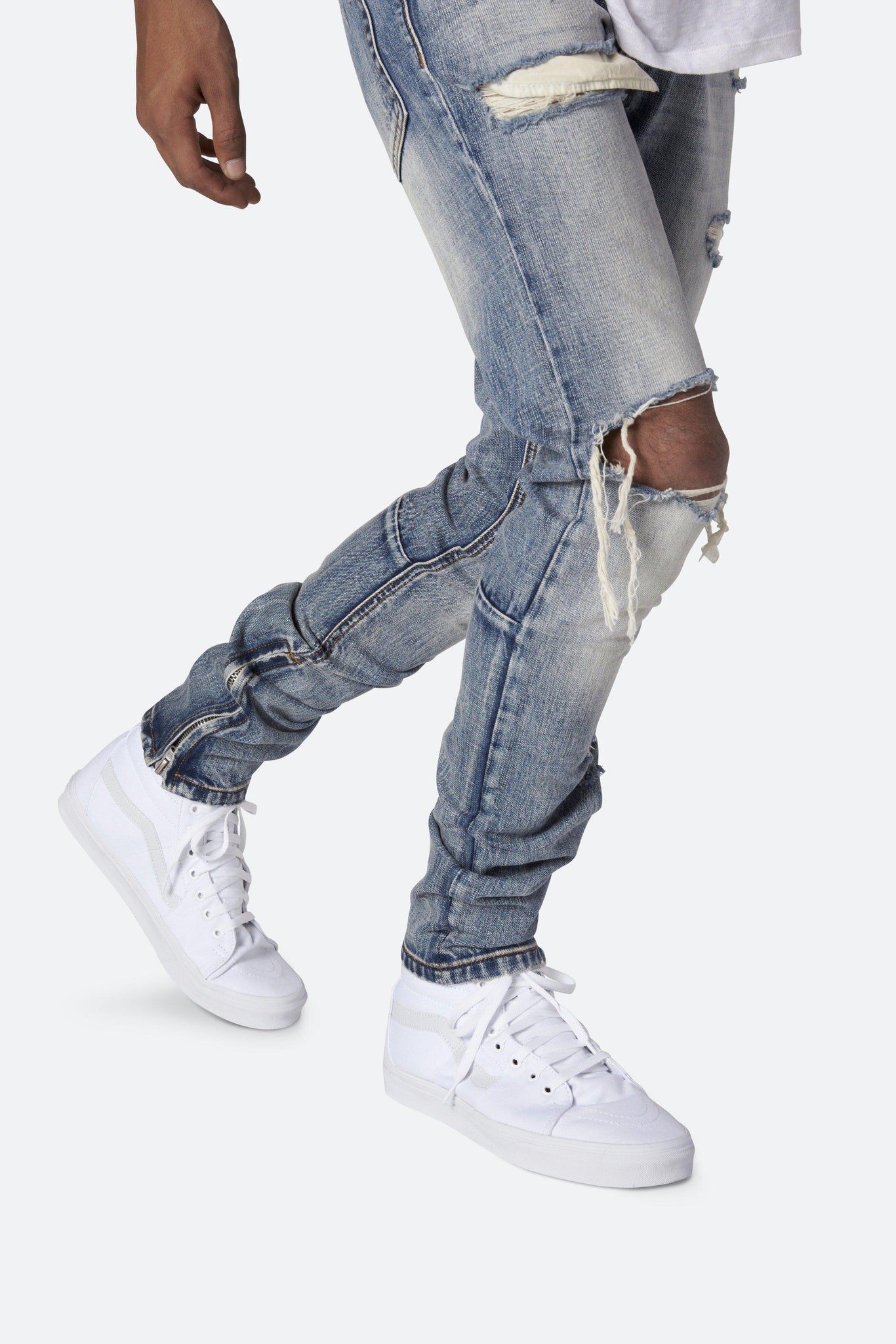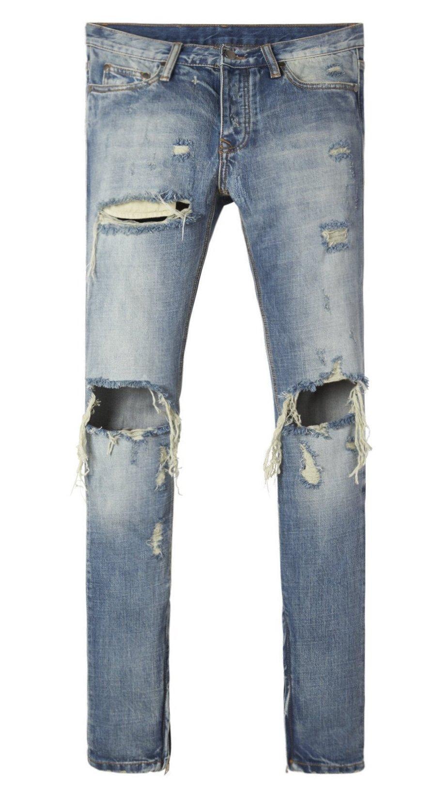 developed in los angeles, the original blue m1 denim is designed with a relaxed fit through the thigh that tapers from the knee to the ankle, featuring distress details at the knee and thigh, finishing off with a 10" concealed zipper on the inseam for a carefully optimized fit.