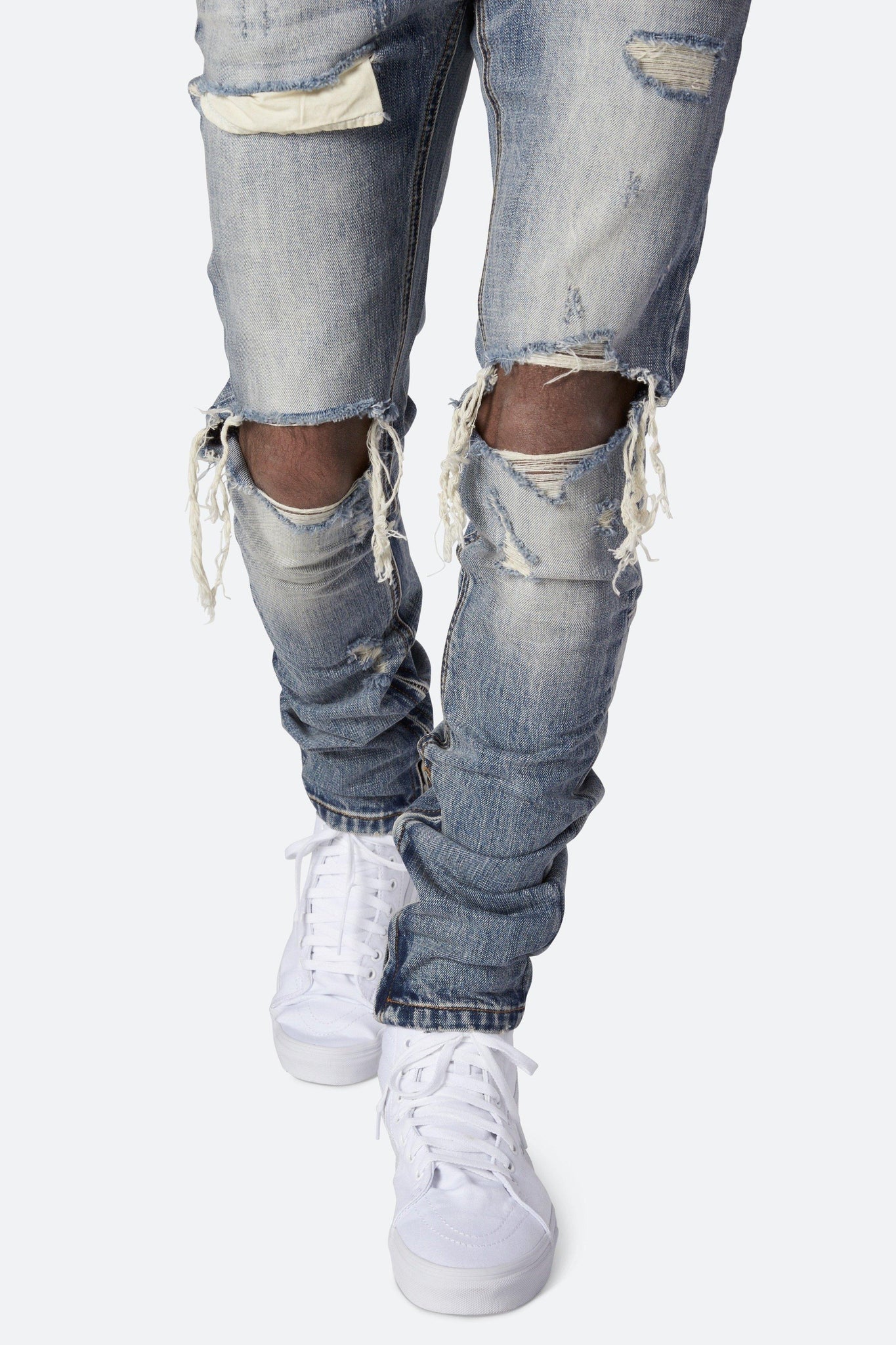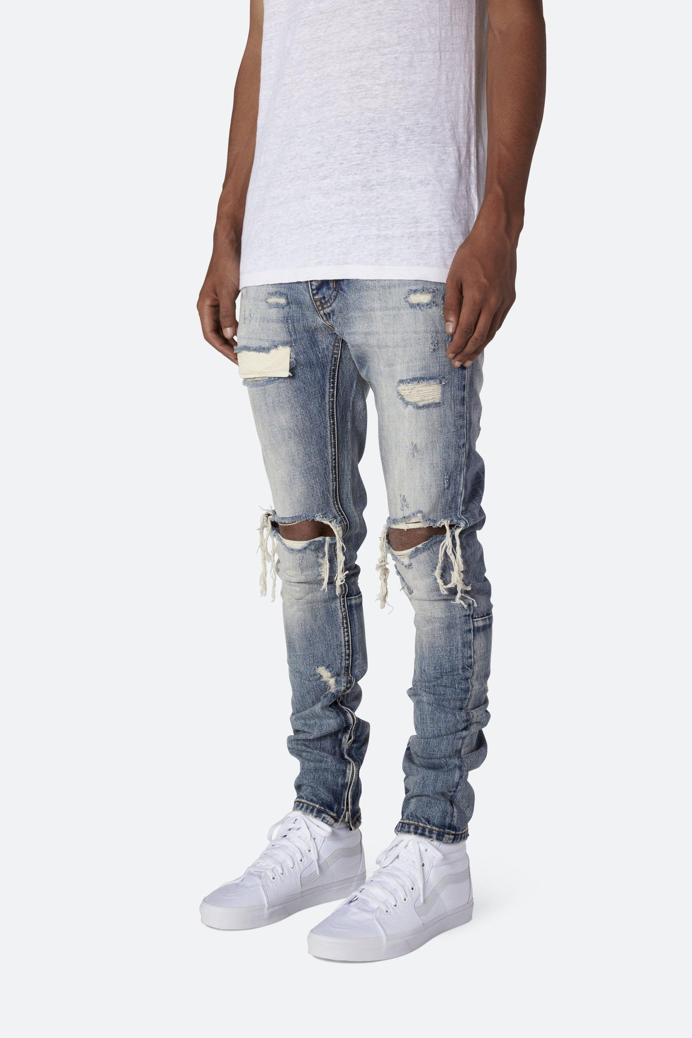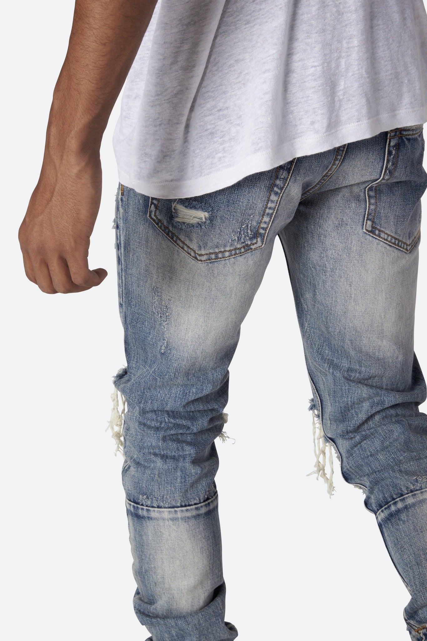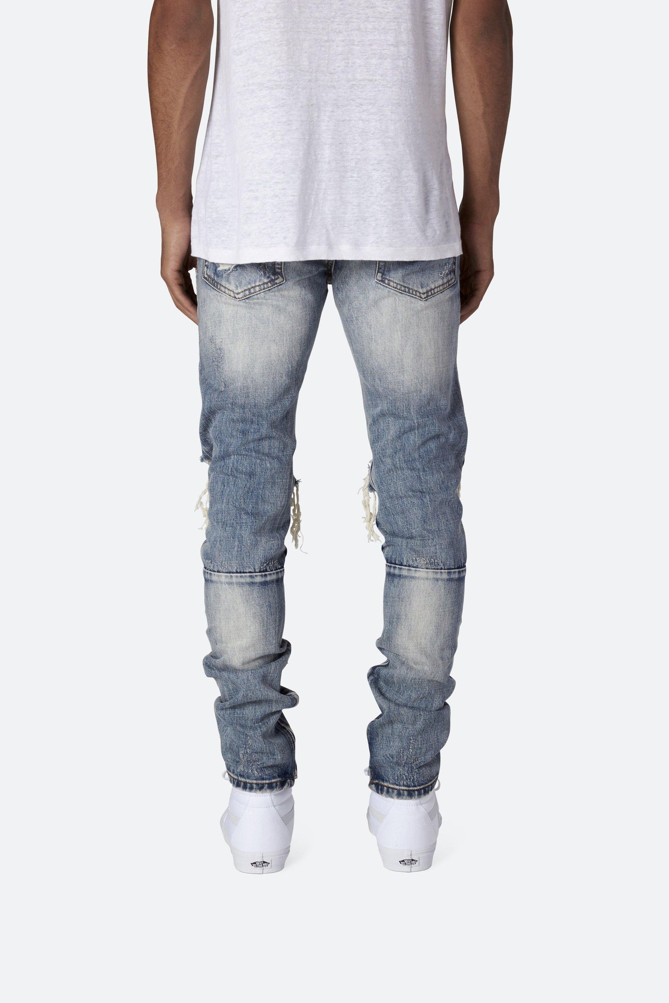 developed in los angeles, the original blue m1 denim is designed with a relaxed fit through the thigh that tapers from the knee to the ankle, featuring distress details at the knee and thigh, finishing off with a 10" concealed zipper on the inseam for a carefully optimized fit.