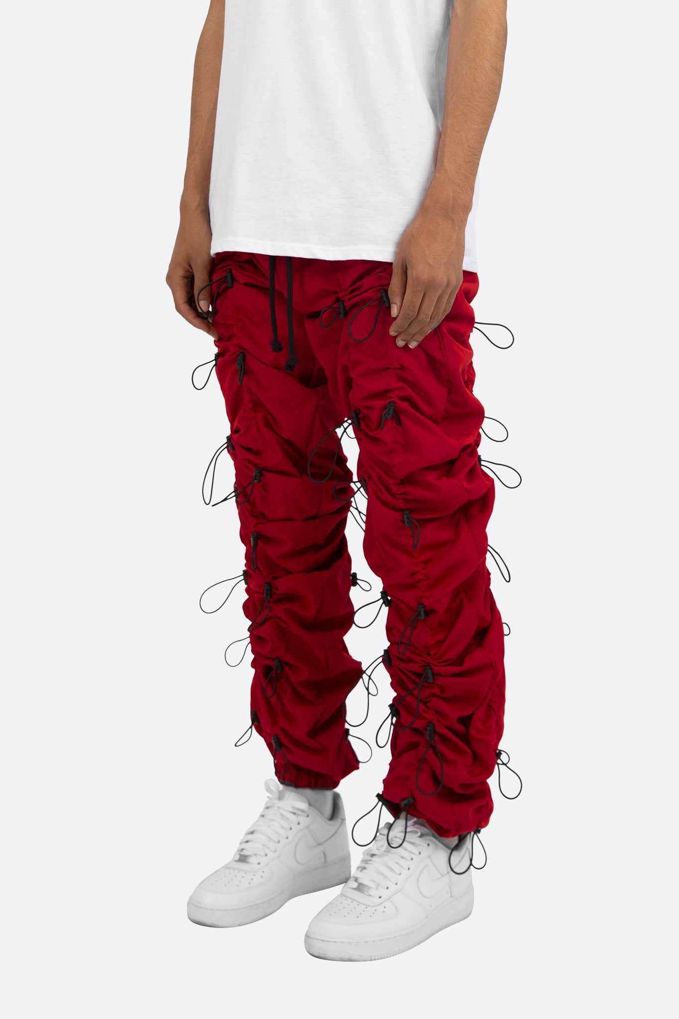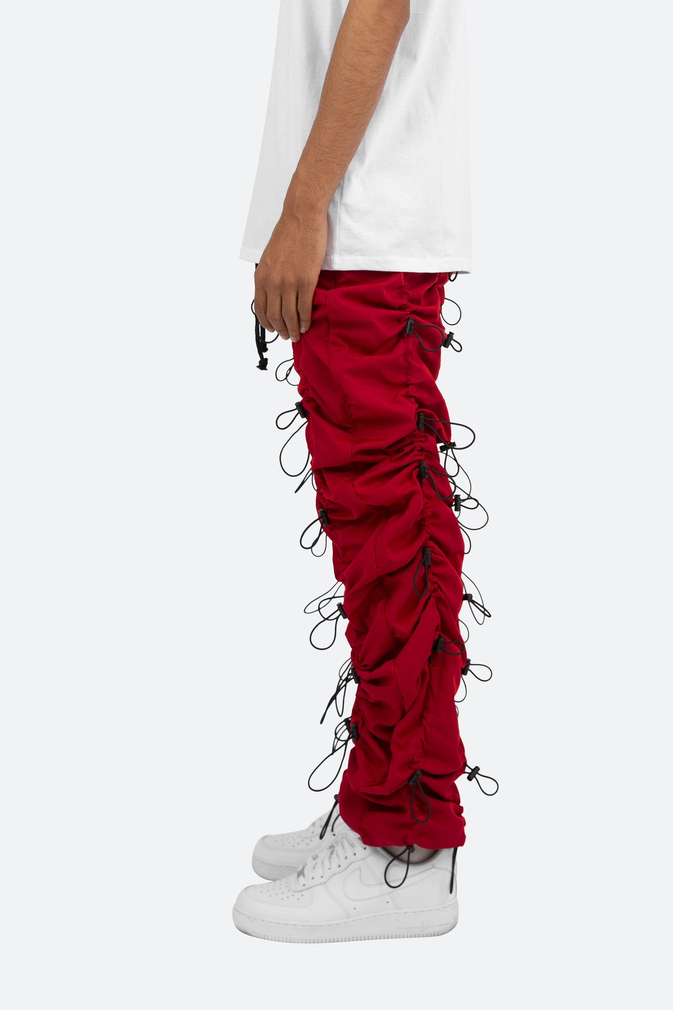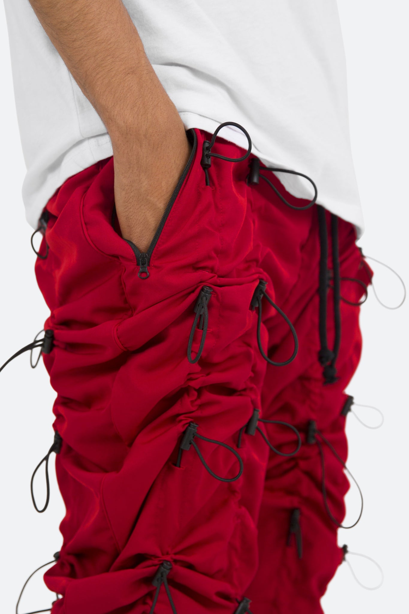 the Bungee Cord Pants are designed with a custom-developed synthetic fabric and feature a mesh lining, zipper pockets at the waist, extended inseam for stacking through-out, and finished with eight bungee cords that run the length of the garment that each have eight black plastic toggles to help with the stacking throughout.