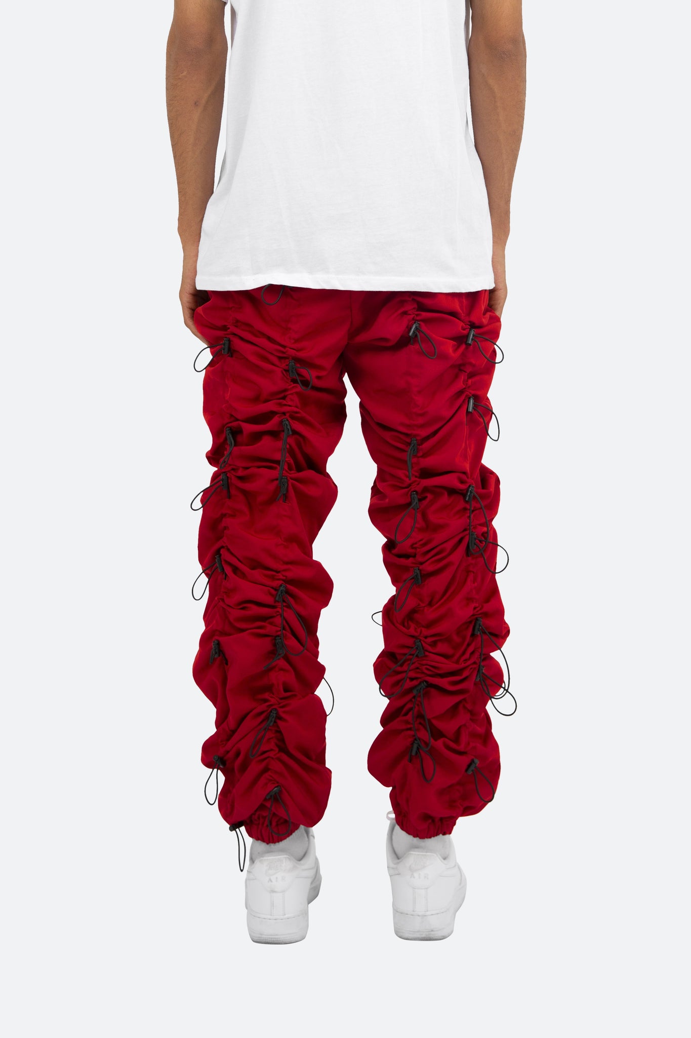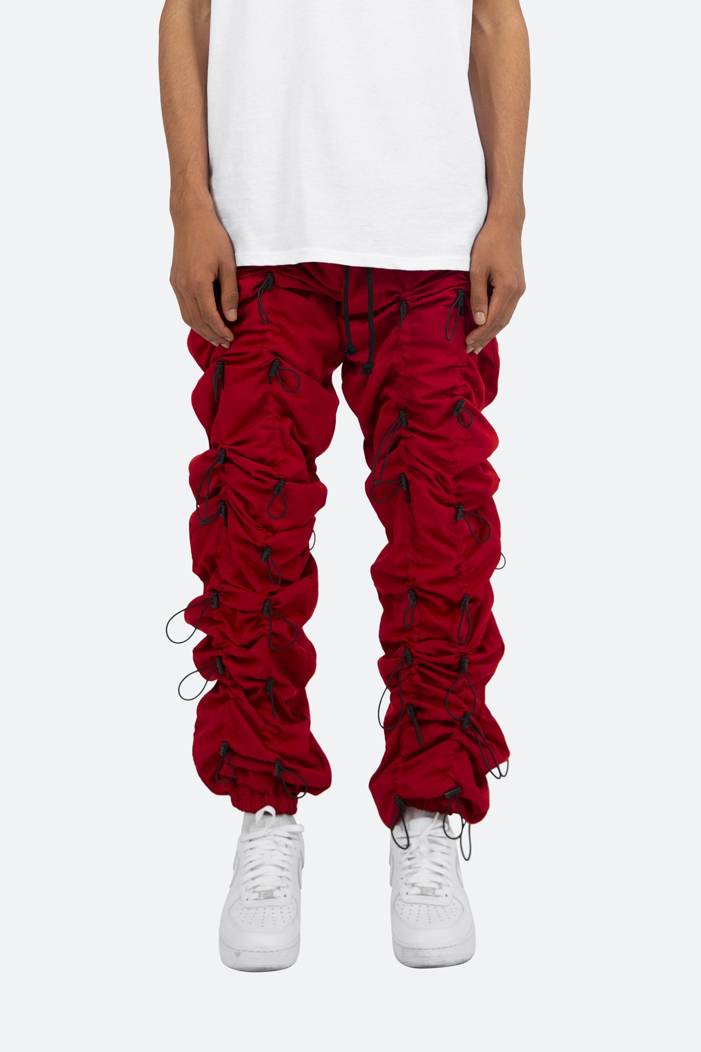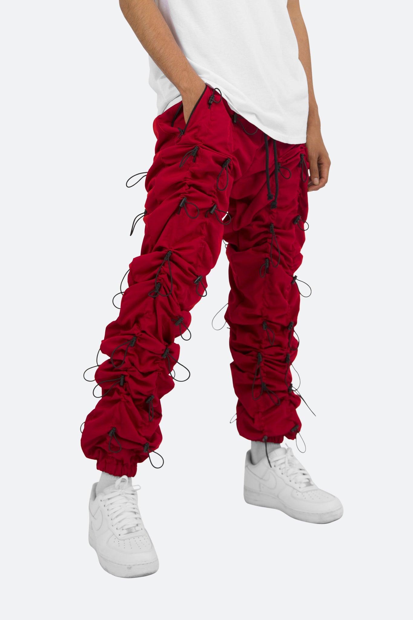 the Bungee Cord Pants are designed with a custom-developed synthetic fabric and feature a mesh lining, zipper pockets at the waist, extended inseam for stacking through-out, and finished with eight bungee cords that run the length of the garment that each have eight black plastic toggles to help with the stacking throughout.