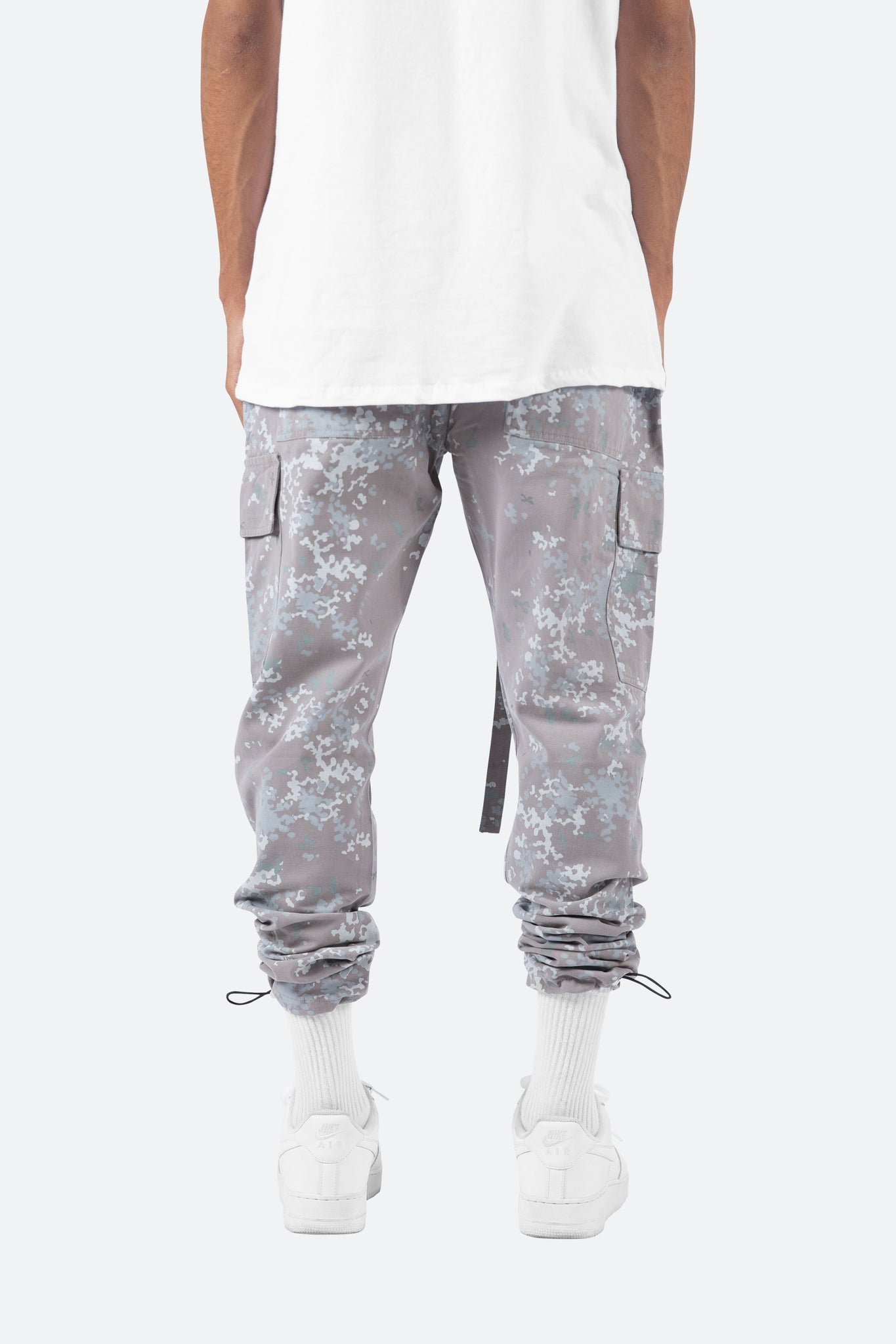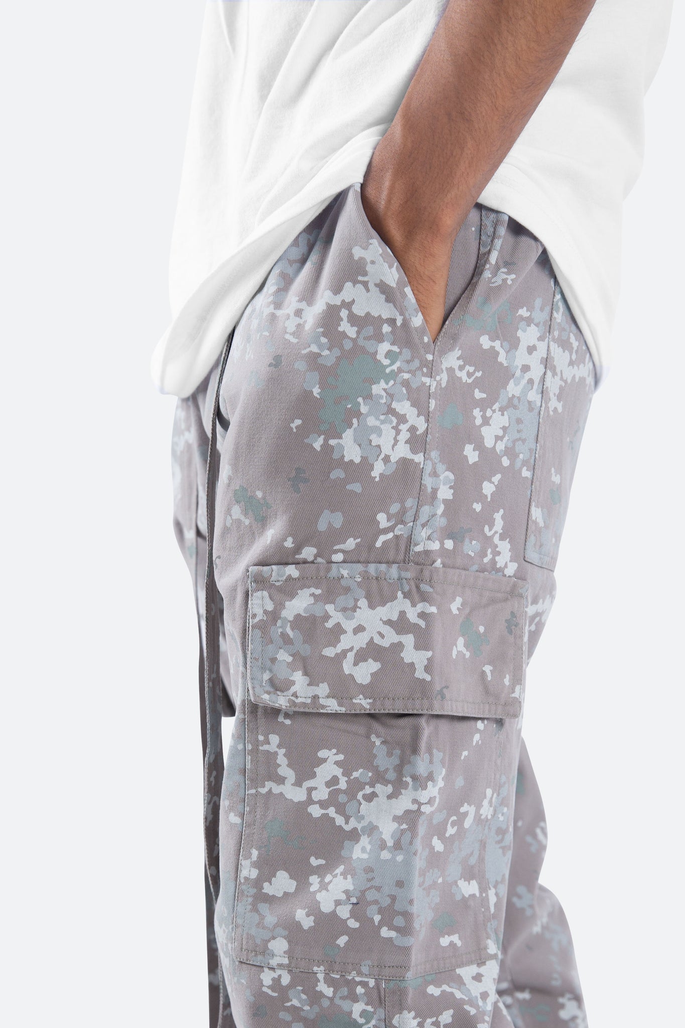 the Cargo Lounge Pants are designed with a baggy, relaxed fit throughout, featuring an elastic waistband, built in belt constructed of self-fabric, cargo pockets at side seam, with elastic cord locks at the leg opening, and finished with a custom camo print.