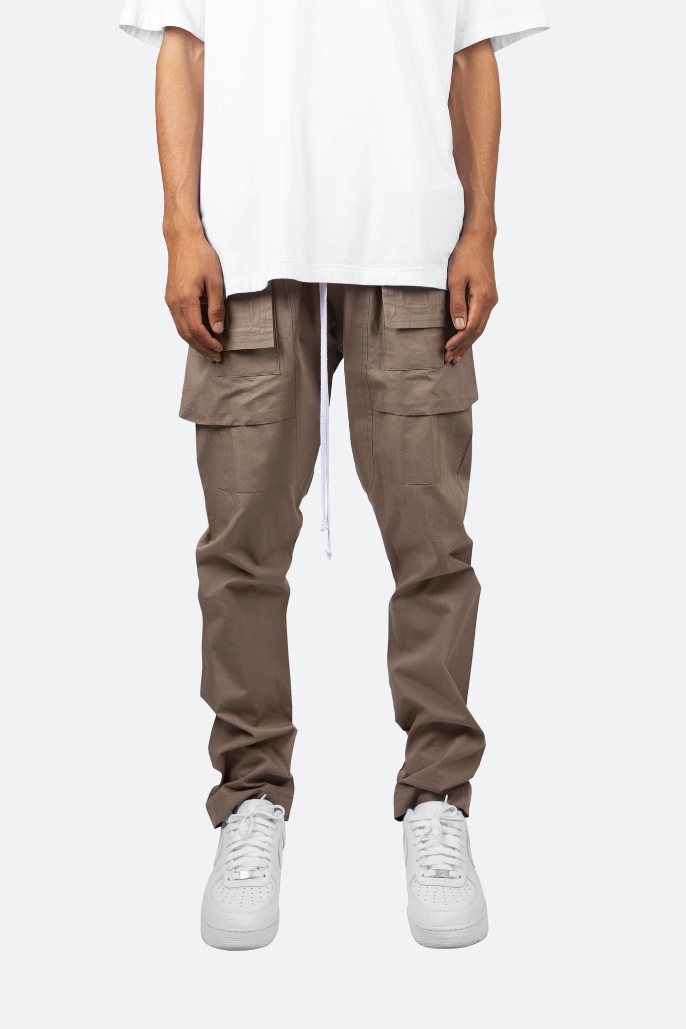 the Drop Crotch Cargo Pants are designed with a relaxed fit throughout and feature a slight drop-crotch, an elasticized self waistband, cargo pockets, and quilted straps that wrap around the upper part of each leg.