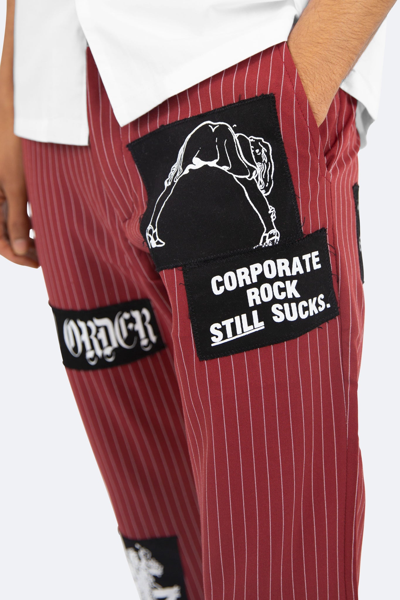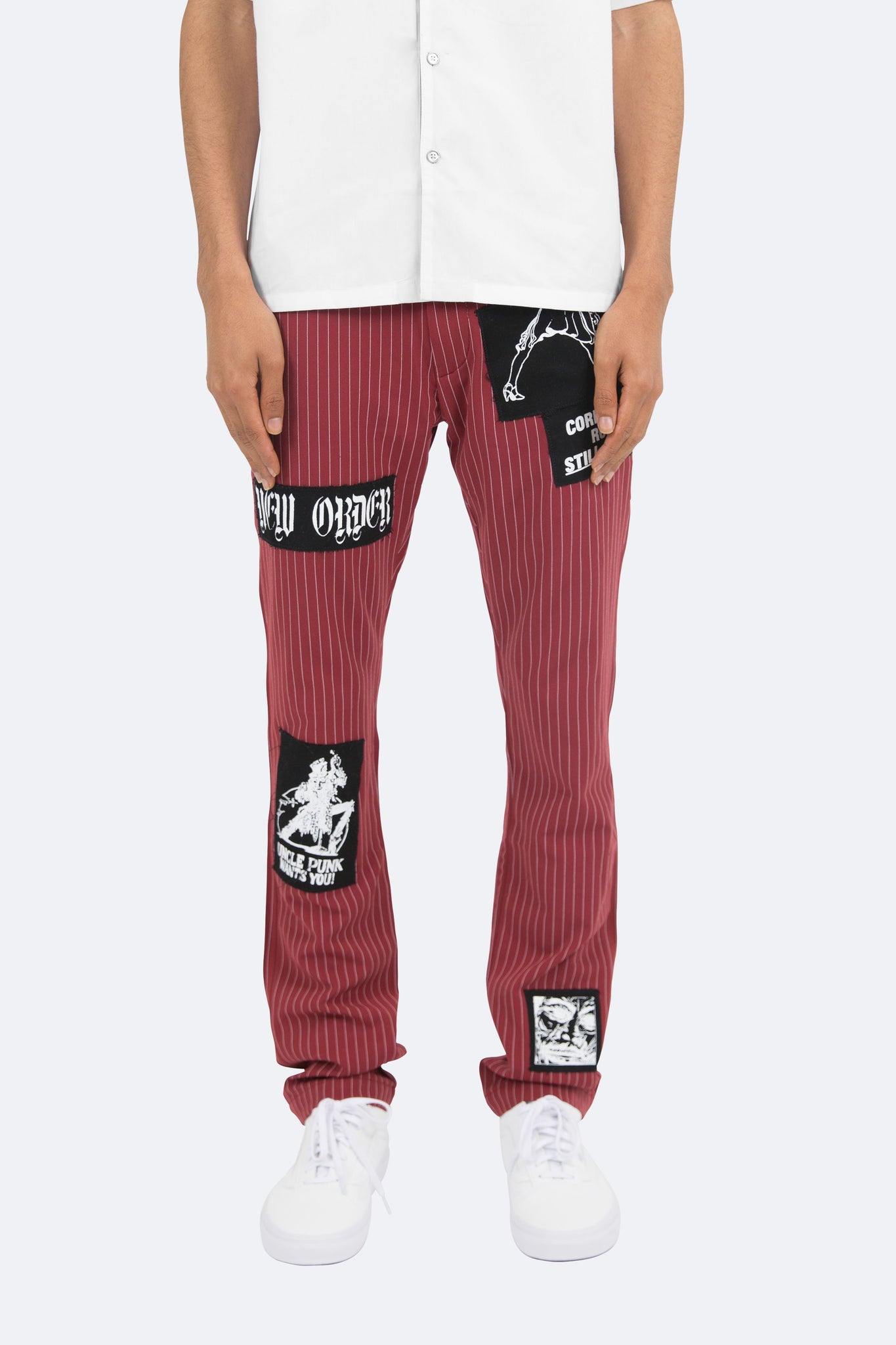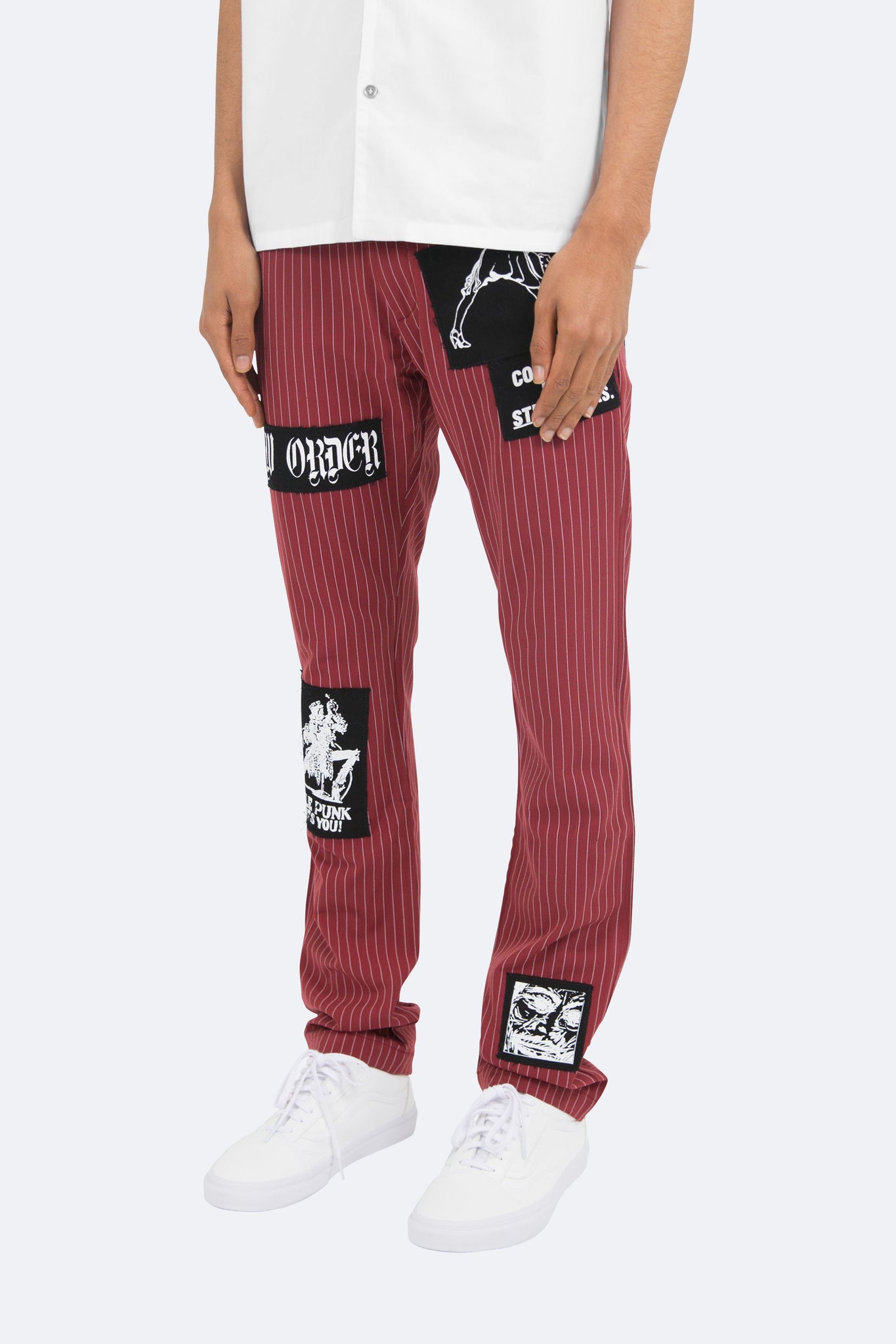 the Patch Striped Pants are designed with a relaxed fit throughout with an extended inseam for stacking, screen printed patches throughout and is finished in a custom striped fabric.
