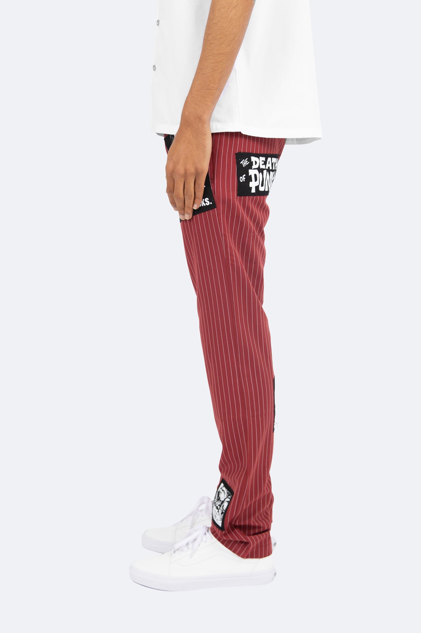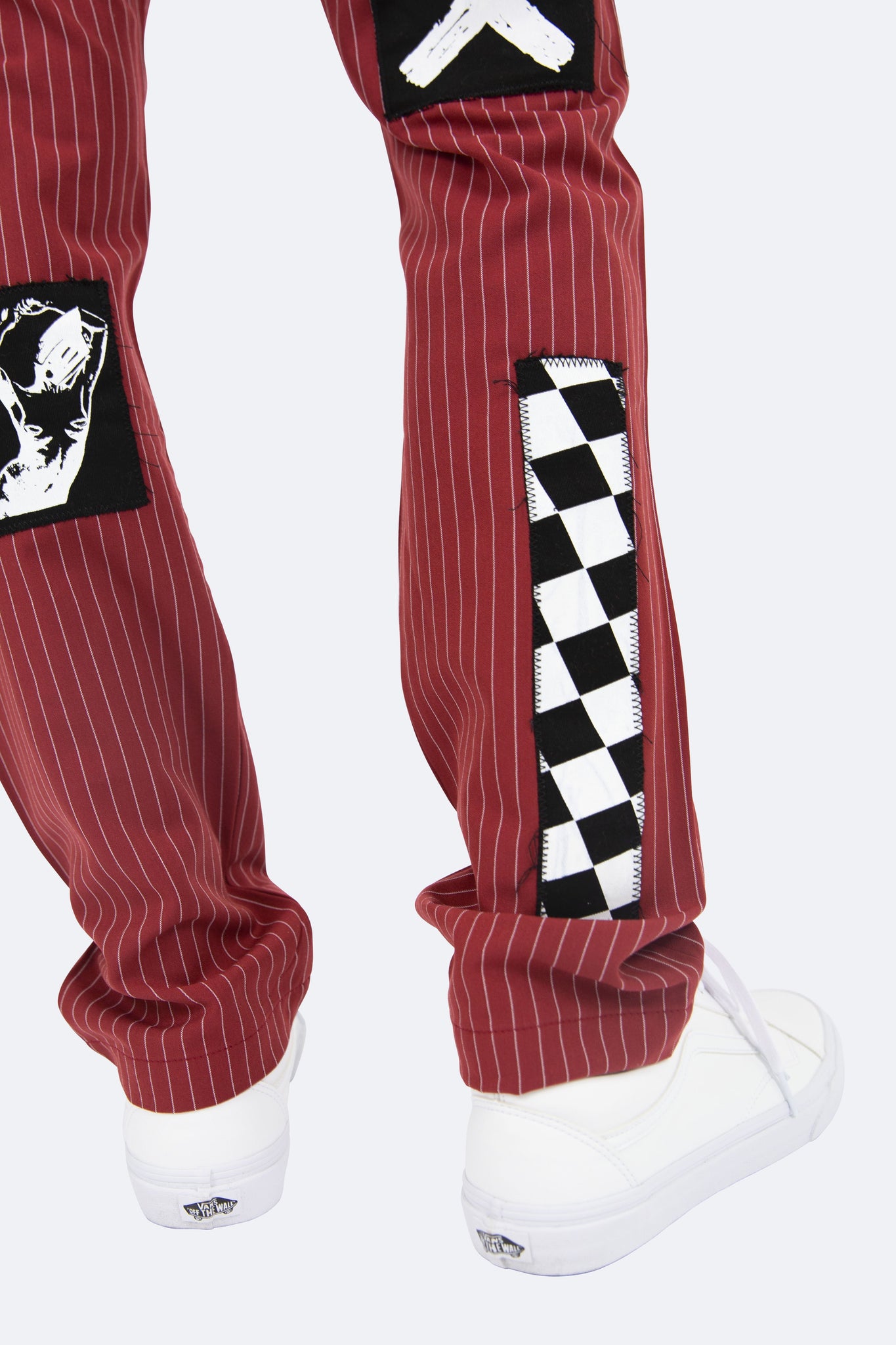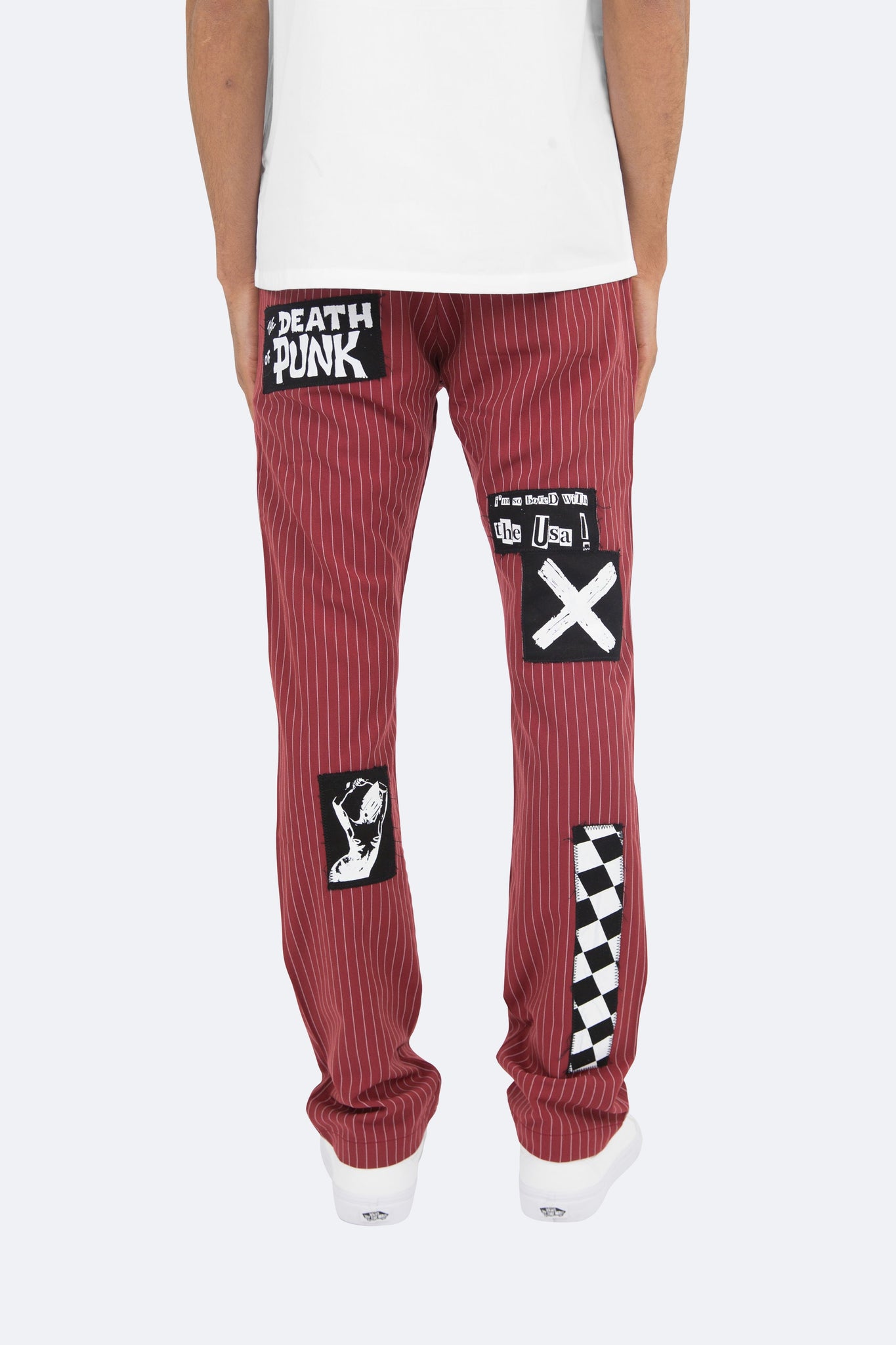 the Patch Striped Pants are designed with a relaxed fit throughout with an extended inseam for stacking, screen printed patches throughout and is finished in a custom striped fabric.