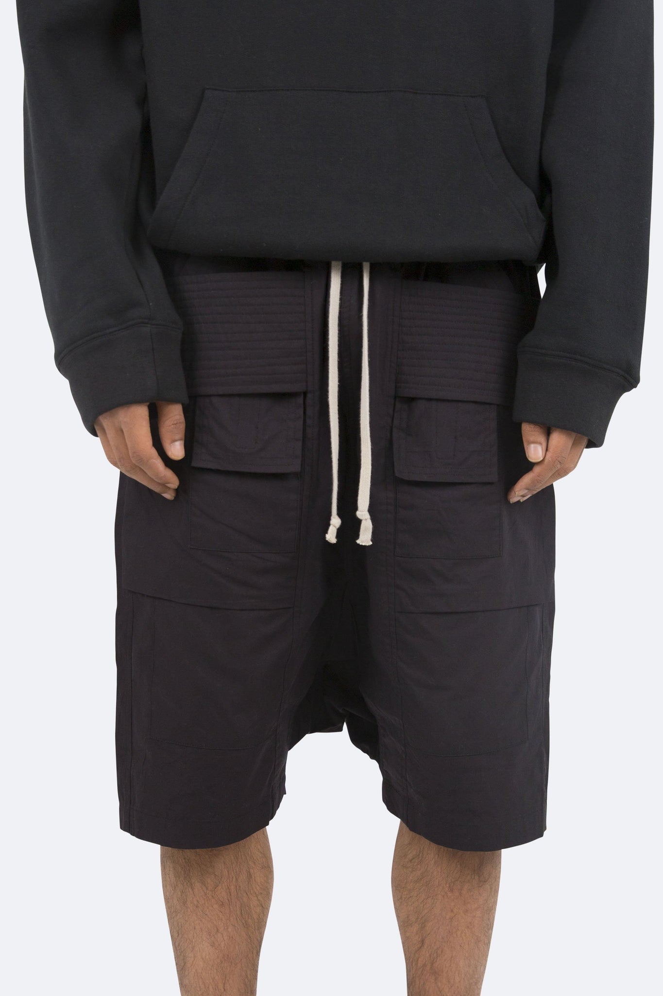 the Drop Crotch Cargo Shorts are designed with a relaxed fit throughout and feature a slight drop-crotch, an elasticized self waistband, cargo pockets, and quilted straps that wrap around the upper part of each leg.